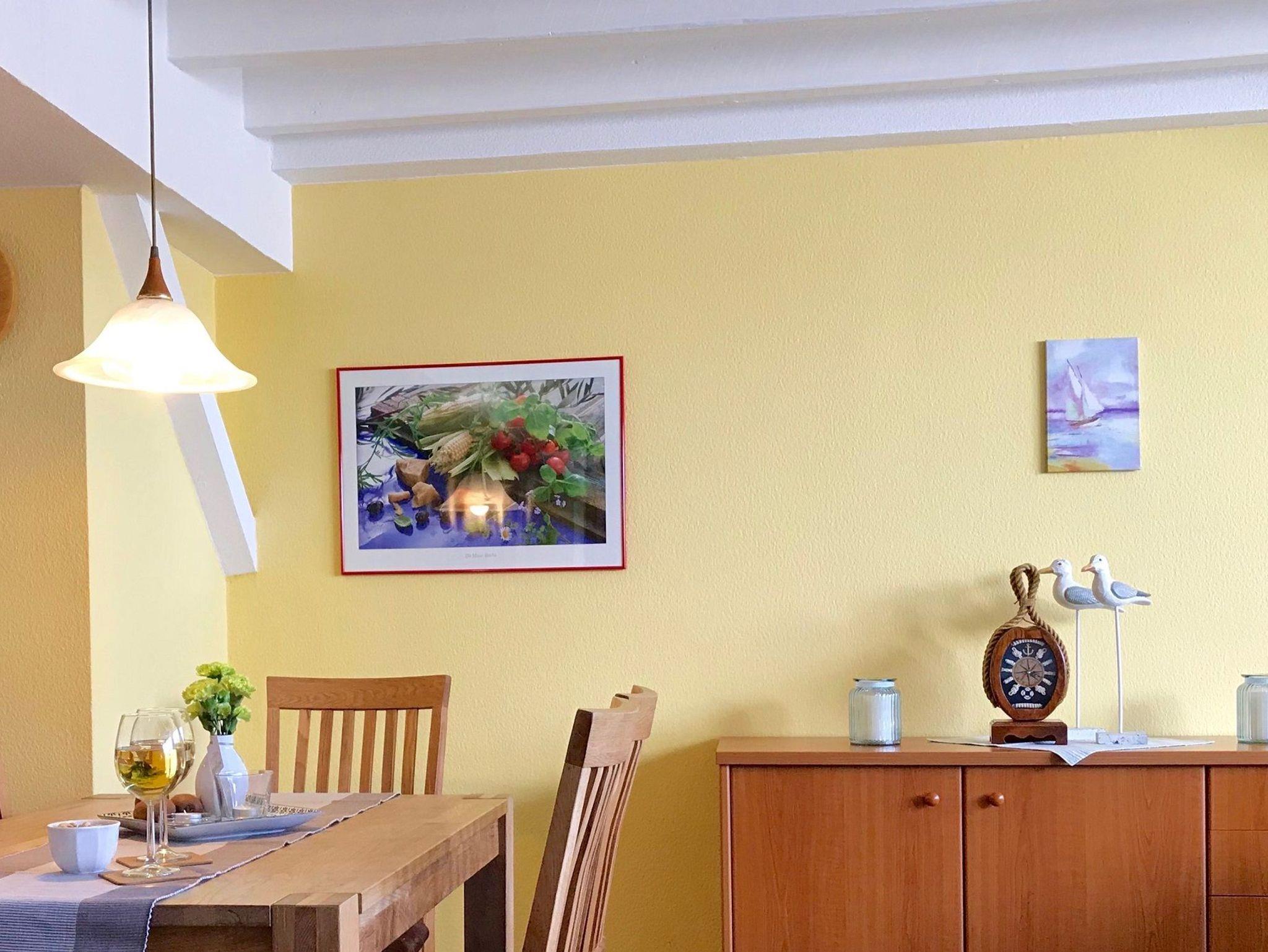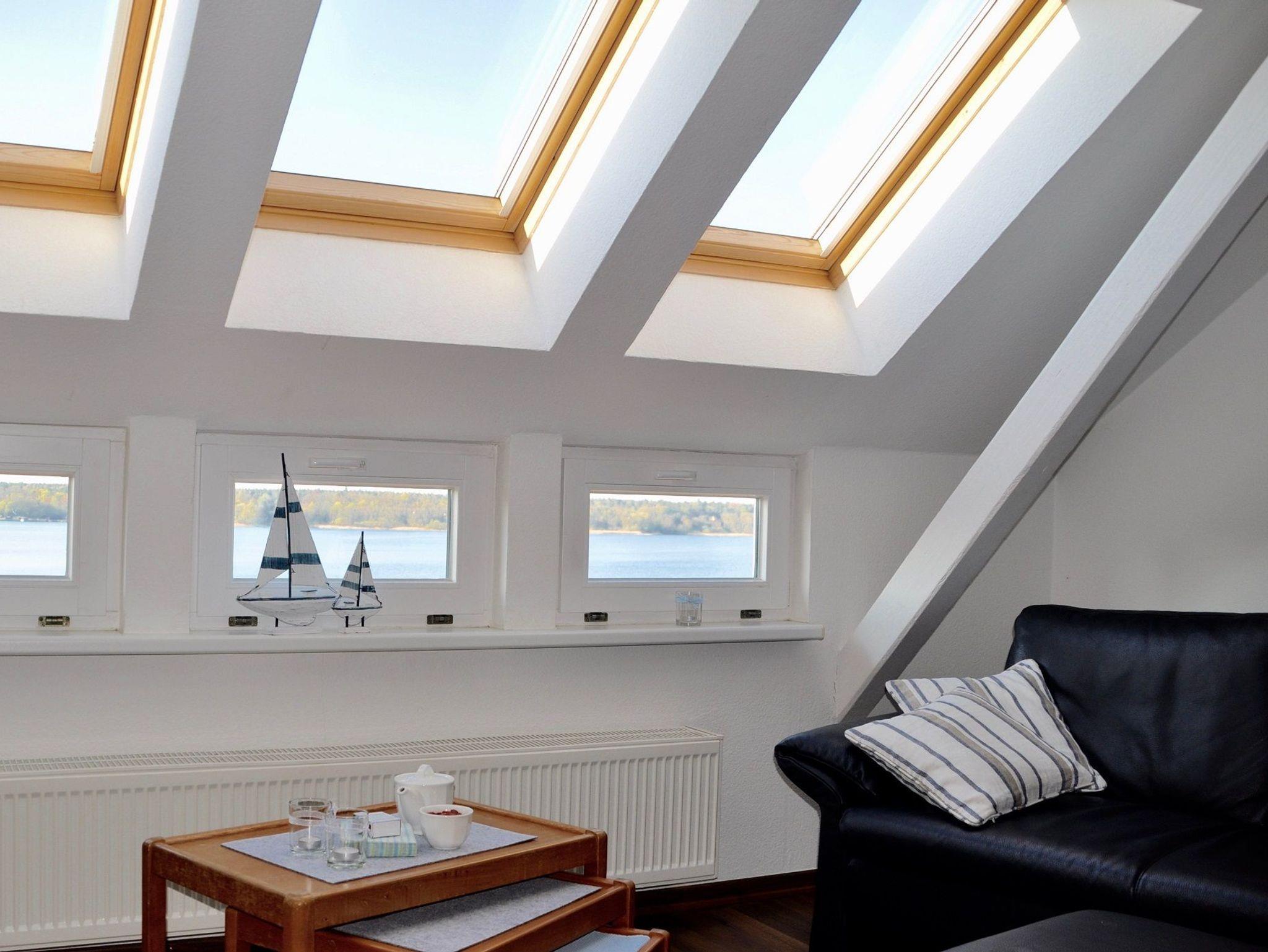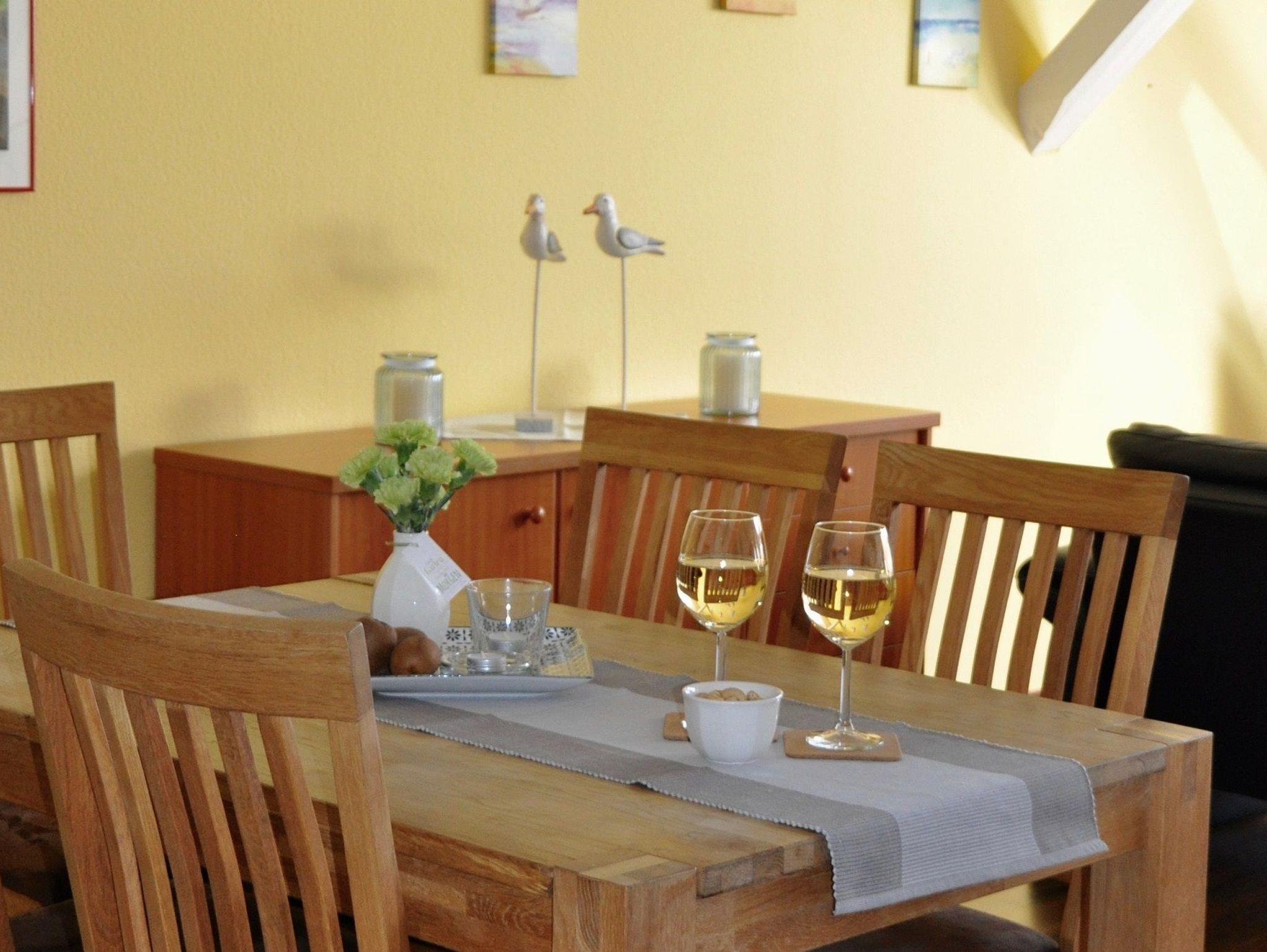 Vier Personen können am großen Esstisch im Küchenbereich platz nehmen. Vom Wohnzimmer und oberen Schlafzimmer haben Sie einen sehr schönen Ausblick auf das Wasser und die Umgebung.