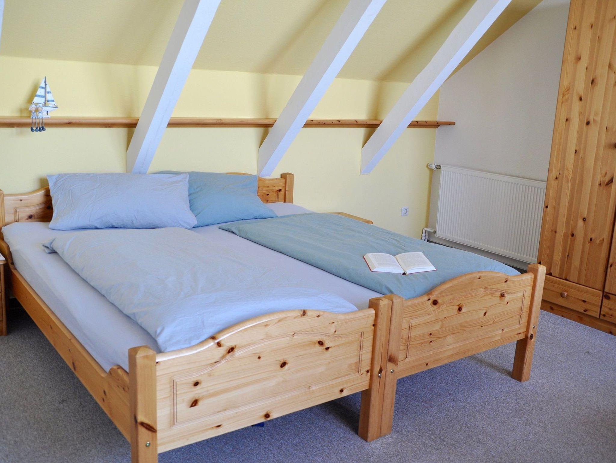 Das Schlafzimmer im oberen Stockwerk verfügt über ein Doppelbett und im Schlafzimmer im Erdgeschoss findet man ein Etagenbett, für die kleinen Gäste sehr geeignet, vor.