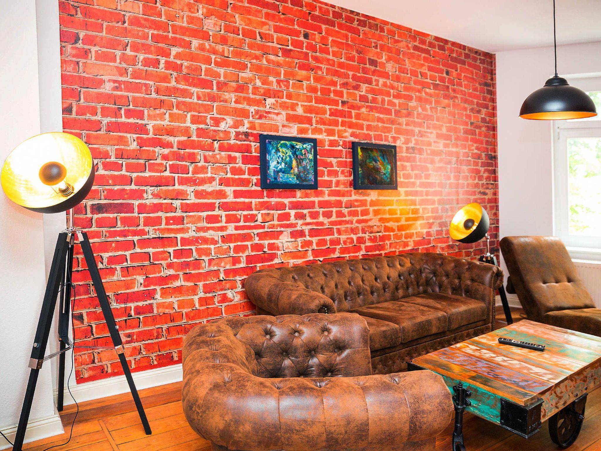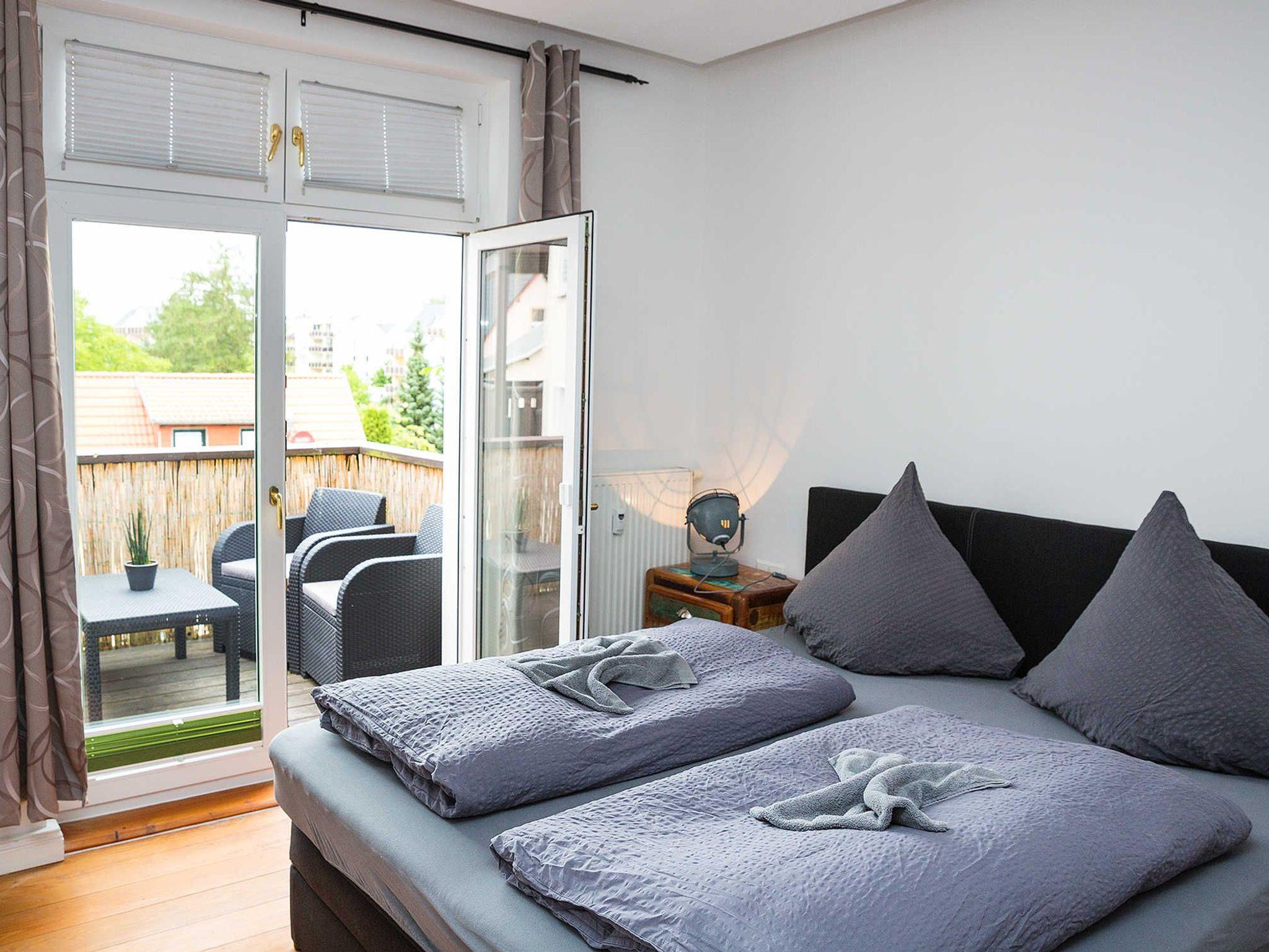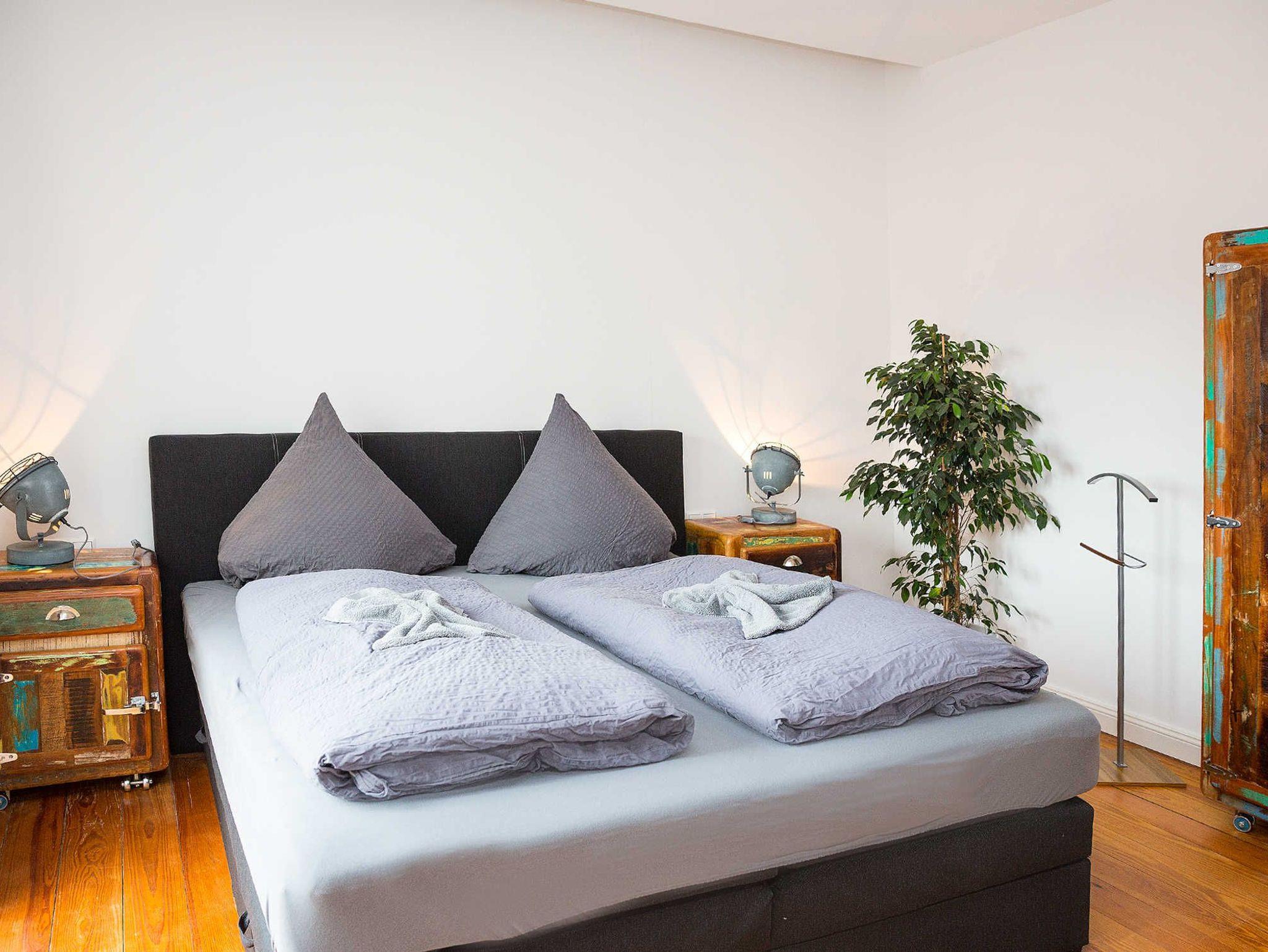 Das anliegende Schlafzimmer bietet einen direkten Zugang zum Balkon. Selbst hier ist die Linie des Einrichters zu erkennen und trotzdem ist mit dem Boxspringbett (180x200) für erholsamen Schalf gesorgt worden. Das Highlight setzt der Schrank bzw. die Nachttischschränke die mit einem Materialmix aus Eisen und Altholz an ein Designloft erinnern. Perfekt darauf abgestimmt sind auch die dazugehörigen Nachttischlampen, die an Beleuchtungen eines Filmsets erinnern.