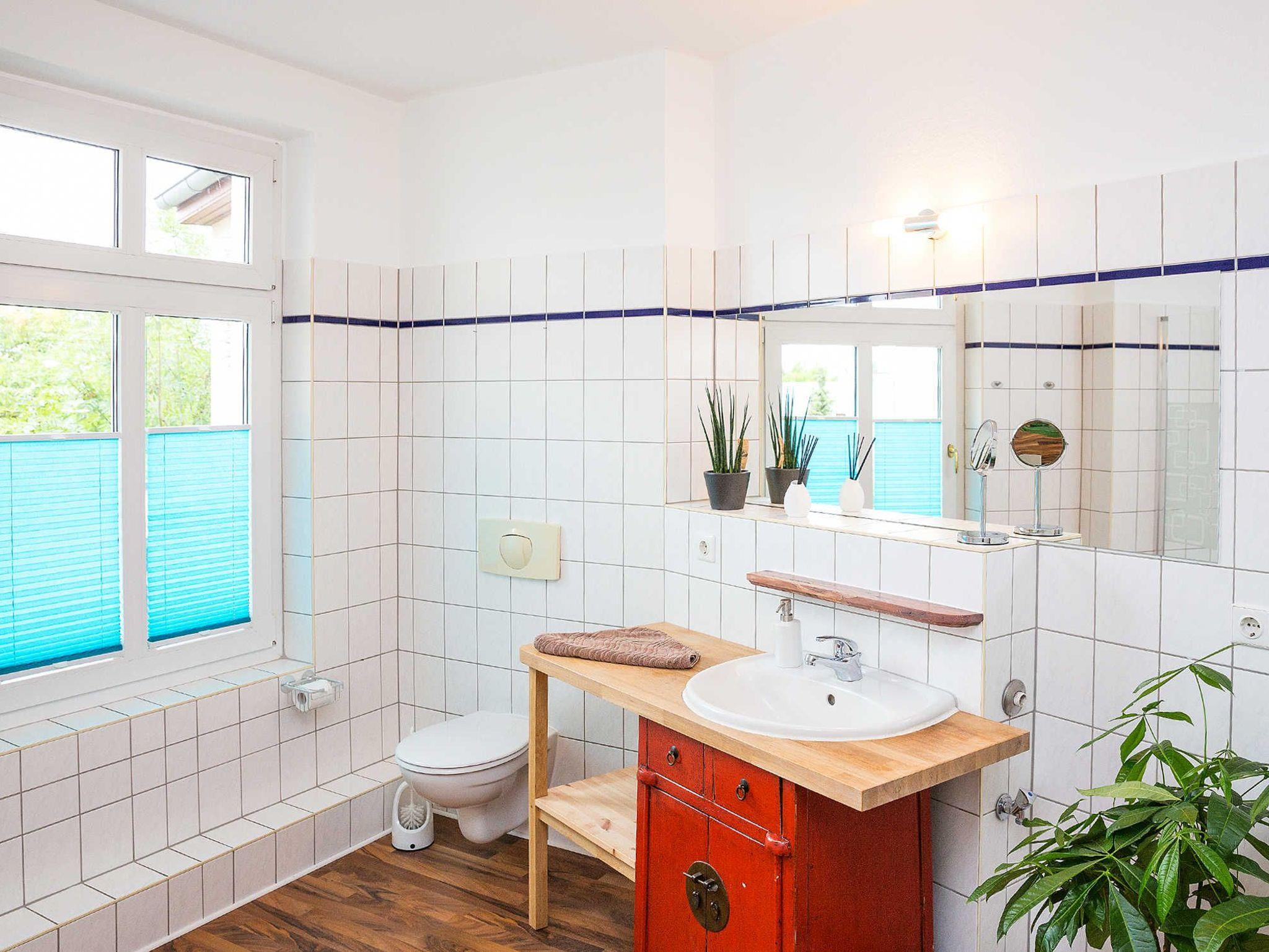 Links, die erste Tür gibt einen Einblick in das schöne und grosse Wannenbad mit Tageslicht.