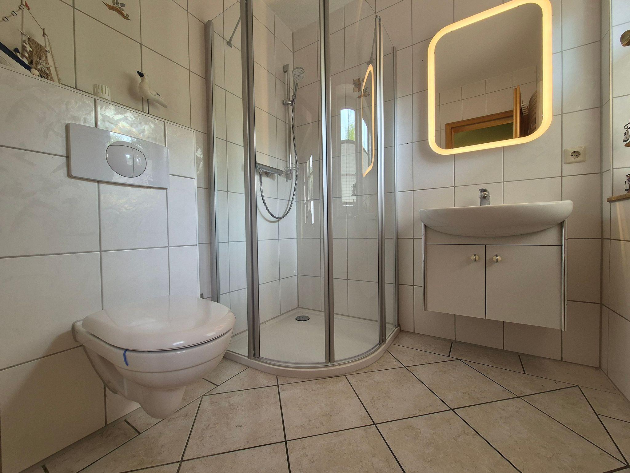 Ein Badezimmer mit barrierearmer Dusche, Wand-WC und einem Waschtisch mit Unterschrank ergänzt das Erdgeschoss und sorgt für zusätzlichen Komfort.