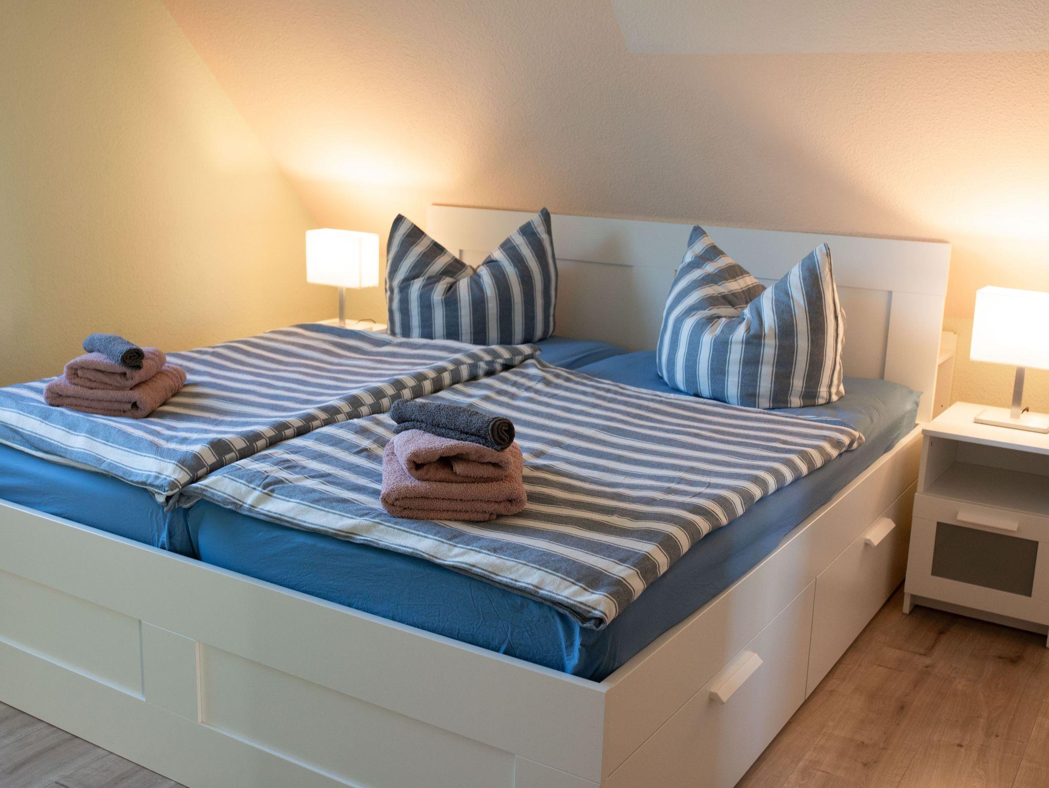 • Ein Schlafzimmer mit zwei Einzelbetten, die bei Bedarf zu einem Doppelbett zusammengeschoben werden können