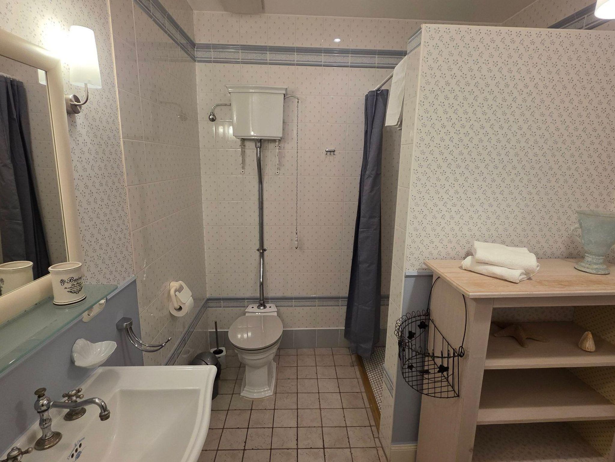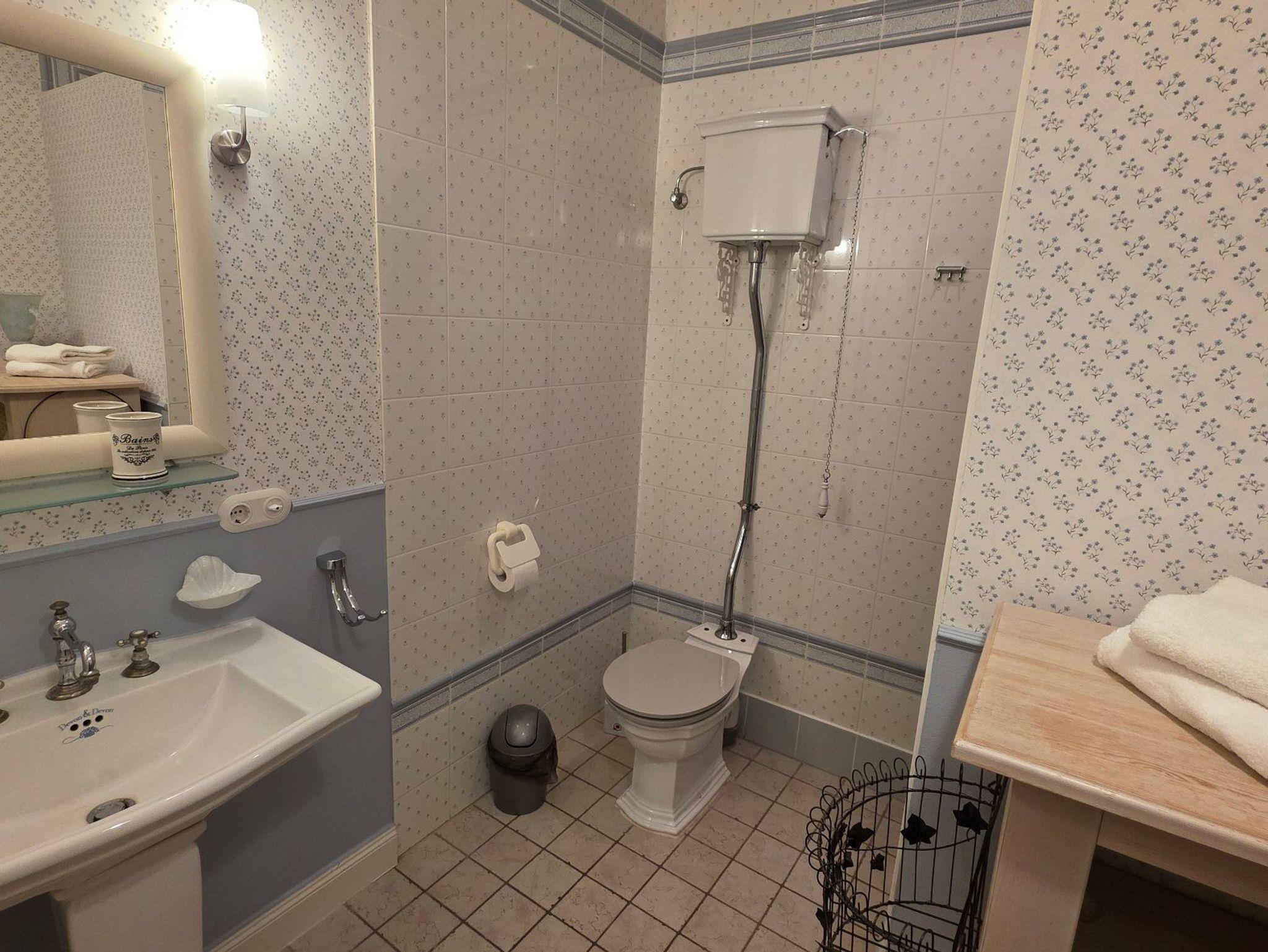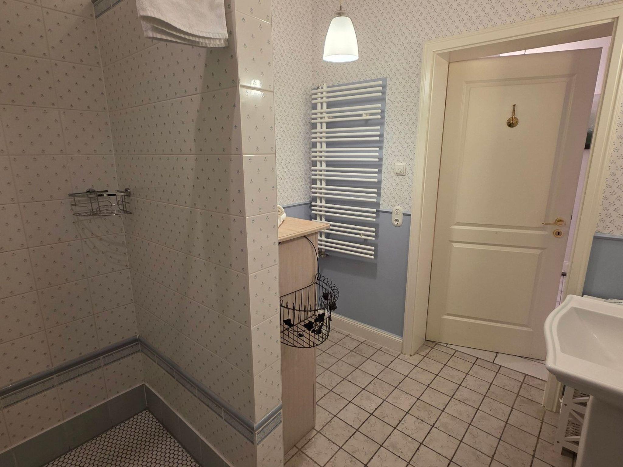 Ein separates Durchgangszimmer mit gemütlichem Sofa lädt zum Lesen und Entspannen ein. Das frisch renovierte Badezimmer - im Laura-Aschley-Design - mit Dusche und WC, greift mit liebevollen Details und nostalgischen Armaturen den Charme vergangener Zeiten auf.
