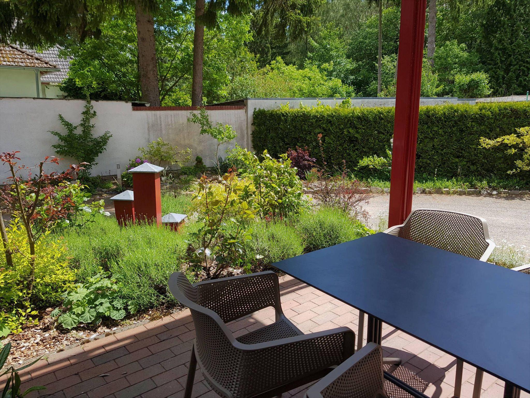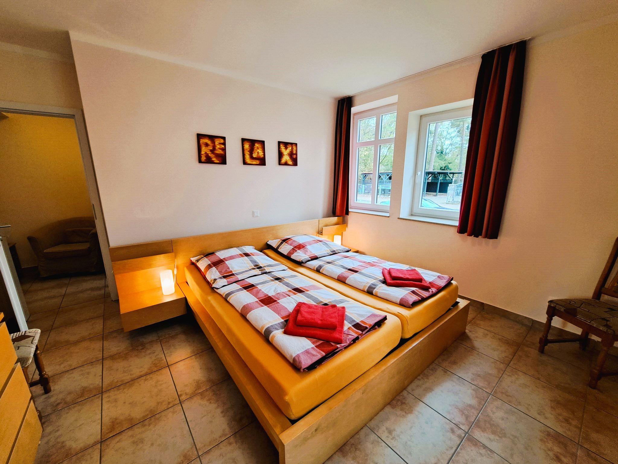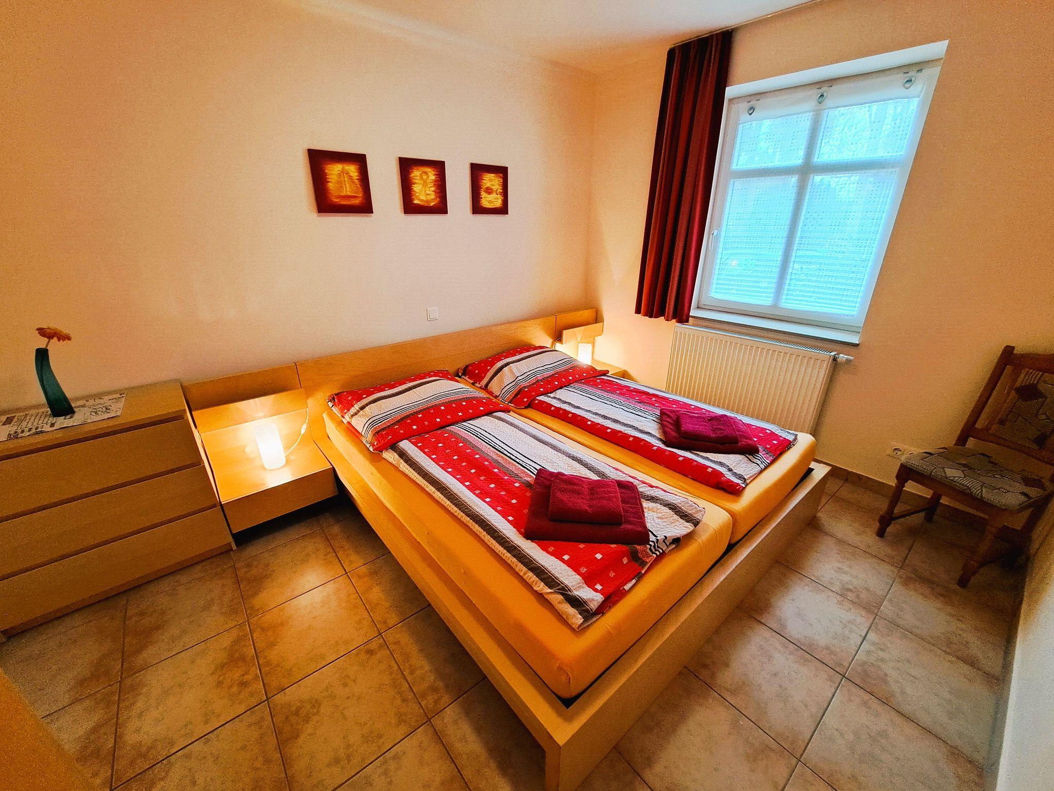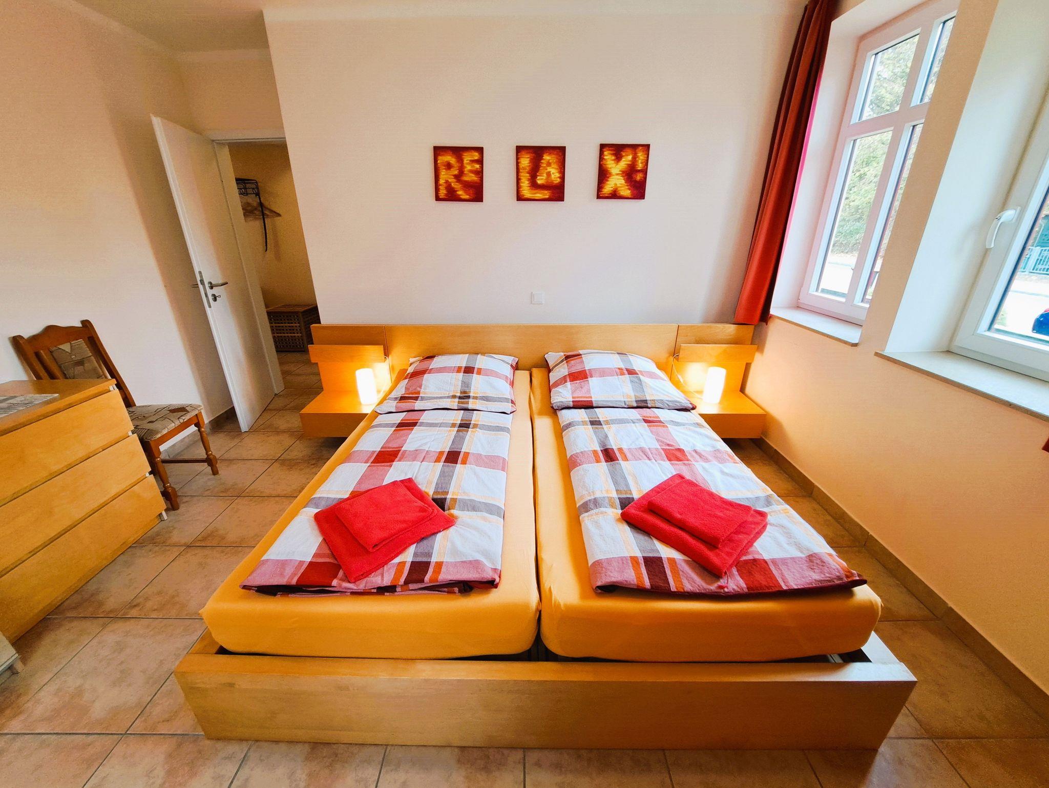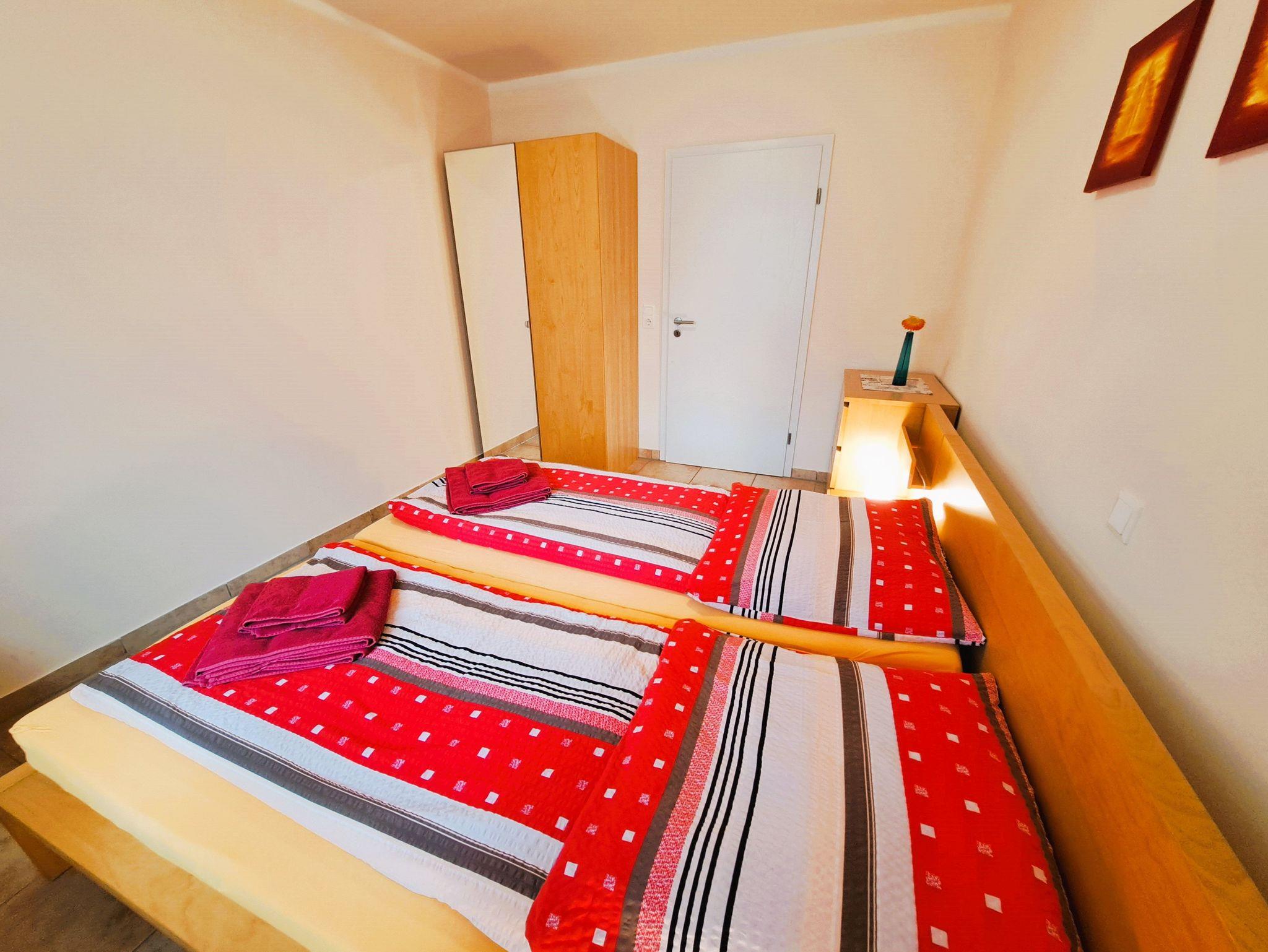 Unsere Ferienwohnung 2 (Ostseite) befindet sich im Erdgeschoss und bietet eine gemütliche Terrasse, ideal für entspannte Stunden im Freien. Schon beim Betreten empfängt Sie ein einladender Flur mit Sessel, Garderobe und Schuhablage. Die beiden Schlafzimmer sind jeweils mit einem komfortablen Doppelbett, Nachttischen, Lampen, Wechselschaltern und doppeltürigen Kleiderschränken ausgestattet perfekt für eine erholsame Nachtruhe.