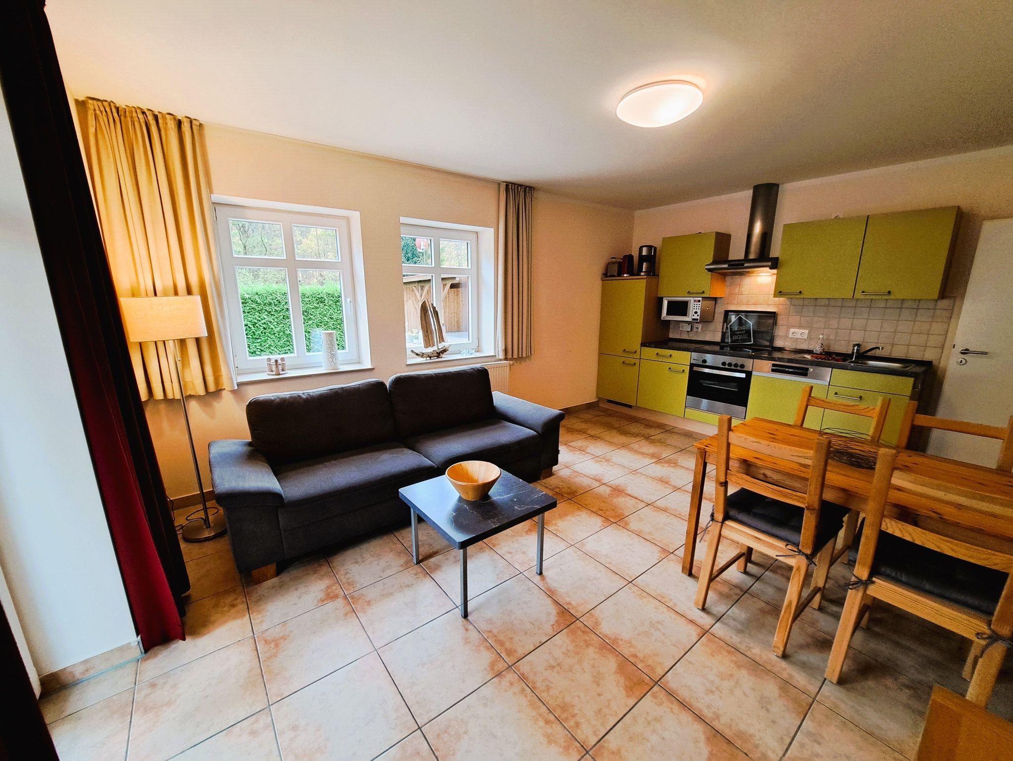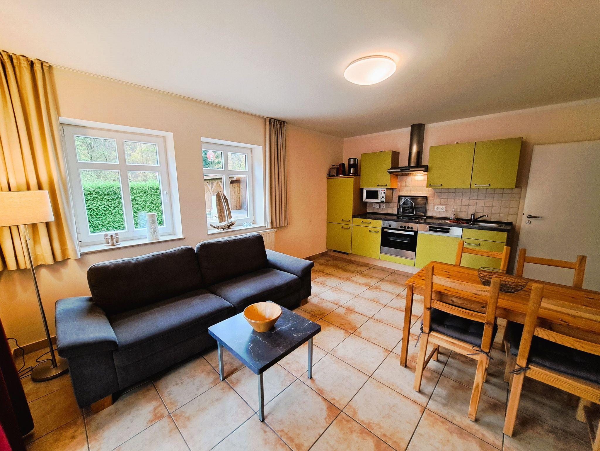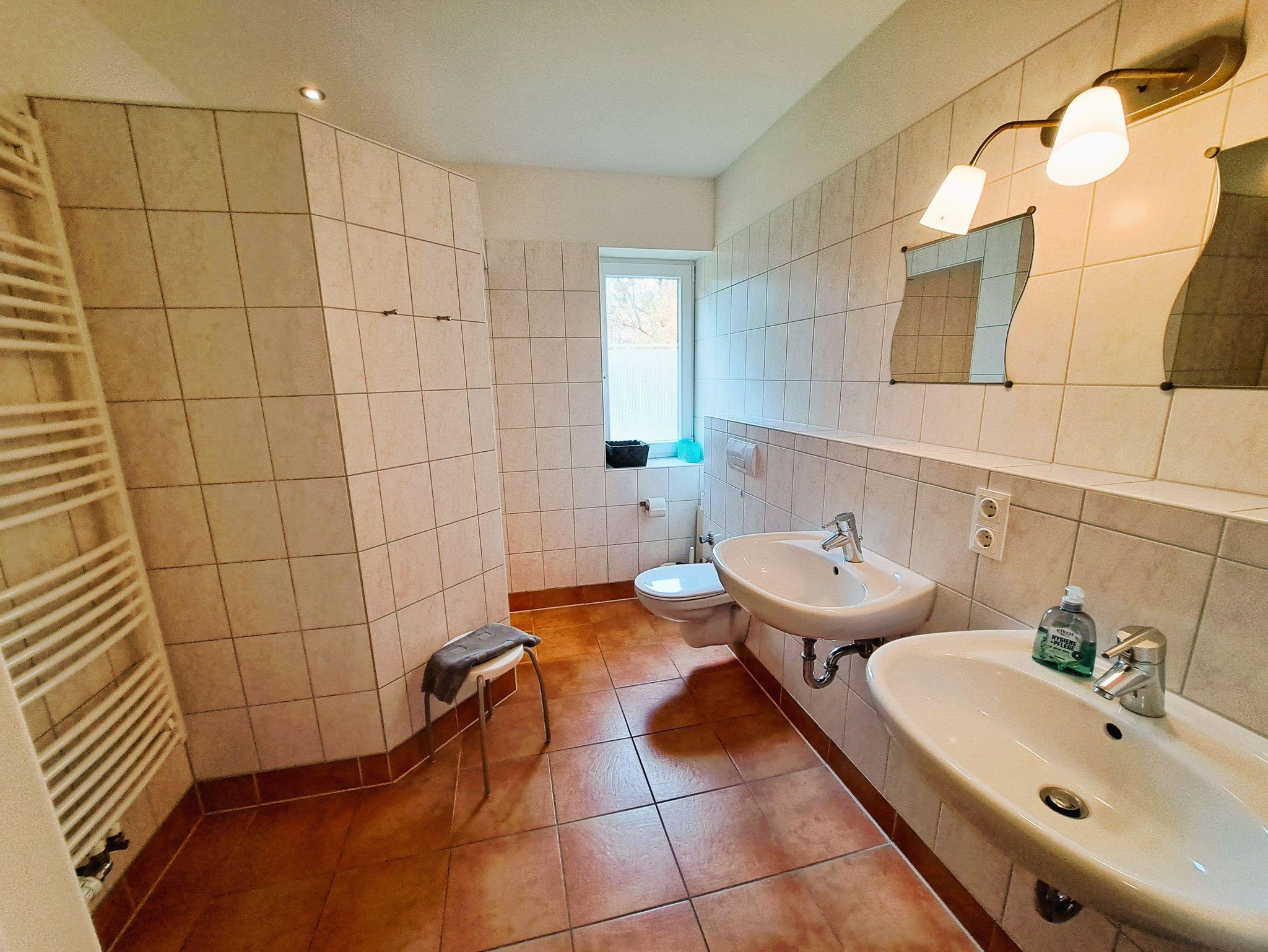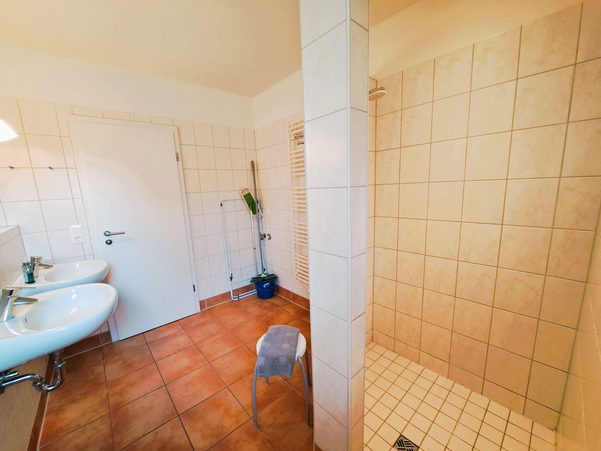 Im modernen Tageslicht-Badezimmer erwartet Sie eine ebenerdig begehbare Dusche, ein Doppelwaschbecken mit Ablage und ein WC. Der offene Wohn- und Kochbereich schafft eine einladende Atmosphäre und ermöglicht den direkten Zugang zur Terrasse. Die Einbauküche ist vollständig ausgestattet und verfügt über alle wichtigen technischen Geräte sowie einen Esstisch, an dem Sie Ihre Mahlzeiten genießen können.