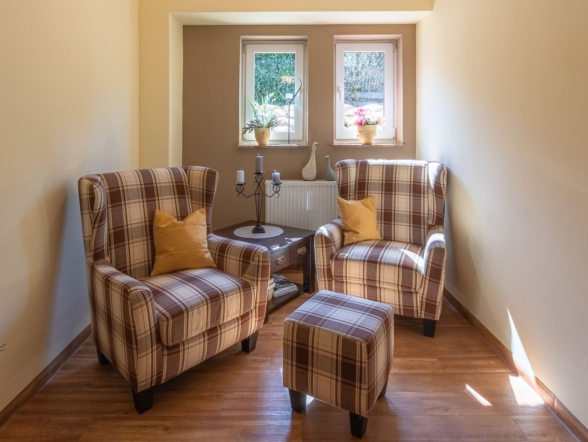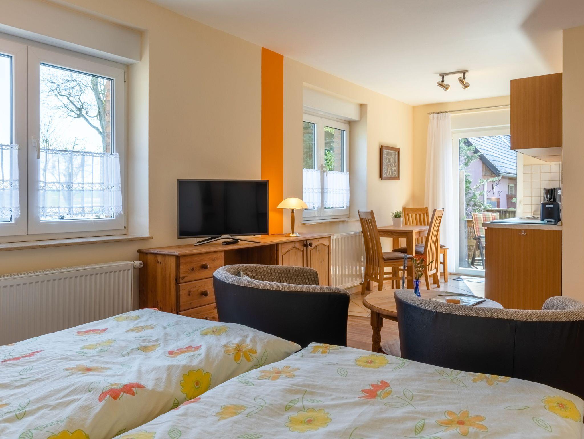 Gemütliches, helles und modern eingerichtetes Nichtraucher-1-Raum-Appartment mit kombiniertem Wohn-/Schlafbereich, Küchenzeile, Dusche/WC, Diele und Abstellkammer im Landhaus Rügeband für 2 Erwachsene und max. 1 Kind unter 3 Jahren. Von dieser Unterkunft gelangen Sie direkt auf die möblierte Terrasse und in den Garten mit Grill-/Spielplatz und Sitz-/Ruhebereichen. Alle Fenster der Unterkunft verfügen über Außenjalousien. Frühstücksservice kann nach Absprache und Verfügbarkeit beim Gastgeber direkt angefragt werden.