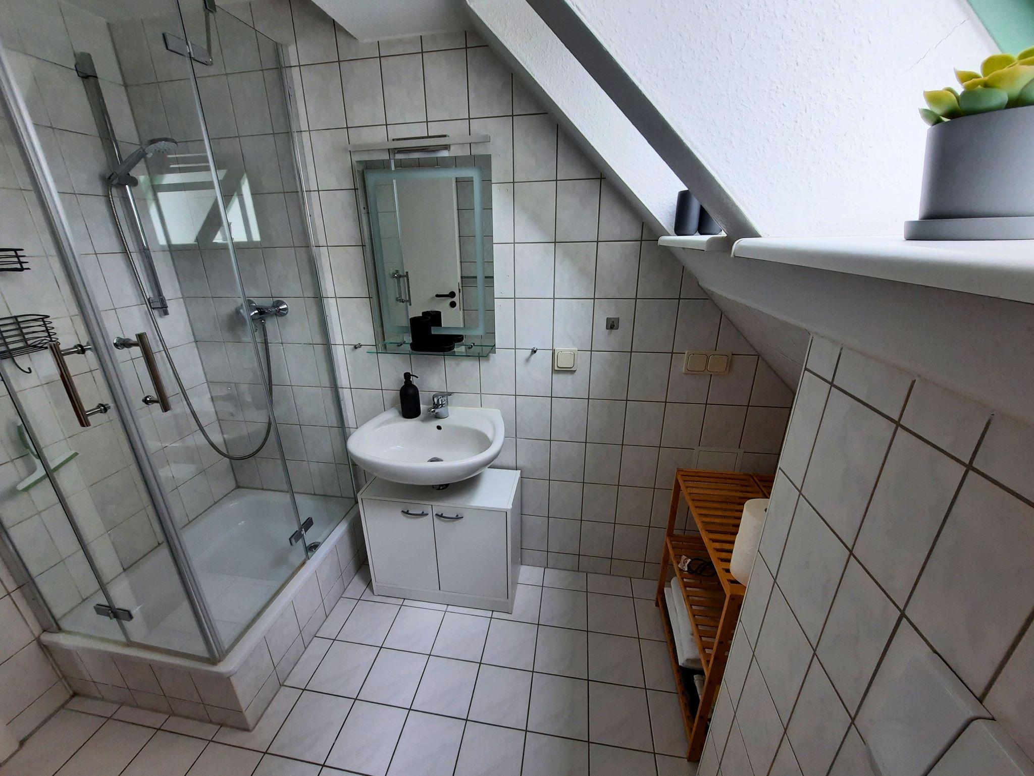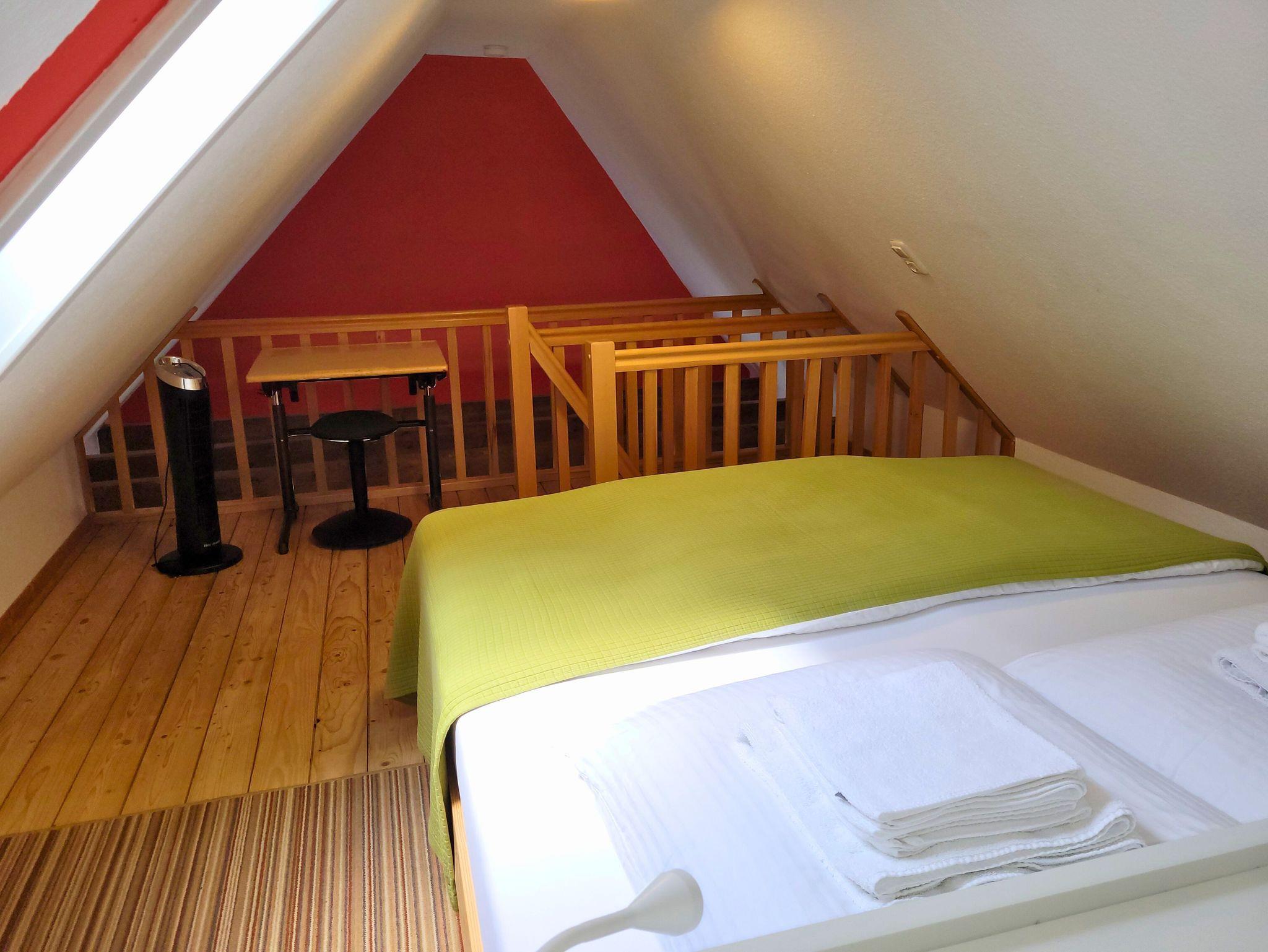 Die Maisonette-Ferienwohnung erstreckt sich über zwei Ebenen und befindet sich im 2. Obergeschoss eines Geschäftshauses. Beim Betreten der ersten Ebene erwartet Sie ein einladender Eingangsbereich mit Garderobe und Blick in das offen gestaltete Wohnzimmer. Hier finden Sie eine gemütliche Couchecke, einen Hängesessel, einen Flachbildfernseher und einen höhenverstellbaren Schreibtisch vor. Dank einer 100 Mbit/s-Verbindung besteht die Möglichkeit zum Arbeiten im Homeoffice. Zudem bietet der Wohnbereich die erste Schlafmöglichkeit mit einem Doppelbett (1,40 m Breite) oder der Option, das Schlafsofa zu nutzen.