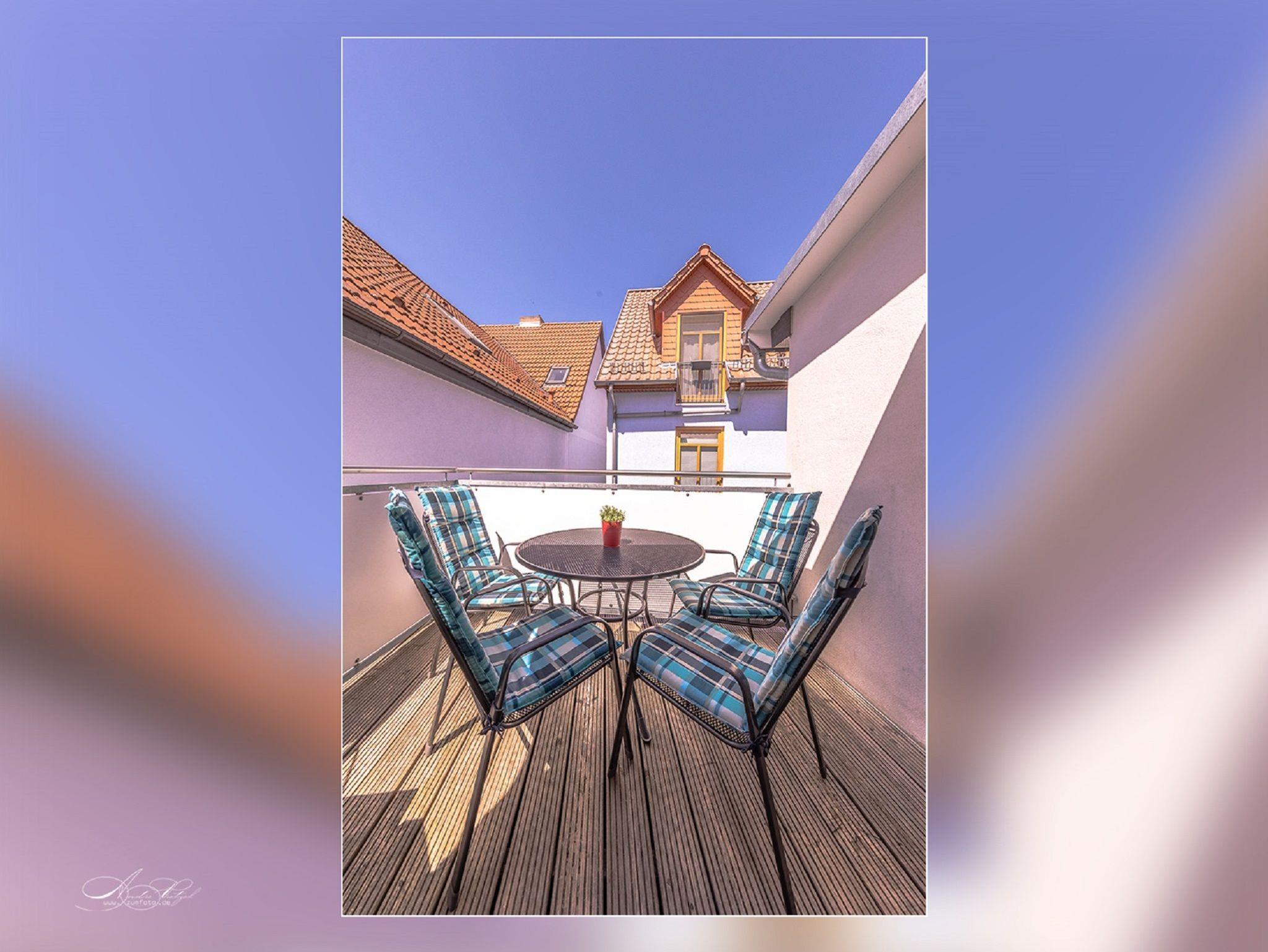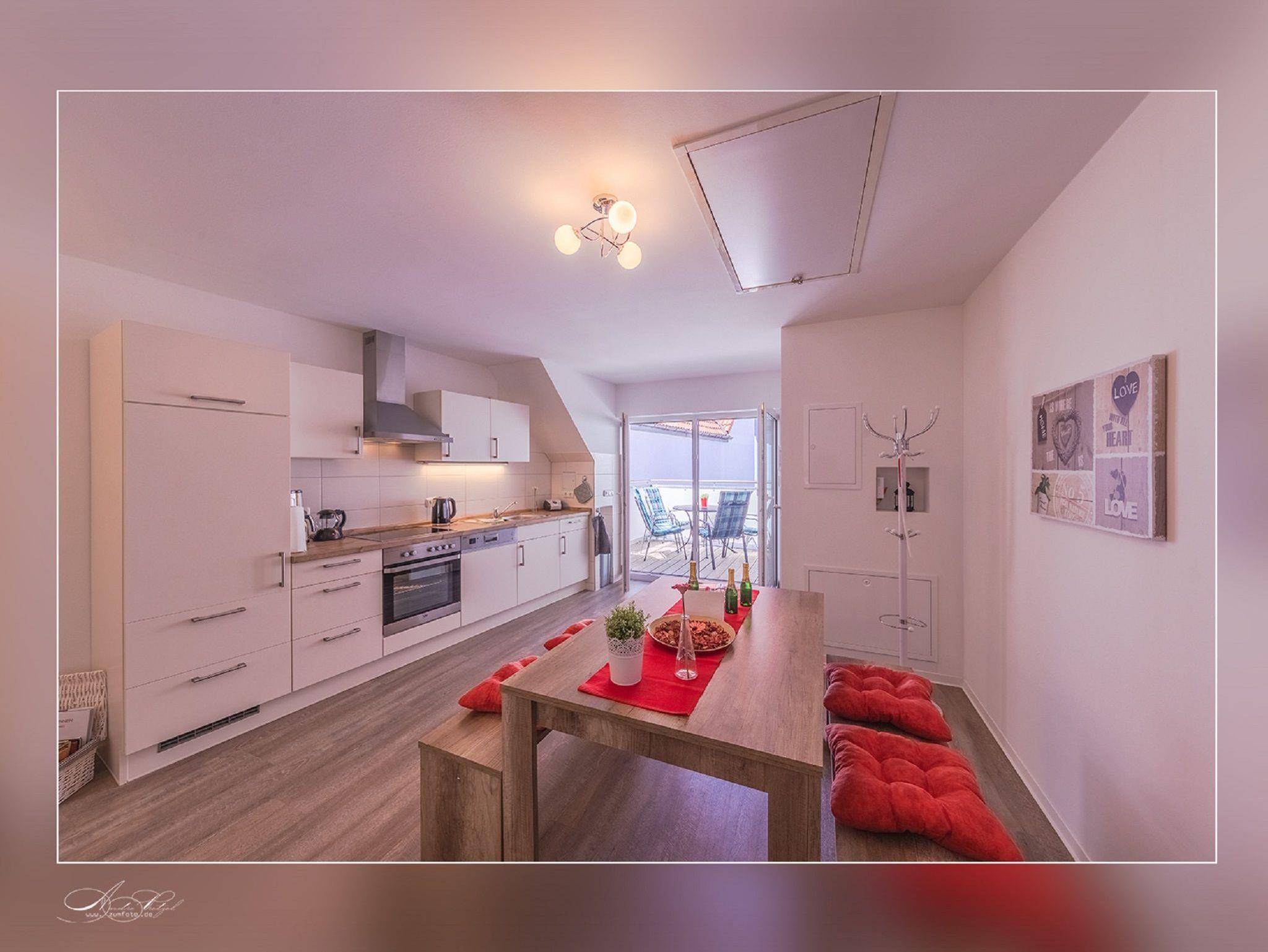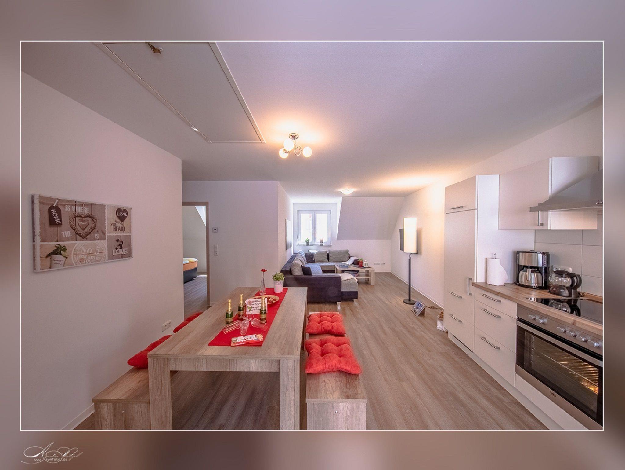 Die Ferienwohnung im 2. Obergeschoß ist 70 Quadratmeter groß und verfügt über W-Lan , 1 Balkon , 2 Schlafzimmer , einen gemütlichen Wohn- Essbereich mit Flachbildfernseher und voll ausgestattete Einbauküche.