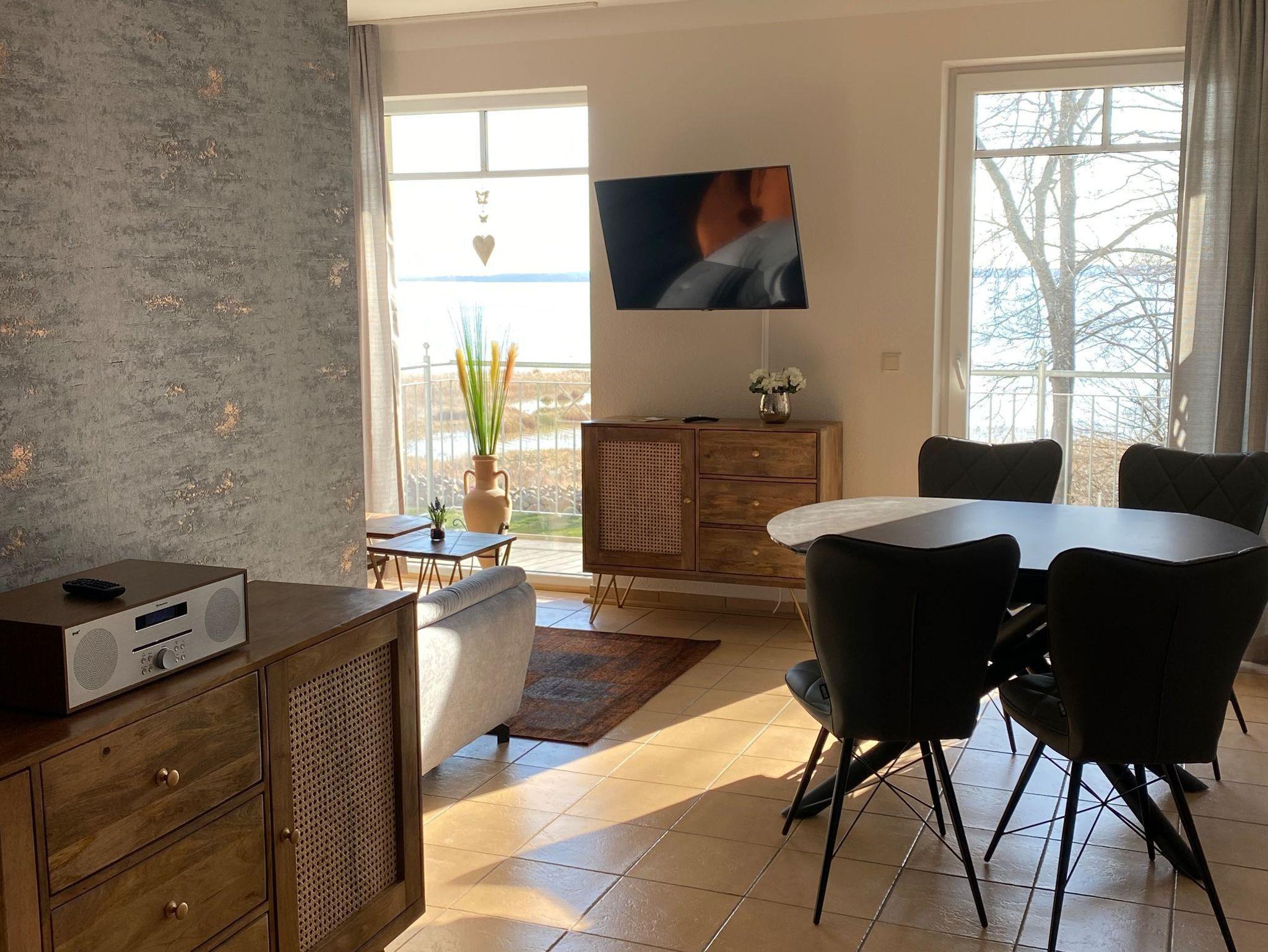 In der schönen, 80 m² großen Ferienwohnung (4.1), die sich in der 1. Etage befindet, erwartet Sie ein großzügiger Wohn- und Essbereich mit TV, tollem Seeblick und Zugang zum möblierten, sonnigen Balkon. In diesem Bereich befindet sich auch die vollständig ausgestattete Küche mit Backofen, Induktionsherd, Mikrowelle, Wasserkocher und Kaffeemaschine.