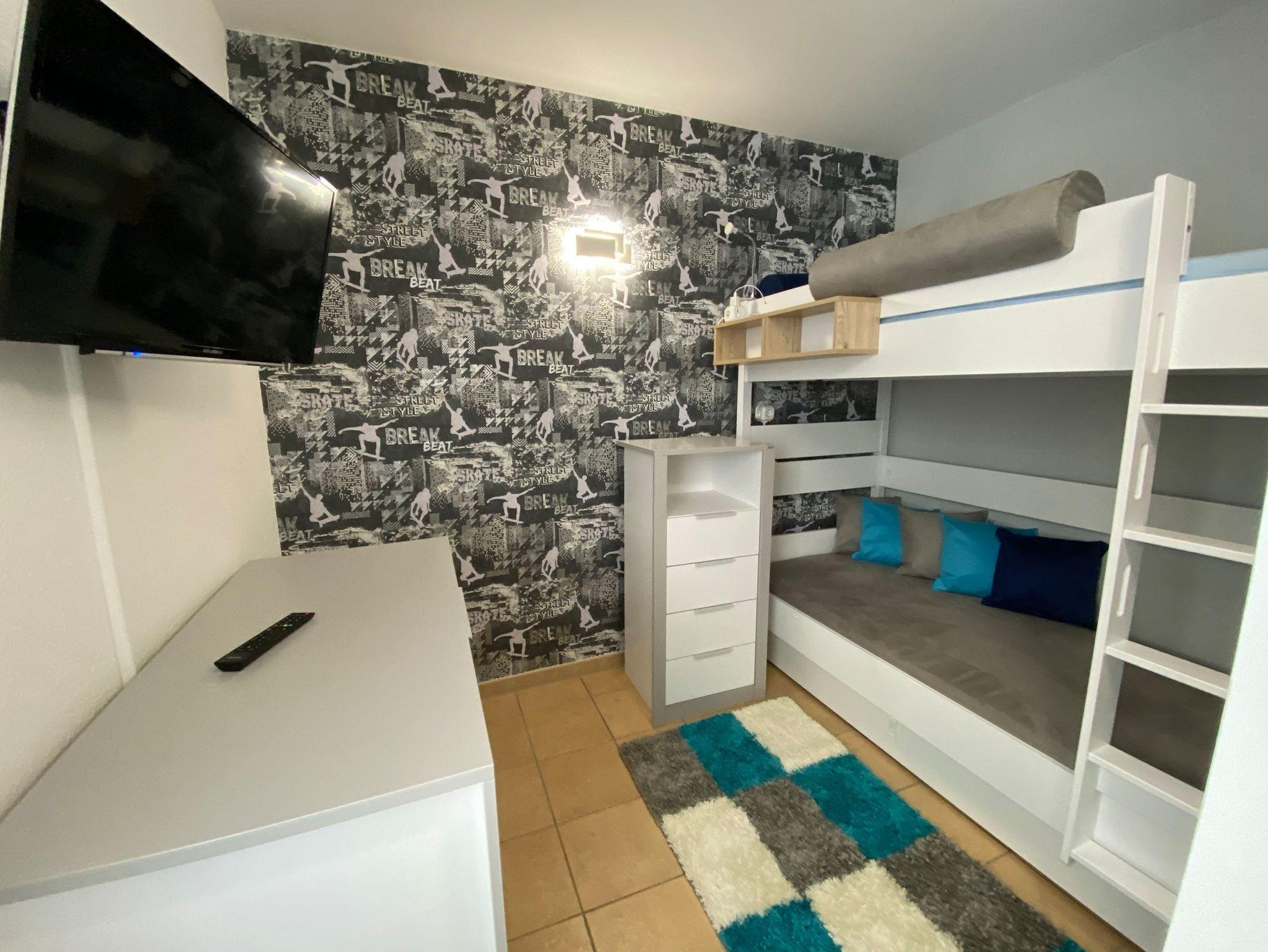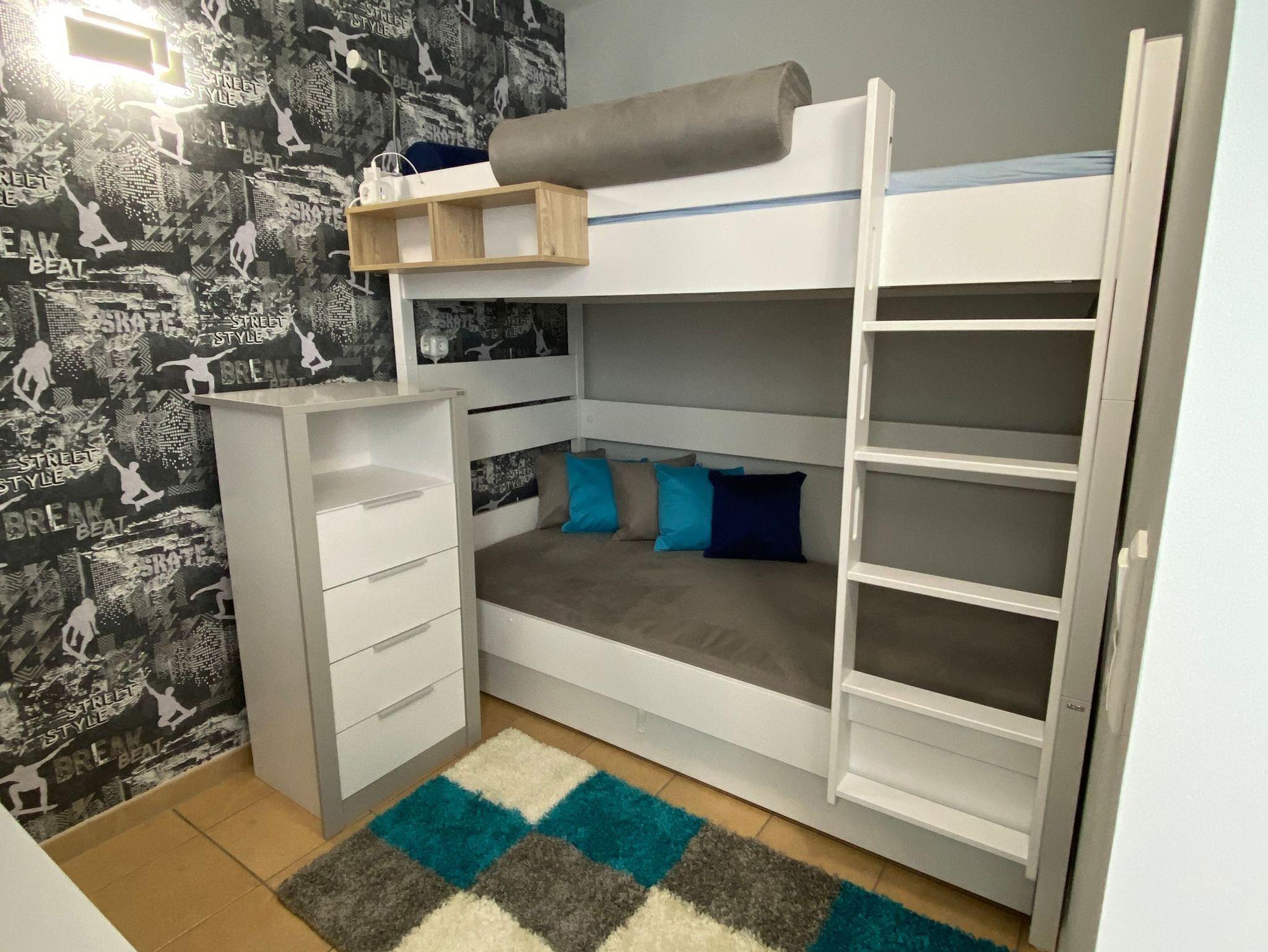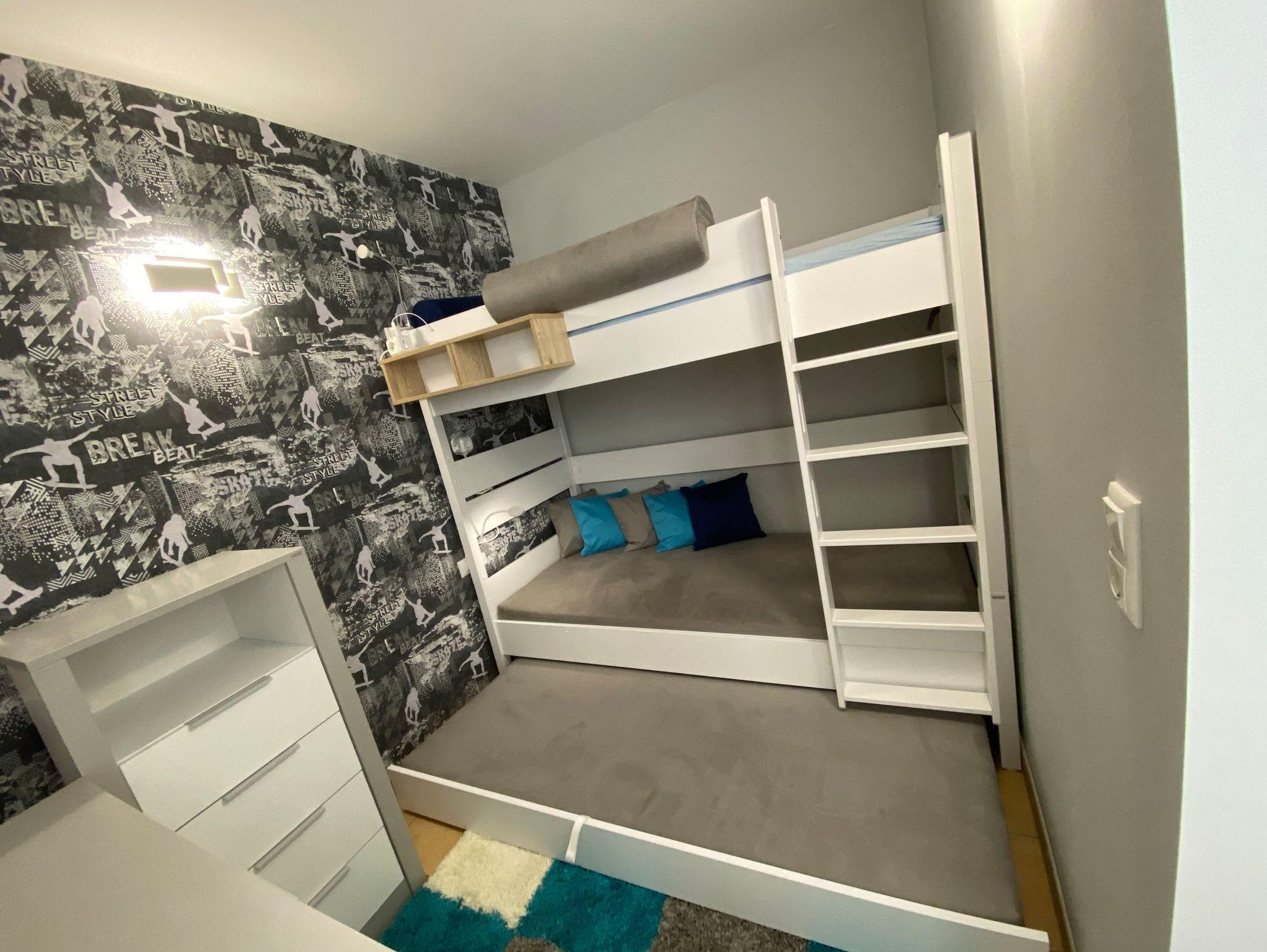 Zur weiteren Ausstattung gehören noch ein Schlafzimmer mit Doppelbett und 1 Schlafzimmer mit Doppelstockbett (ausziehbar für 2 Personen), sowie ein Bad mit Dusche und WC.