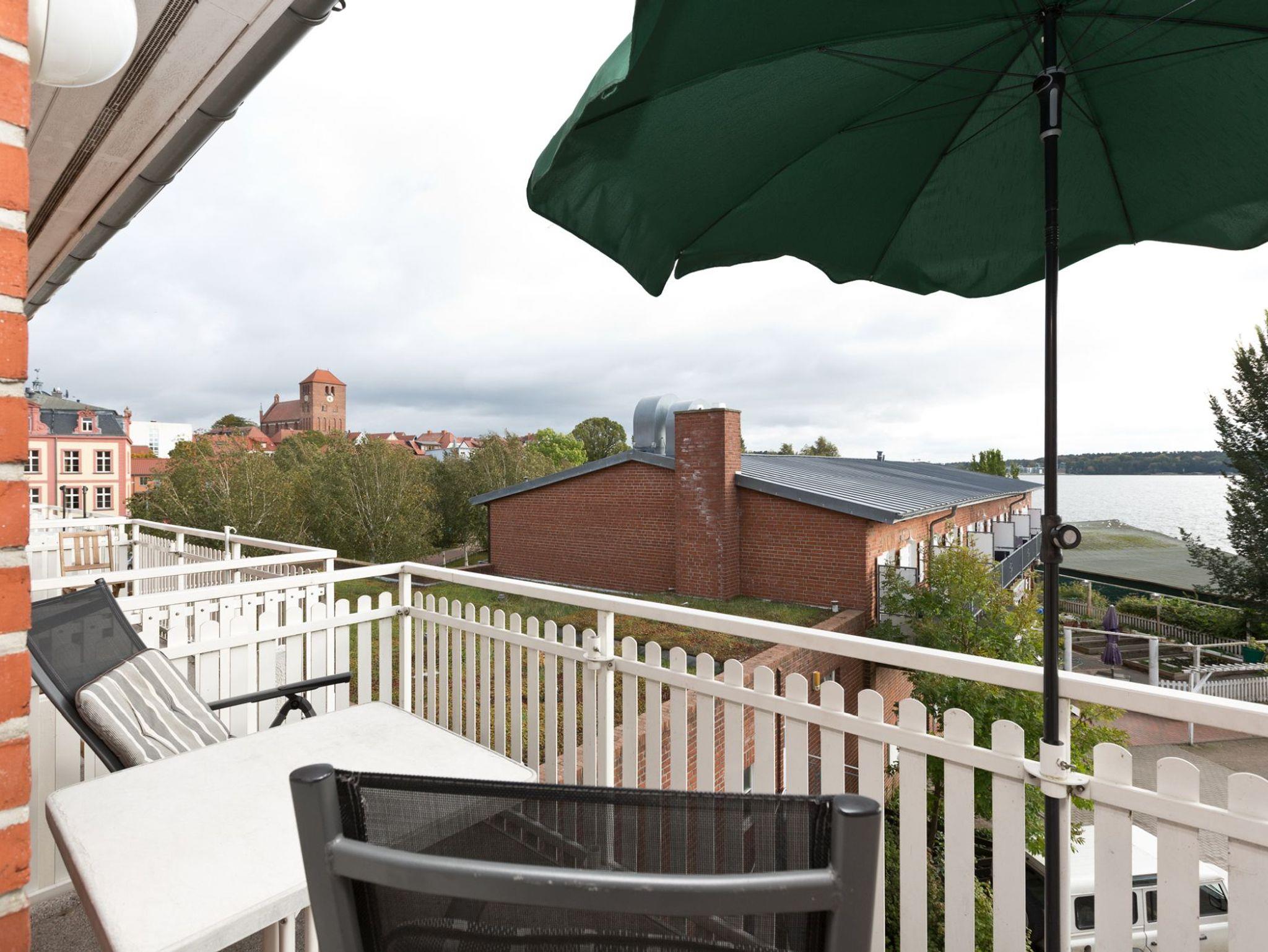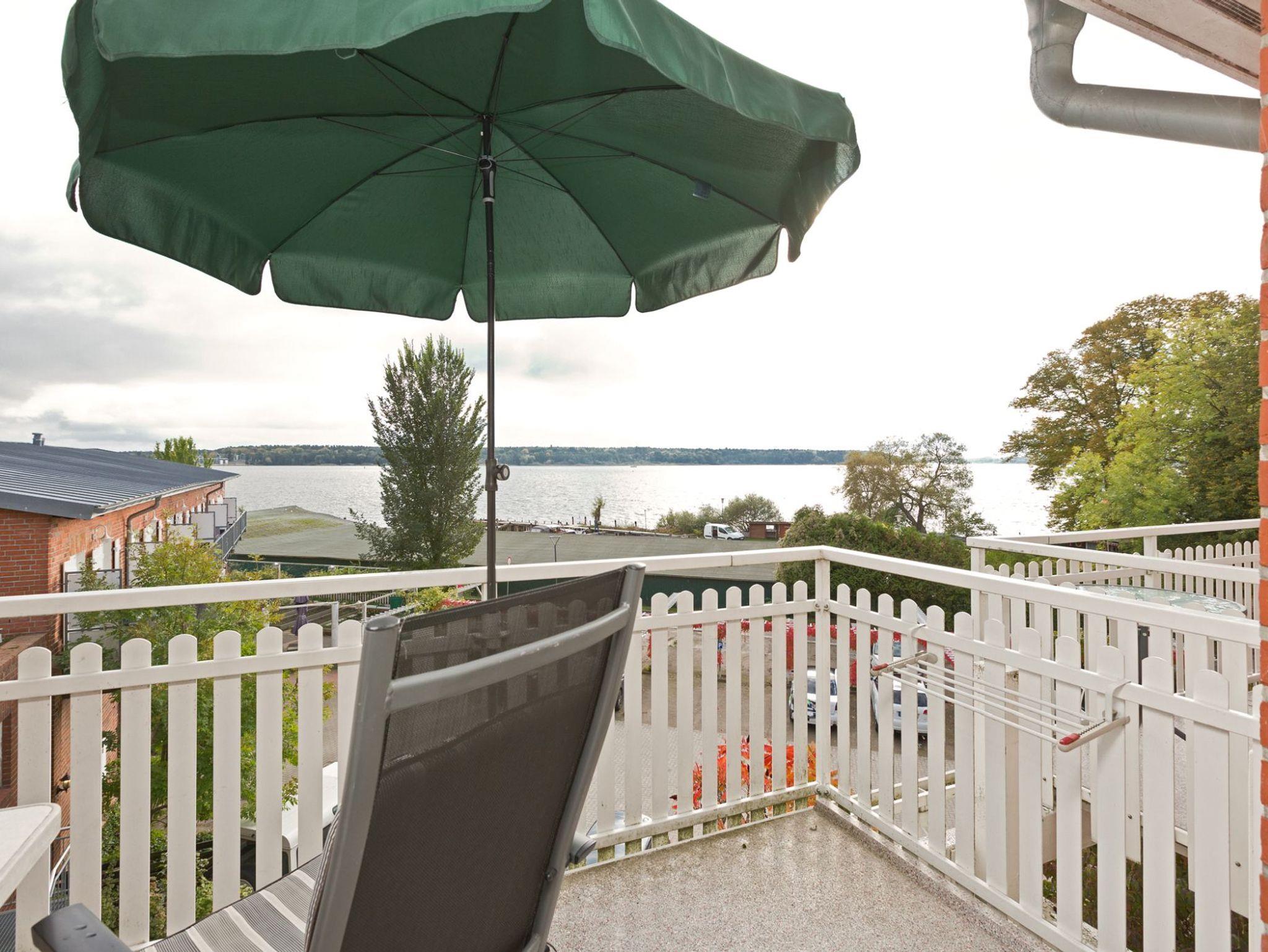 Bemerkenswert ist der freie Ausblick von der Sitzgruppe (Sofa, Sessel, Couchtisch) oder vom Südbalkon aus bis zum gegenüberliegenden Ufer der Binnenmüritz und bei guter Sicht bis zum Schloss Klink.