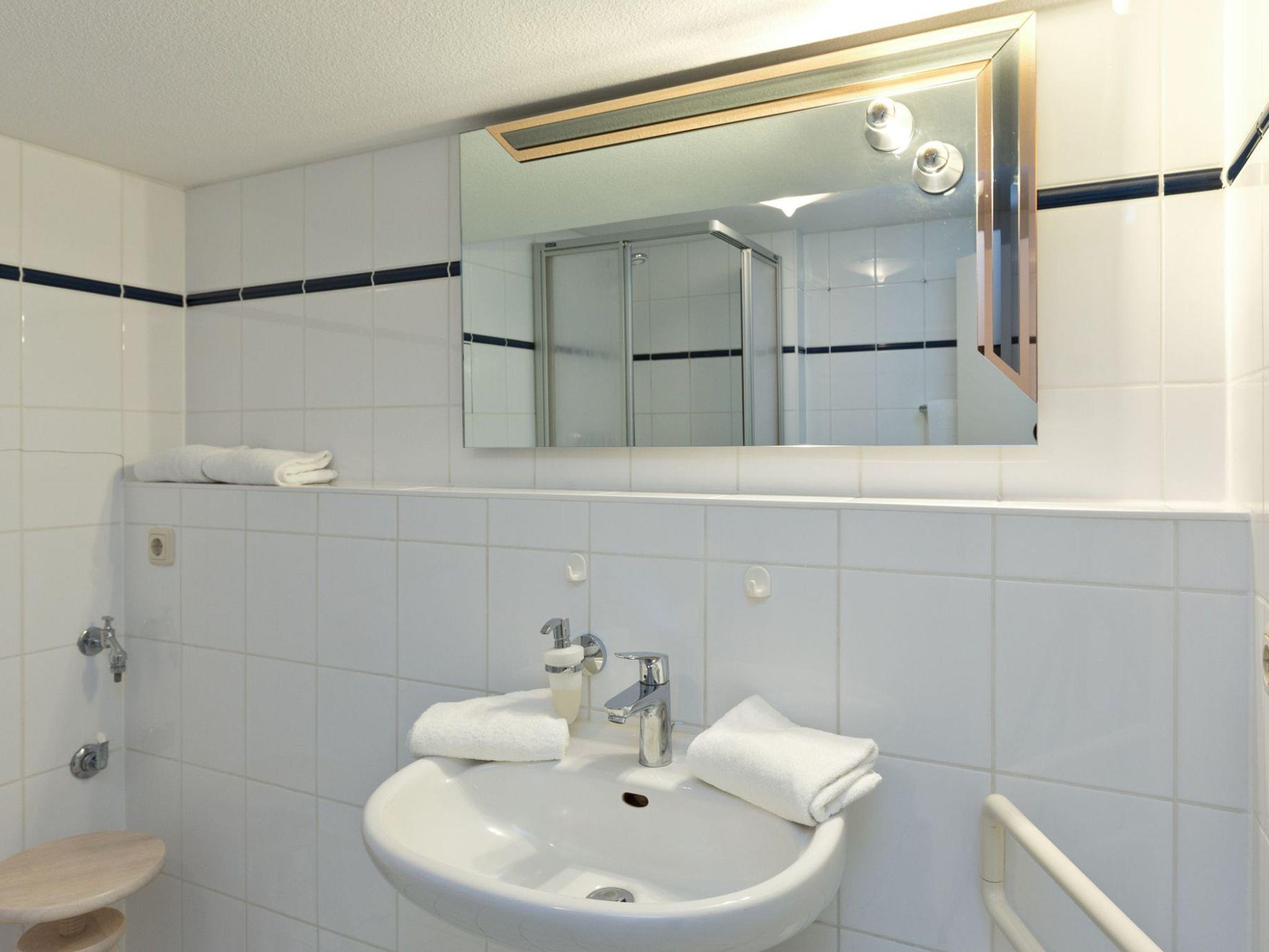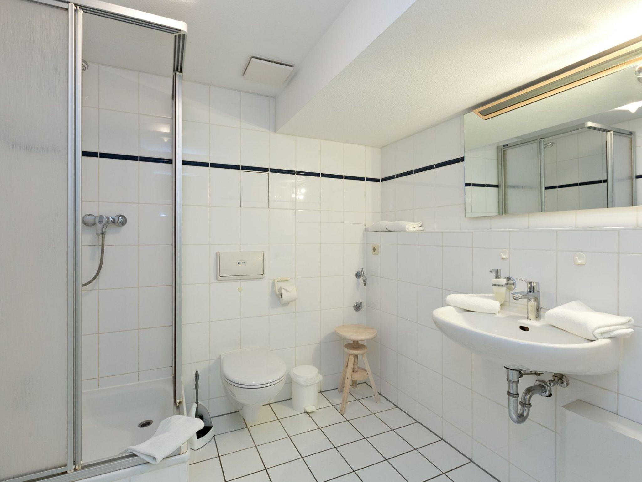 Das Apartement ist ausgestattet mit einem separaten Duschbad, Küchenzeile mit 4-Plattenherd, Backofen und Kühlschrank mit Frosterfach. Der Essplatz wurde in 2020 mit modernen aber bequemen Möbeln neu eingerichtet. Die Urlaubskleidung kann in einem großen Kleiderschrank sowie in einem Sidebord untergebracht werden. Zur Unterhaltung stehen ein Flachbildfernseher, Radio und kostenfreies W-lan zur Verfügung. Last but not least gehört zum Apartement auch ein Stellplatz für Pkw, allerdings nur bis zu einem zulässigen Gesamtgewicht von 1.500 kg.