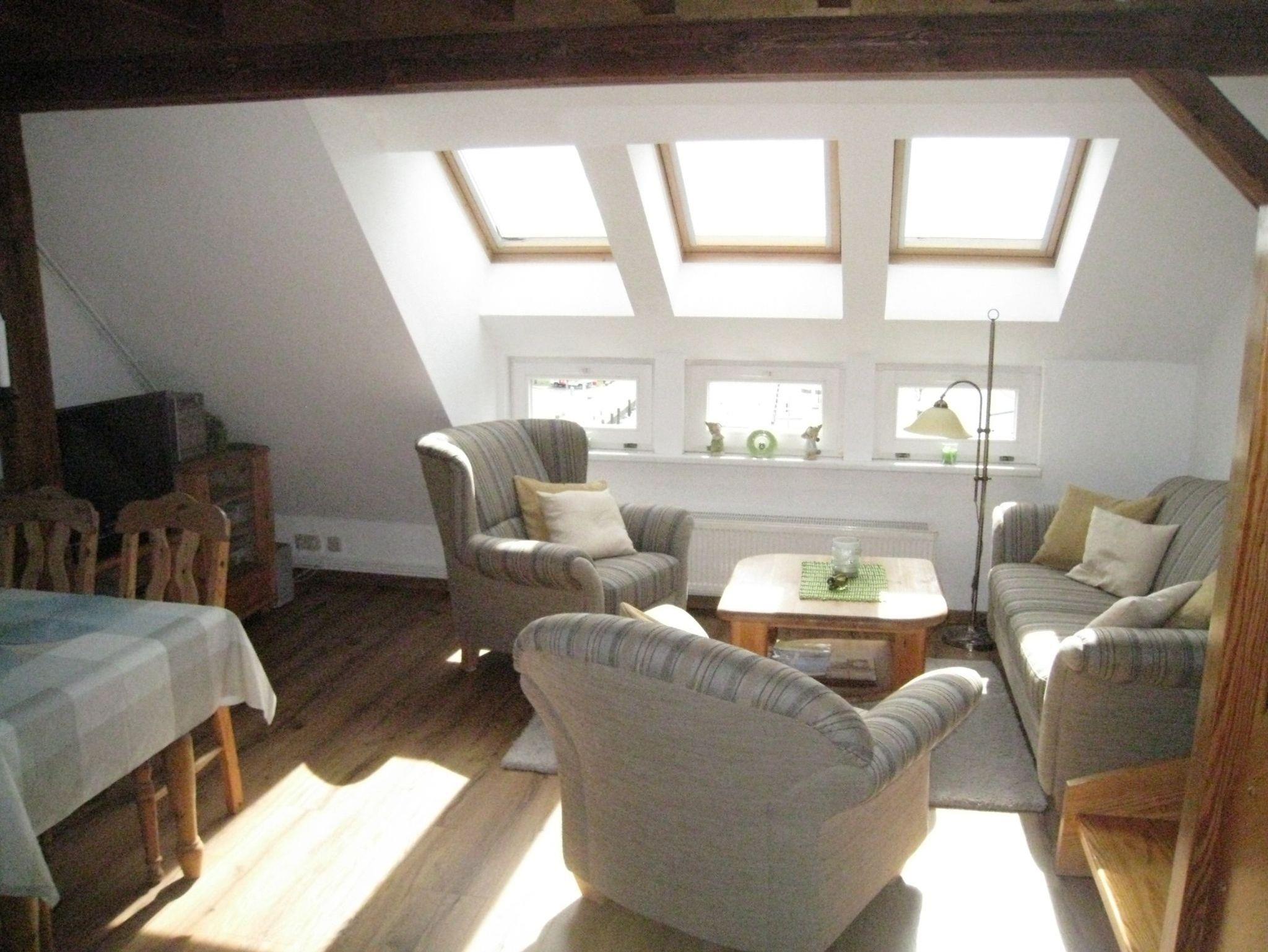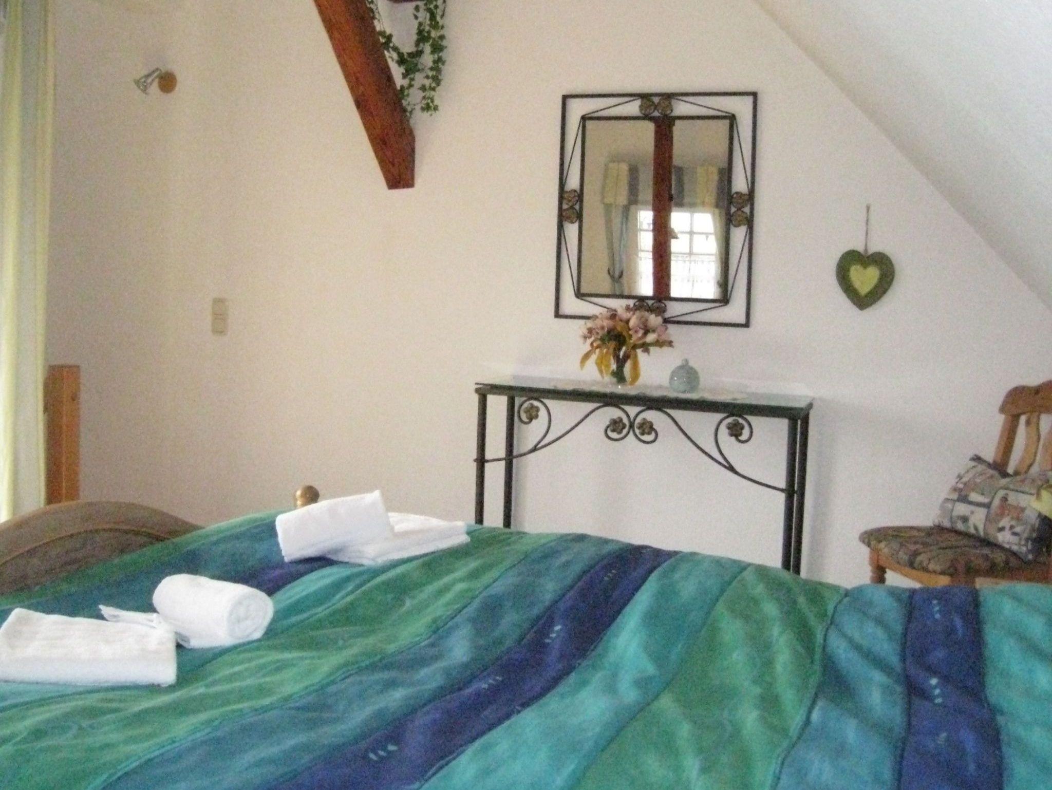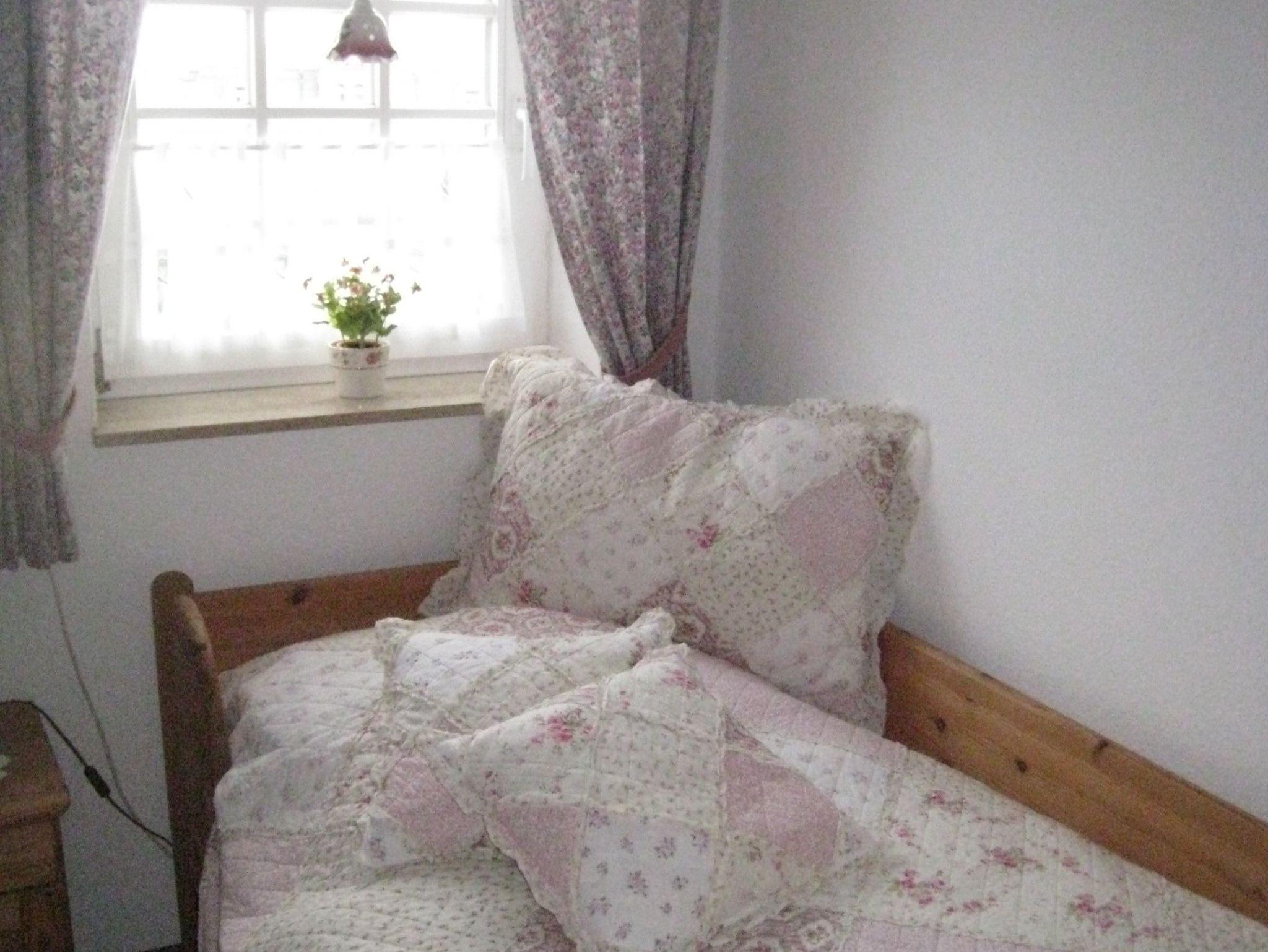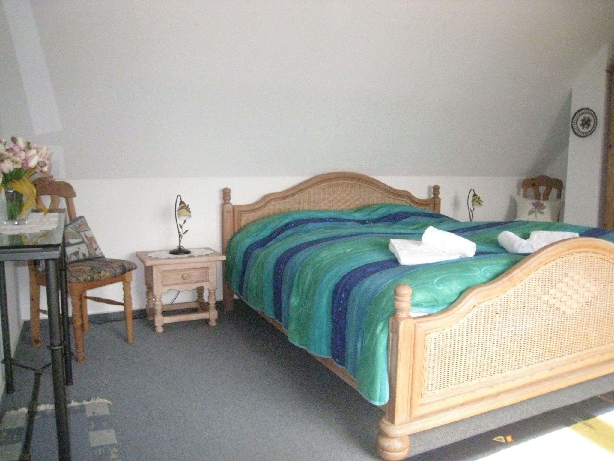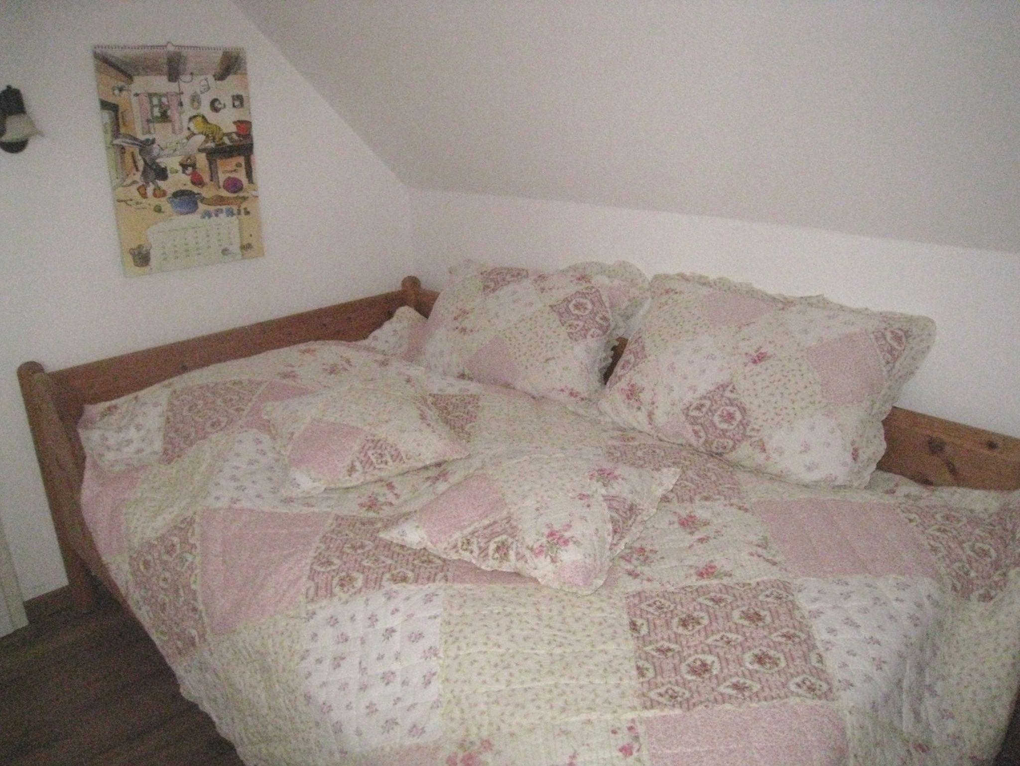 Das Schlafzimmer im 4. Stock ist mit zwei Einzelbetten (90 cm x 190; 120 x 200 cm), Nachttischen, Lampen und kleinem Kleiderschrank ausgestattet. Ein Giebelfenster erlaubt den Blick Richtung Altstadt - wer die Jalousie oben lässt, wird hier von der Sonne geweckt! Das Schlafzimmer im 5. Stock ist über eine Treppe erreichbar. Es verfügt über ein Doppelbett (2 x 90 cm x 200 cm), einen Kleiderschrank, 2 Nachtschränke mit Lampen und ein Flachbild TV (Kabel).
