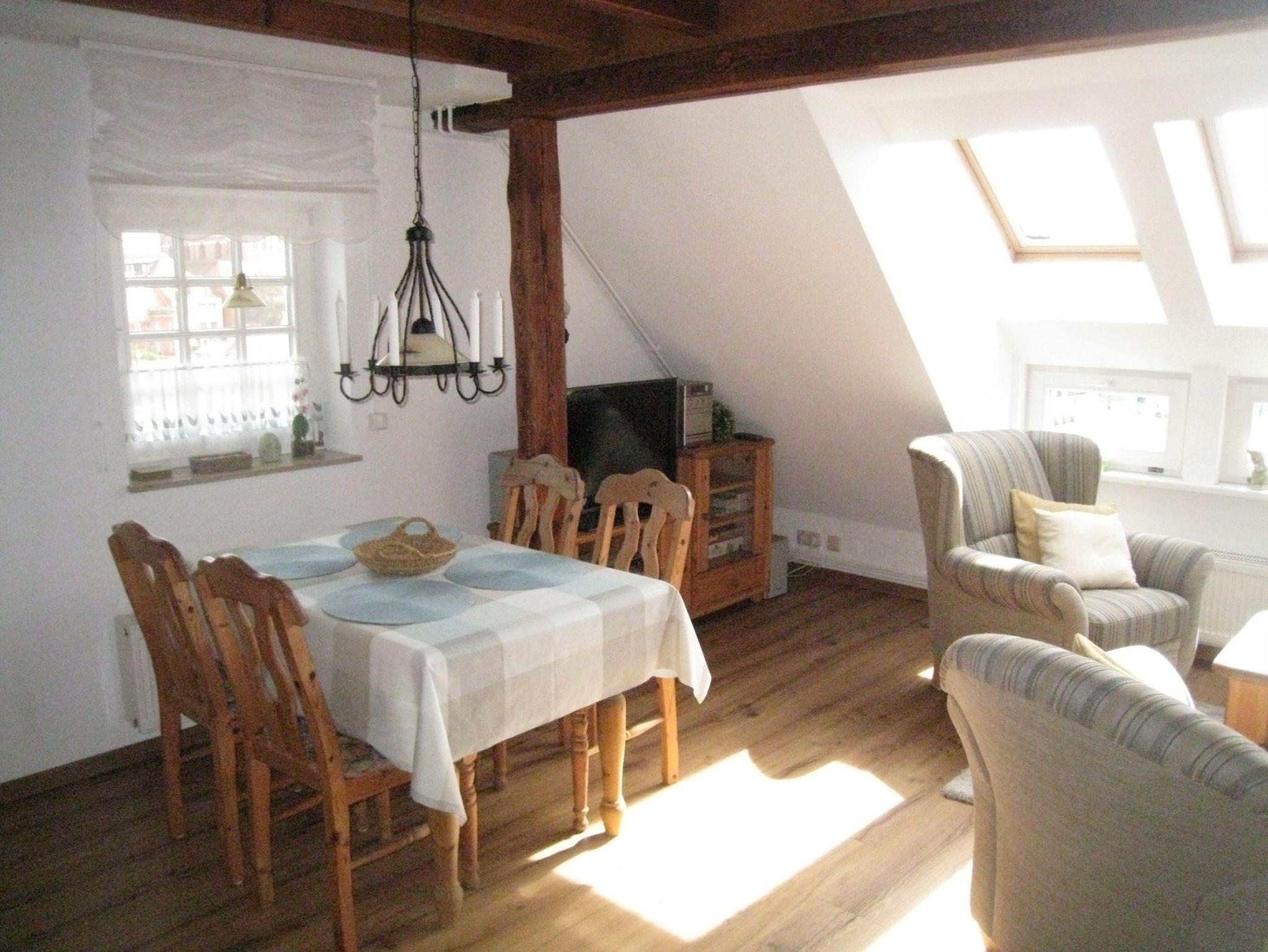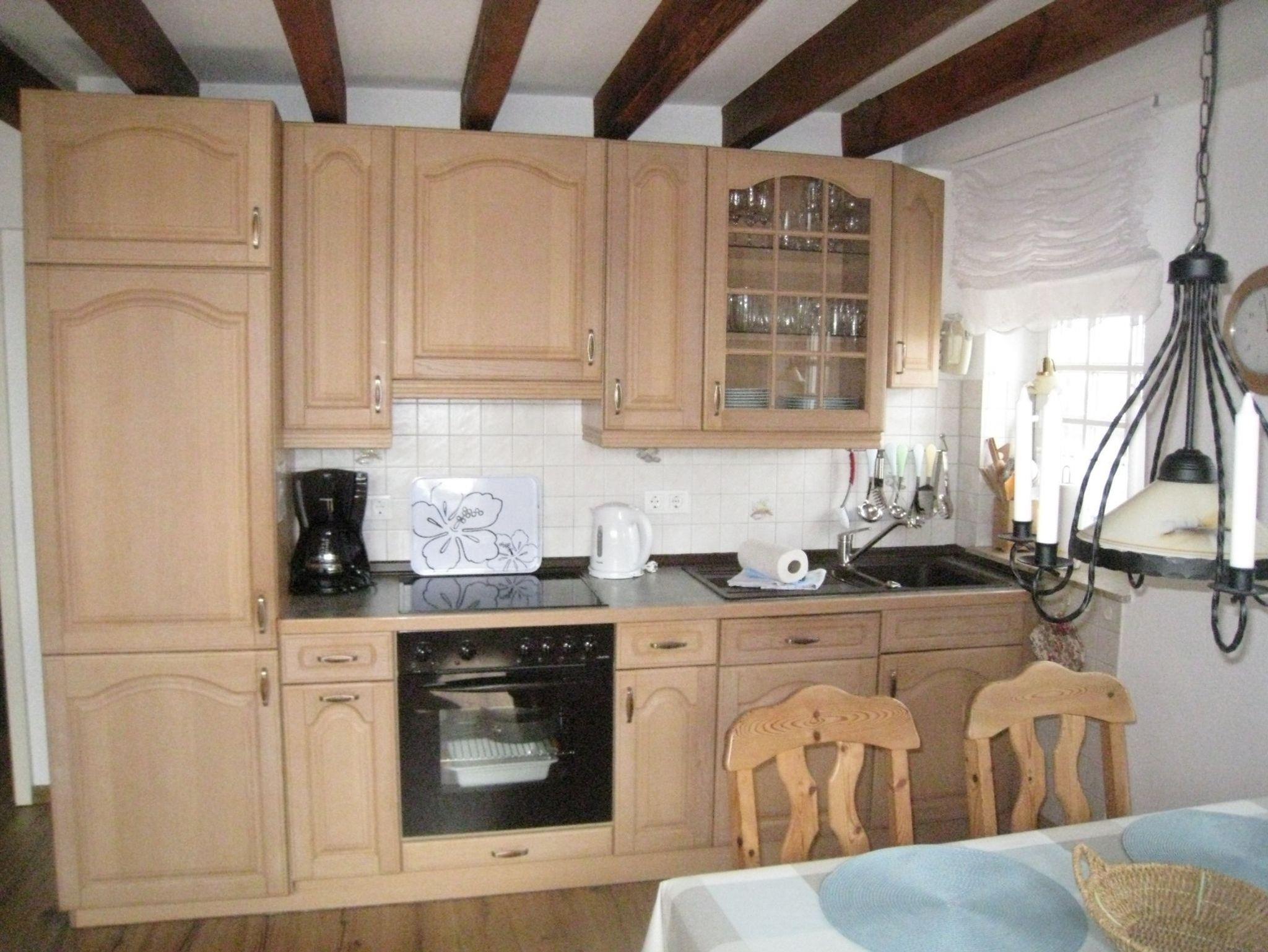 In der komplett eingerichteten hellen Landhausküche finden Sie einen Herd mit Cerankochfeld, Backofen und Geschirrspüler. Kaffeemaschine, Eierkocher, Gewürze, eine kleine Teeauswahl sowie Wasserkocher gehören natürlich ebenso zur Ausstattung. Der gemütliche Essplatz ist für 4 Personen geeignet, eine außergewöhnliche Ausstattung an Porzellan, Besteck und Gläsern lassen keine Wünsche offen.