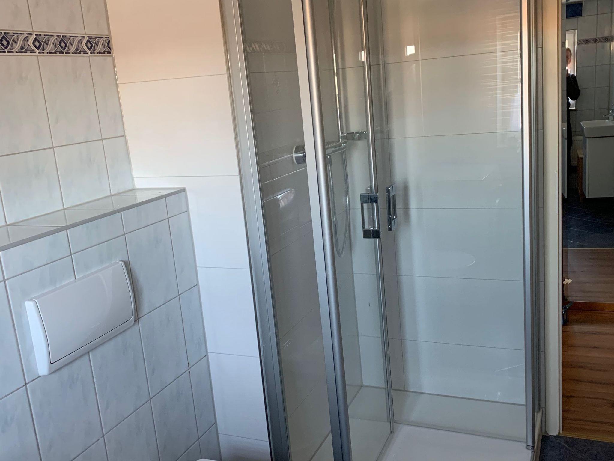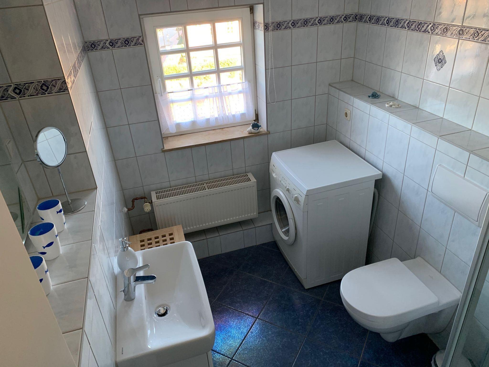 Das helle geflieste Tageslicht-Bad verfügt über eine Dusche, einen Waschtisch sowie genügend Stauraum. Eine Waschmaschine steht Ihnen hier zur Verfügung.