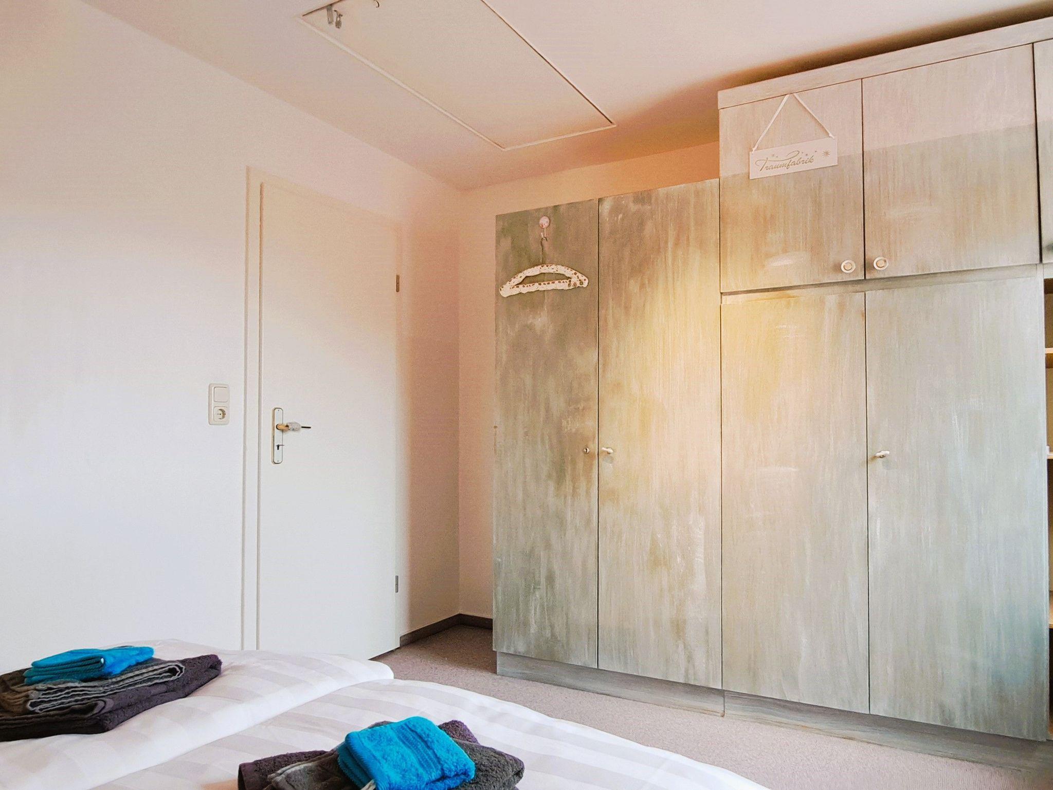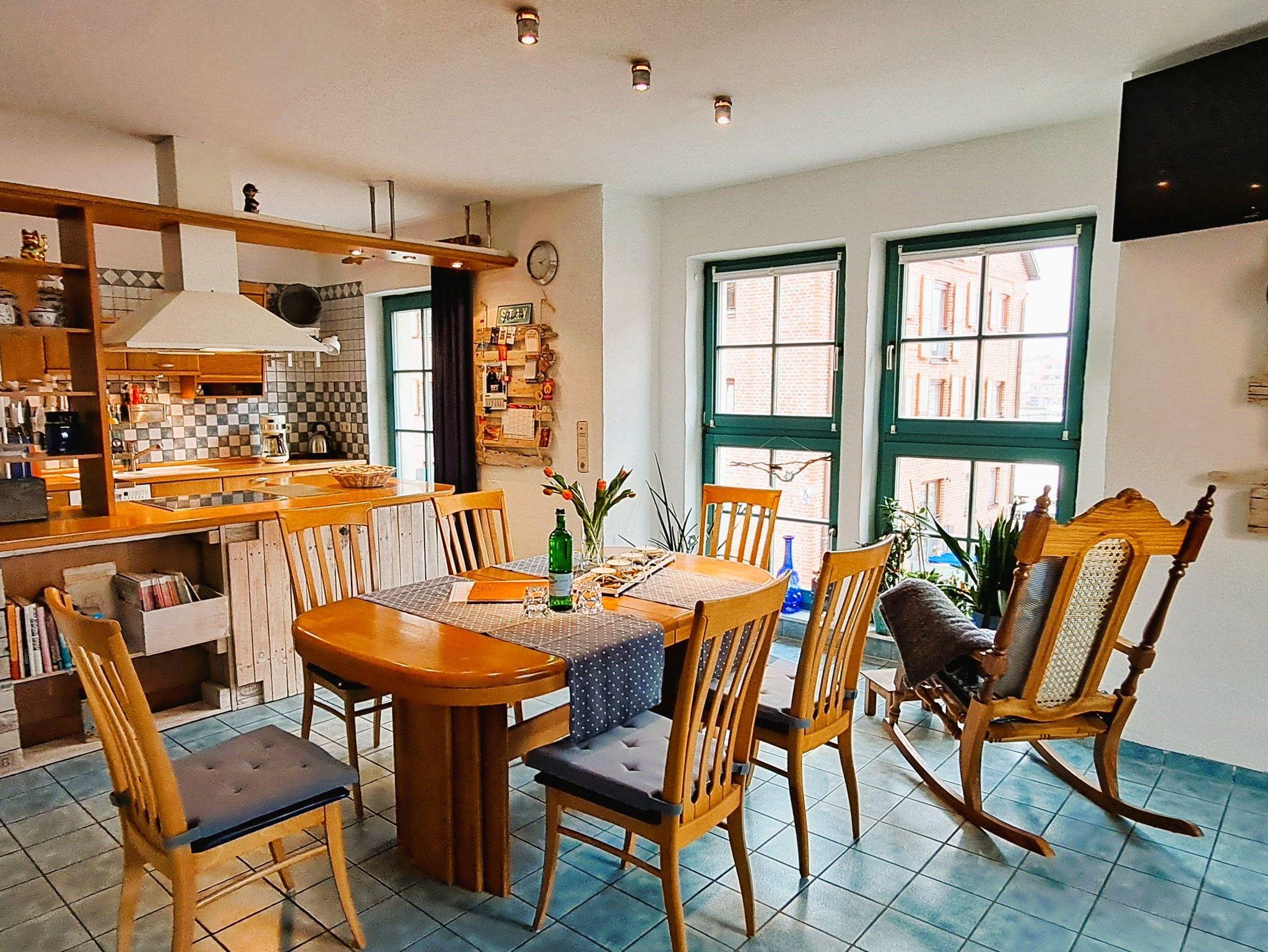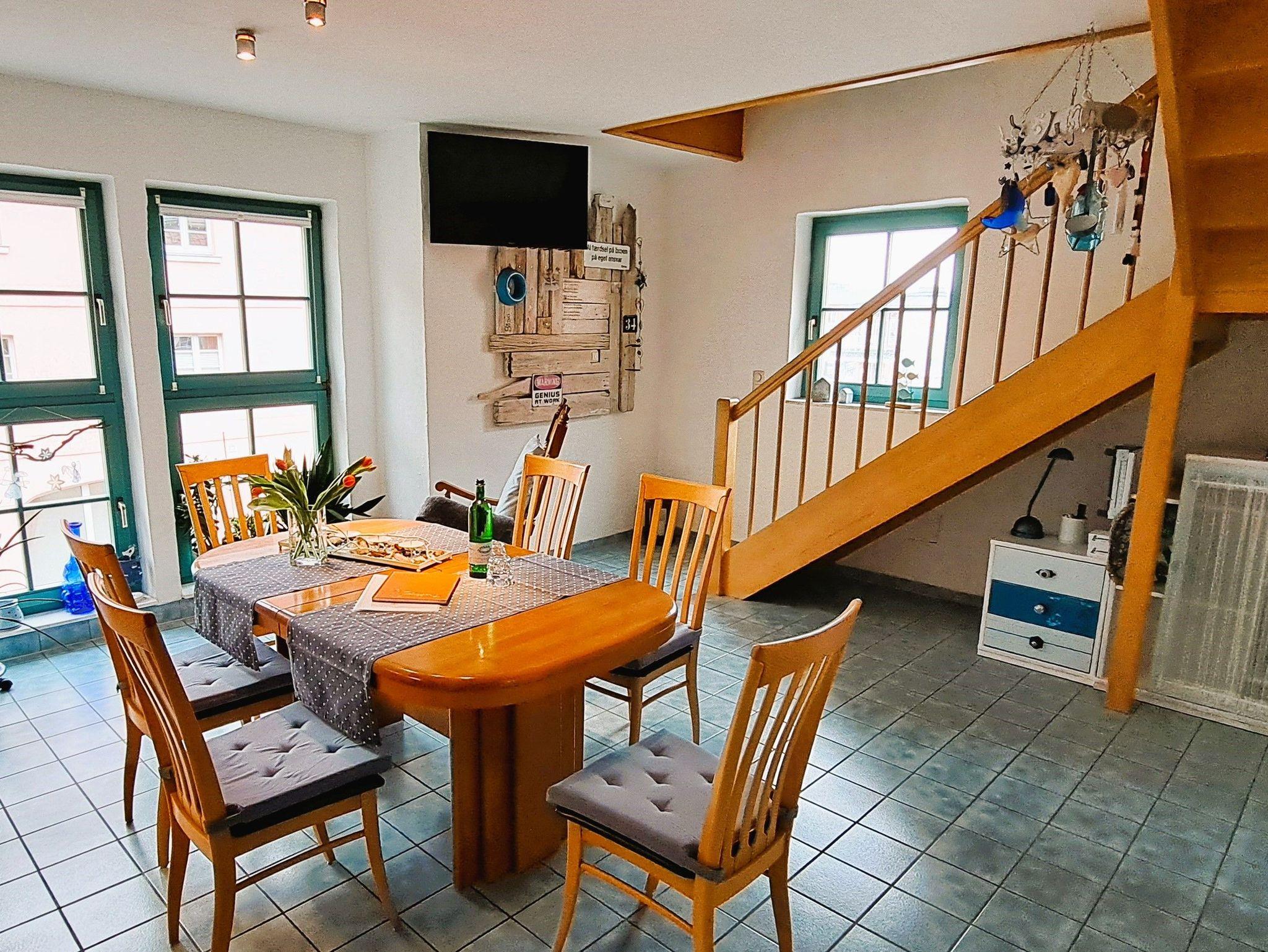 Beim Betreten werden Sie vom Wohnungsflur empfangen, der mit einem praktischen Schuhschrank und einer Garderobe ausgestattet ist. Hier finden Sie auch ein Gäste-WC mit Tageslicht und Handwaschtisch. Das erste Schlafzimmer erwartet Sie mit einem Doppelbett und einem geräumigen Kleiderschrank für Ihre persönlichen Dinge. Die geräumige und helle Wohnküche lädt zum Verweilen ein, verfügt über alle technischen Geräte und bietet Zugang zu einem kleinen Balkon mit einem eingeschränkten Ausblick auf den Hafenbereich. Über eine Ecktreppe gelangen Sie auf die zweite Ebene, wo Sie ein großzügiges Wohnzimmer mit einer bequemen Couchlandschaft und einem Flachbild-TV erwartet. Das angrenzende Tageslichtbad verfügt über eine Dusche und eine separate Badewanne.Das zweite Schlafzimmer auf dieser Ebene bietet ebenfalls ein Doppelbett und ausreichend Stauraum in einem weiteren Kleiderschrank.Die Einrichtung der Wohnung ist einladend und freundlich gestaltet, mit einem Hauch von Vintage und bunten Akzenten, die für eine gemütliche Atmosphäre sorgen. Eine Kaution von 150,00 Euro wird beim Gastgeber hinterlegt per Überweisung und nach Abreise zurücküberwiesen.