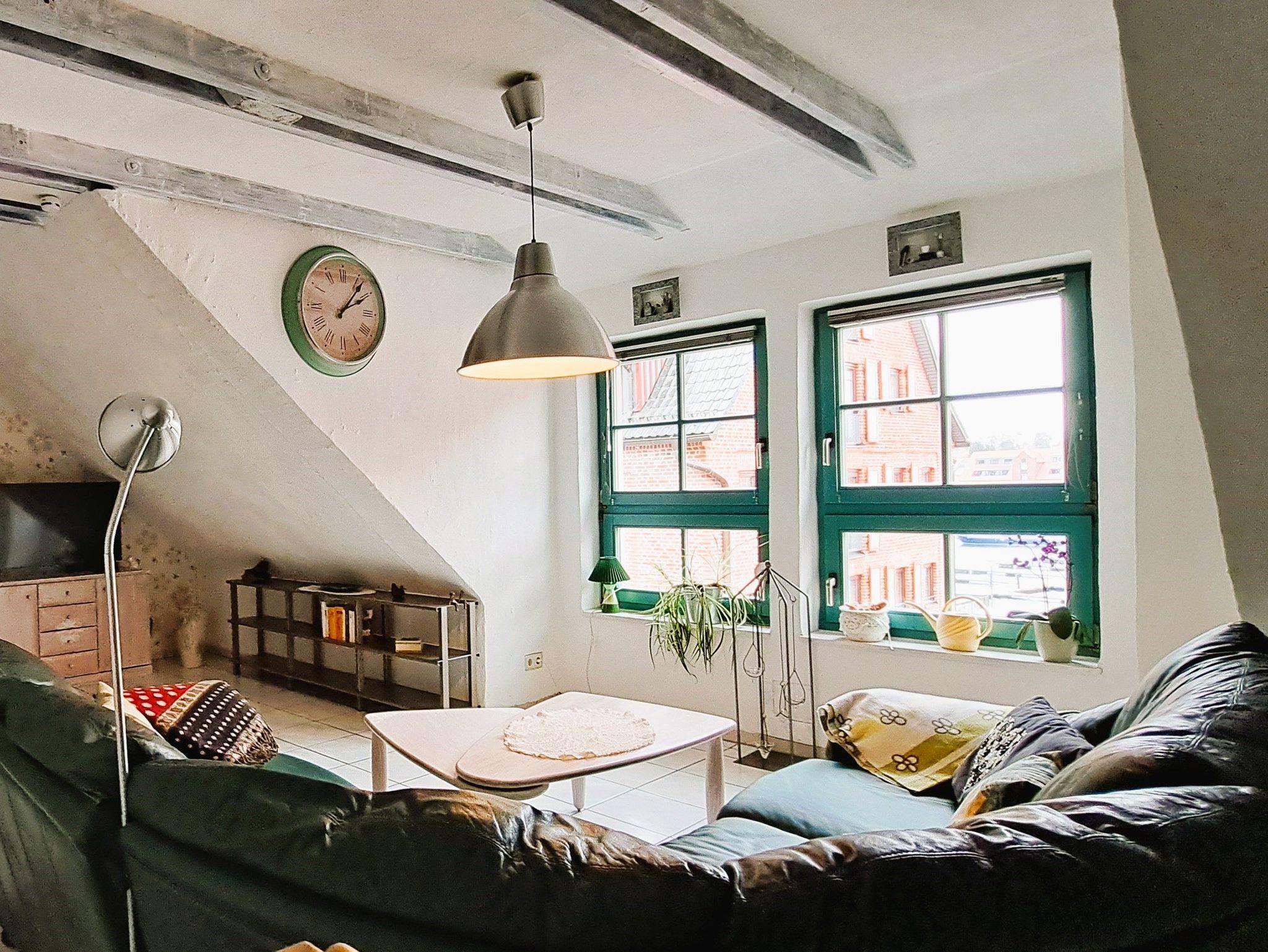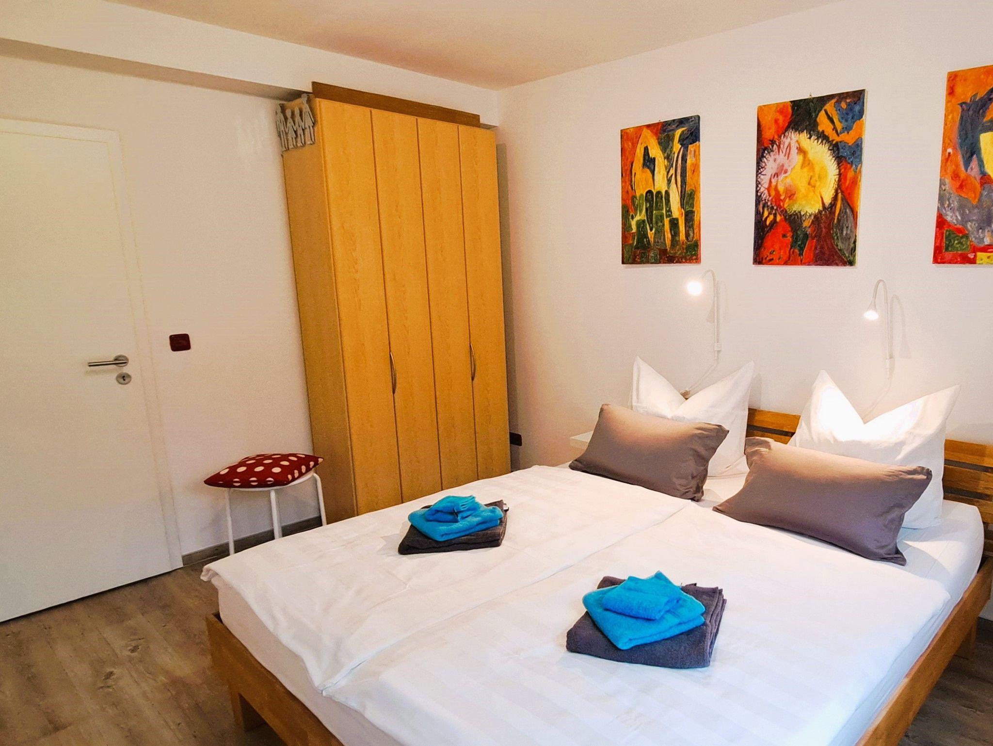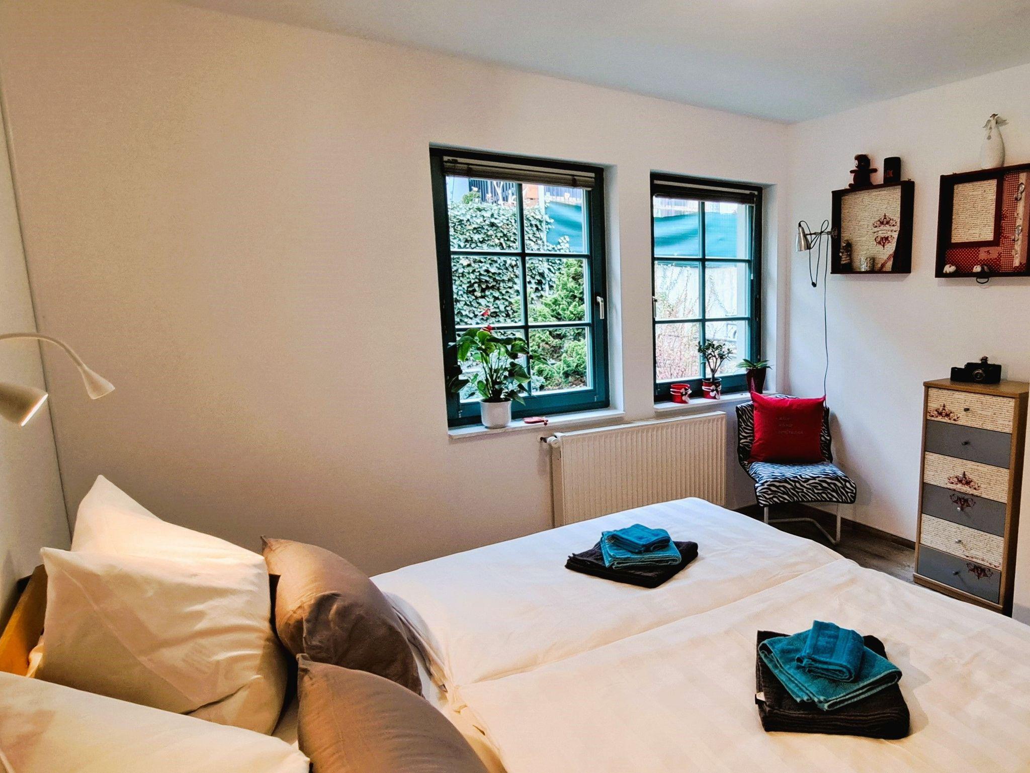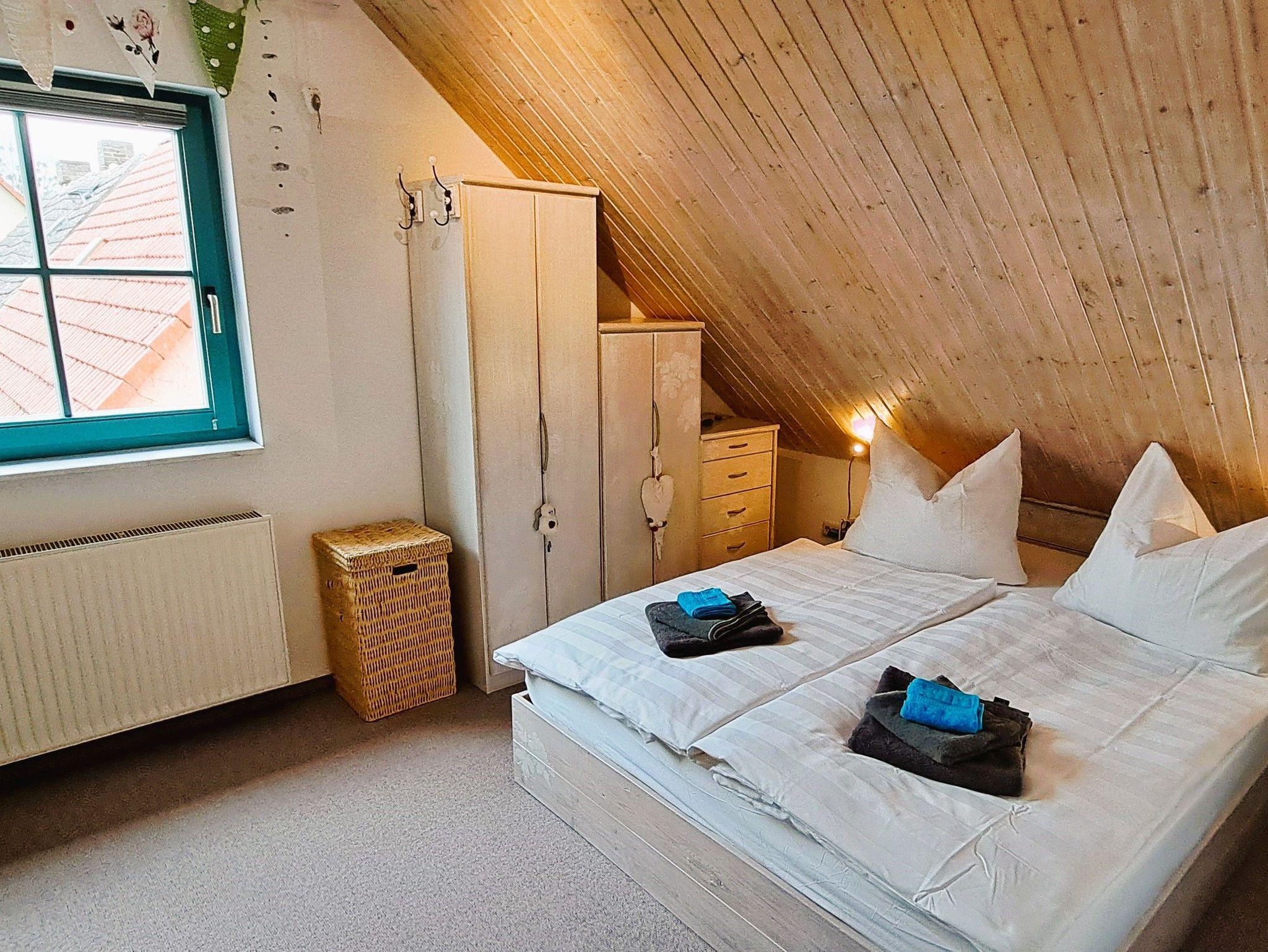 Beim Betreten werden Sie vom Wohnungsflur empfangen, der mit einem praktischen Schuhschrank und einer Garderobe ausgestattet ist. Hier finden Sie auch ein Gäste-WC mit Tageslicht und Handwaschtisch. Das erste Schlafzimmer erwartet Sie mit einem Doppelbett und einem geräumigen Kleiderschrank für Ihre persönlichen Dinge. Die geräumige und helle Wohnküche lädt zum Verweilen ein, verfügt über alle technischen Geräte und bietet Zugang zu einem kleinen Balkon mit einem eingeschränkten Ausblick auf den Hafenbereich. Über eine Ecktreppe gelangen Sie auf die zweite Ebene, wo Sie ein großzügiges Wohnzimmer mit einer bequemen Couchlandschaft und einem Flachbild-TV erwartet. Das angrenzende Tageslichtbad verfügt über eine Dusche und eine separate Badewanne.Das zweite Schlafzimmer auf dieser Ebene bietet ebenfalls ein Doppelbett und ausreichend Stauraum in einem weiteren Kleiderschrank.Die Einrichtung der Wohnung ist einladend und freundlich gestaltet, mit einem Hauch von Vintage und bunten Akzenten, die für eine gemütliche Atmosphäre sorgen. Eine Kaution von 150,00 Euro wird beim Gastgeber hinterlegt per Überweisung und nach Abreise zurücküberwiesen.