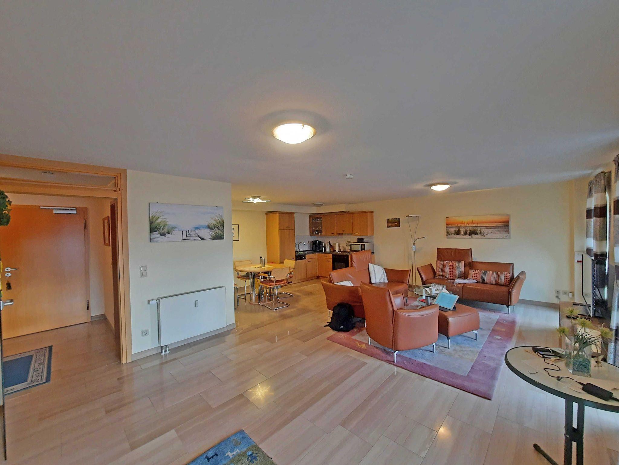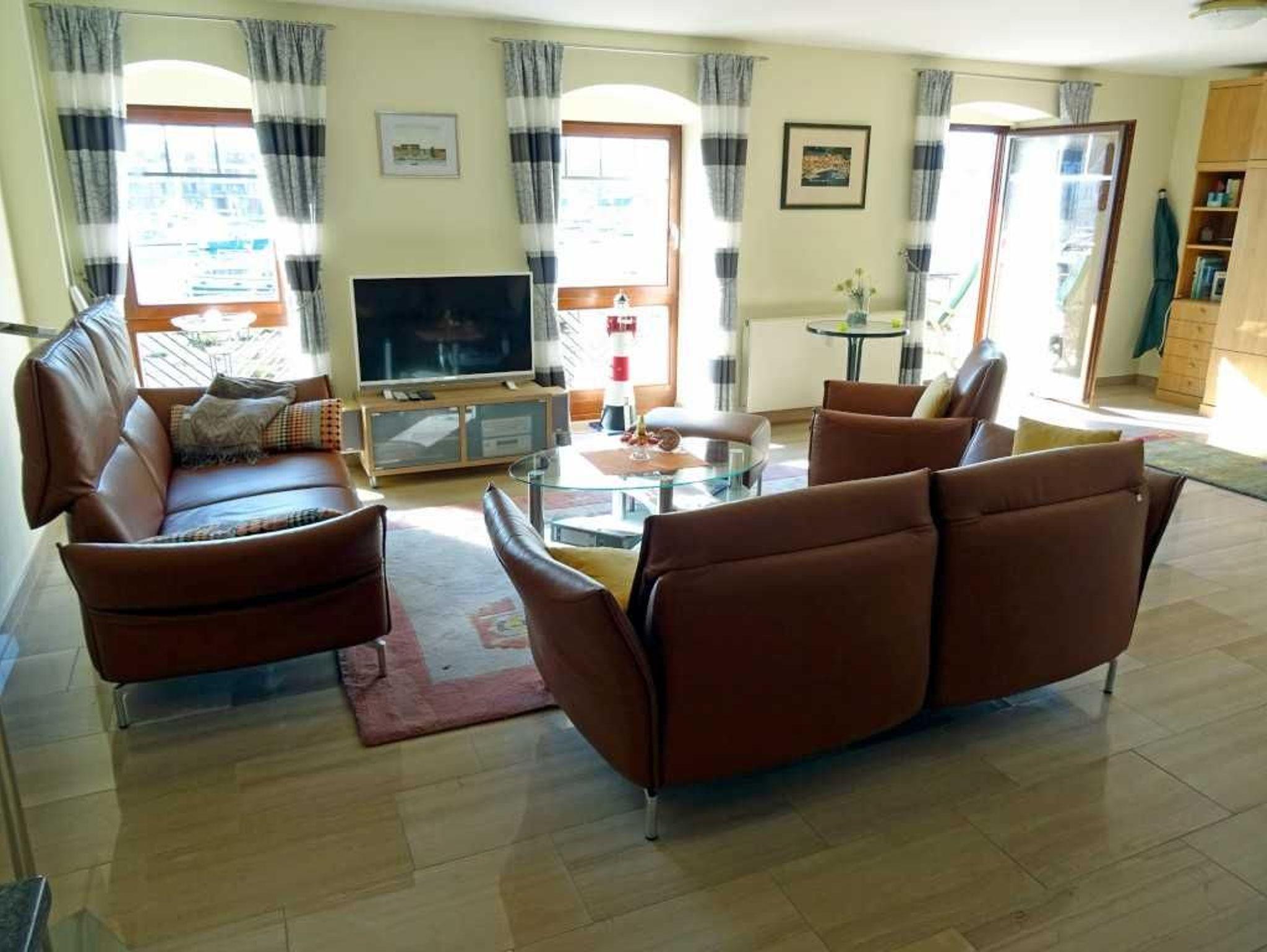 Im Wohnbereich lädt eine bequeme Ledersitzgruppe zum Verweilen ein. Neben dem einzigartigen Blick aus den Fenstern steht Ihnen natürlich ein Fernseher mit Kabelempfang, eine HiFi-Anlage sowie ein DVD-Player zur Verfügung. W-Lan steht in der ganzen Wohnung zur Verfügung.