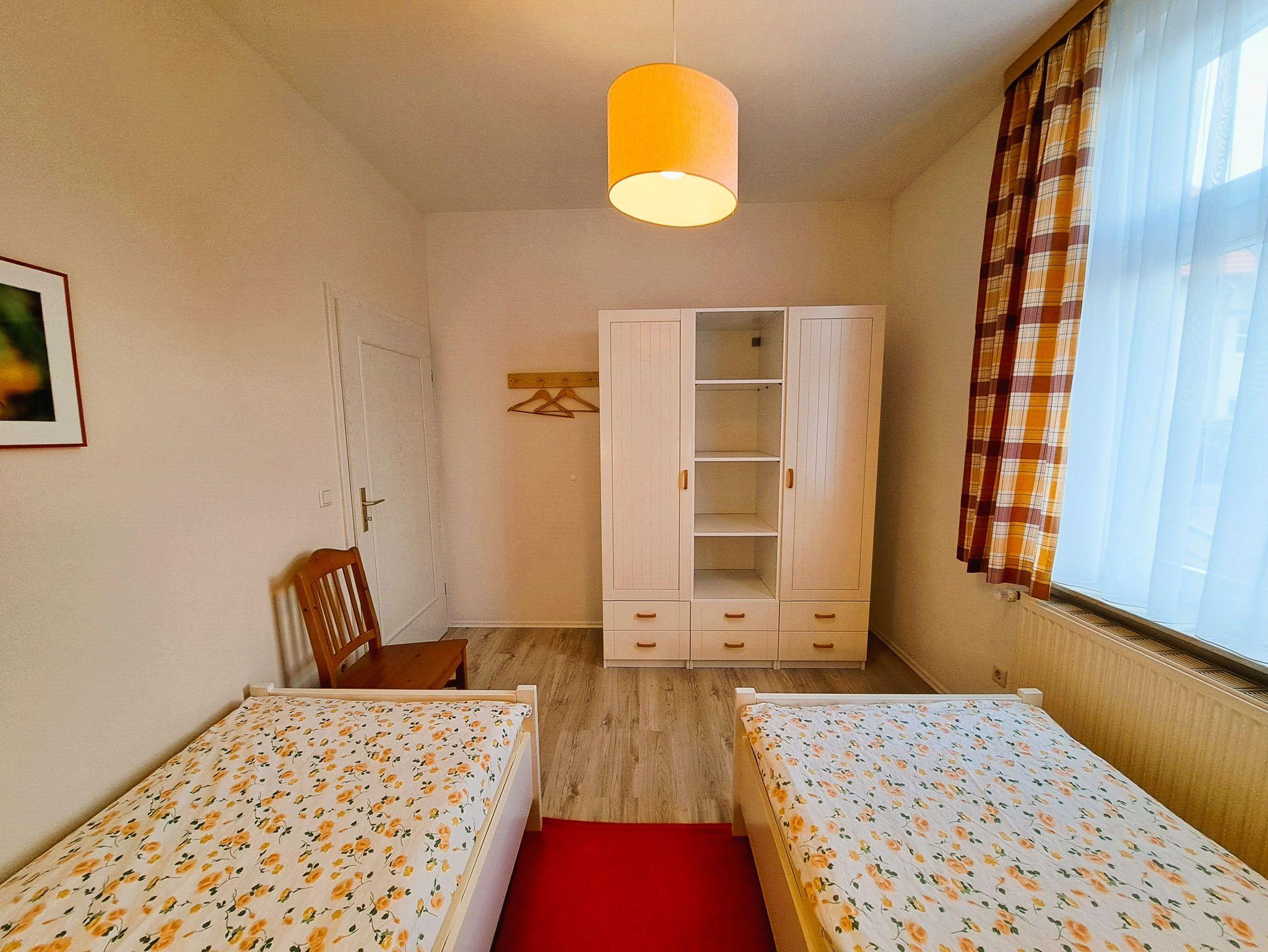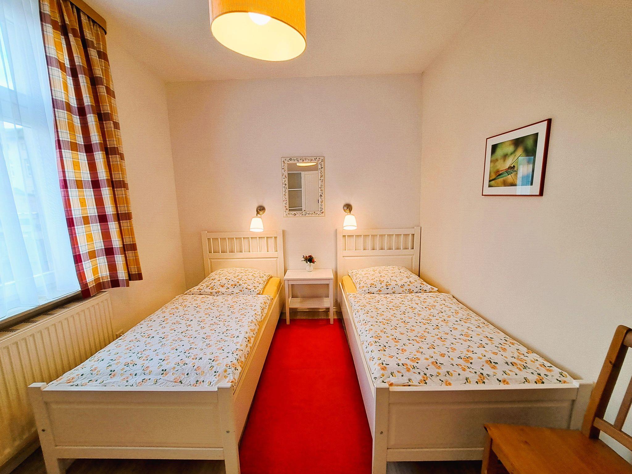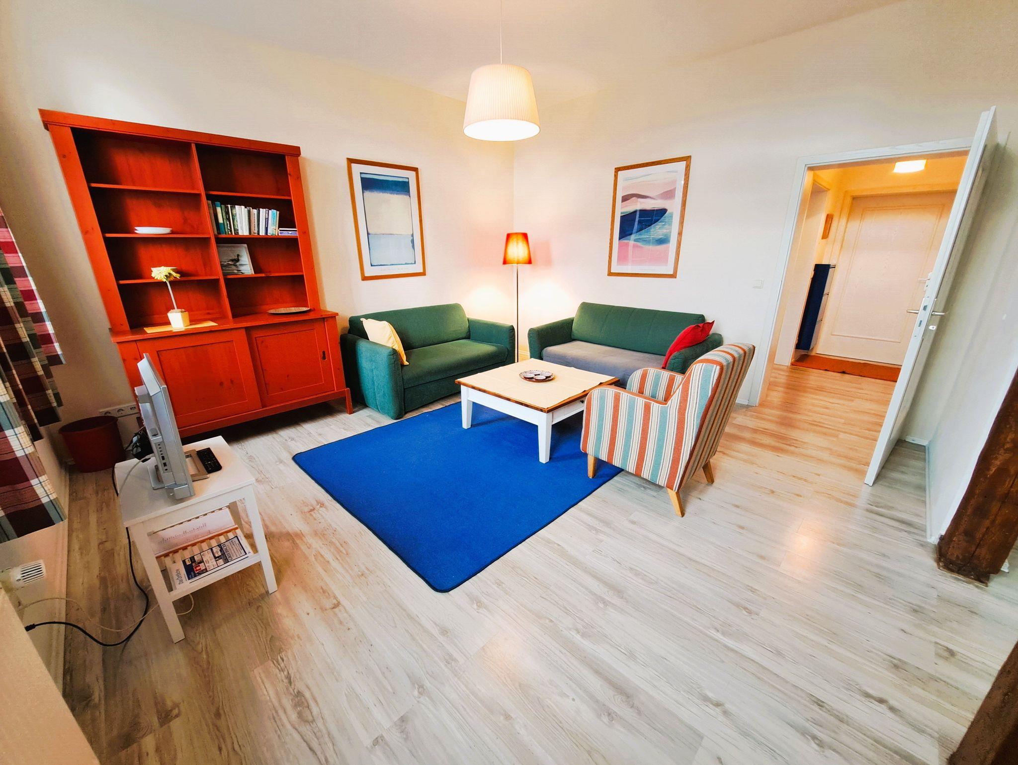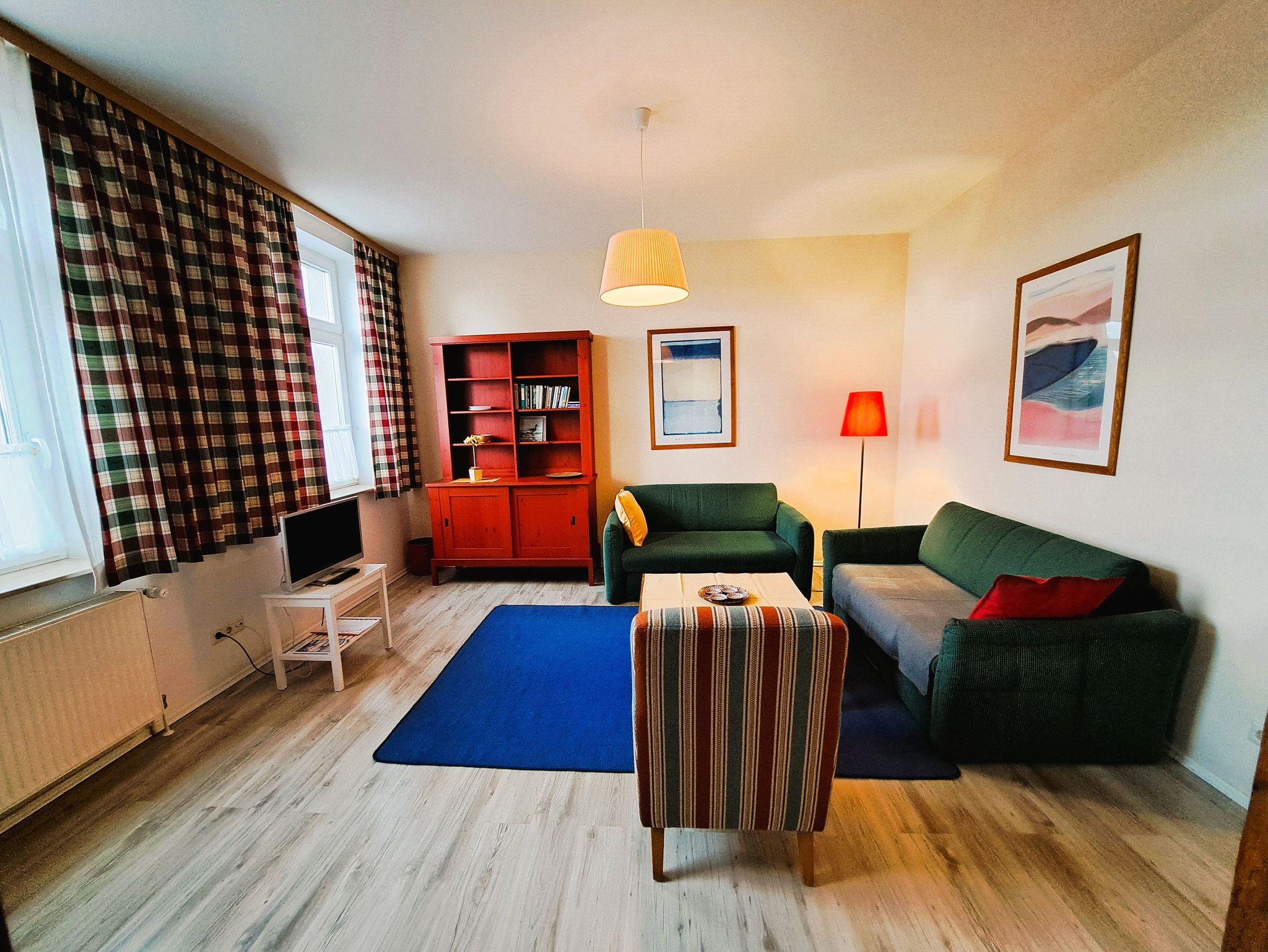 Die barrierefrei erreichbare Ferienwohnung im Erdgeschoss hat eine gemütliche und moderne Ausstattung und einen Panoramablick auf den Yachthafen und die Binnenmüritz vom Wohnzimmer aus. Das Wohnzimmer ist ausgestattet mit einer Einbauküchenzeile, Schlafsofa (3. Person), Esstisch und FlachTV. Der Schlafraum befindet sich auf der Hofseite mit zwei Einzelbetten, Nachttischen, Leselampe und Kleiderschrank. WLAN steht Ihnen kostenfrei zur Verfügung. Auf Anfrage stehen Kinderbett und Hochstuhl für Kinder bis 3 Jahren zur Verfügung (Bitte vor Anreise absprechen).