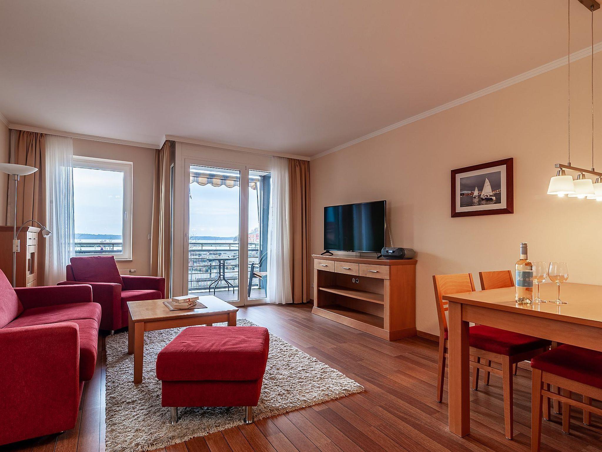 Bei der Erstellung und der Einrichtung des Neubaus wurde großer Wert auf die Bedürfnisse unserer Gäste gelegt. So verfügt das Appartement, was sich in der 1. Etage befindet, über einen unverbauten Blick direkt auf den Hafen und von Ihrem Balkon wird so mancher schöner Sonnenuntergang mit der Hafenkulisse und dem weiten Blick über die Müritz in guter Erinnerung bleiben.