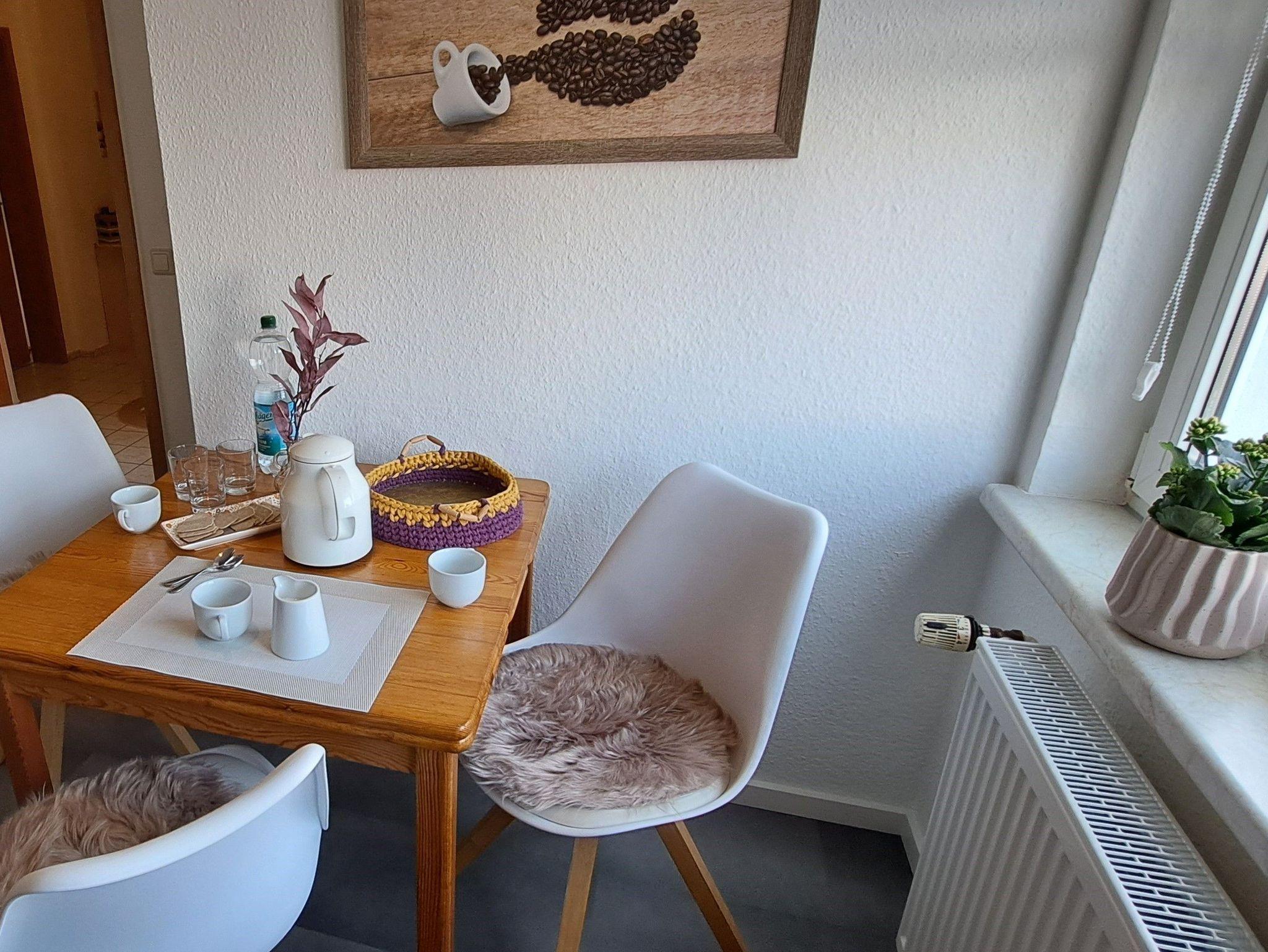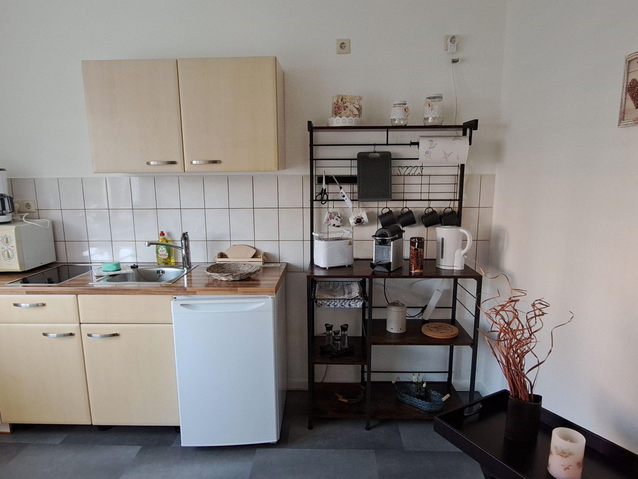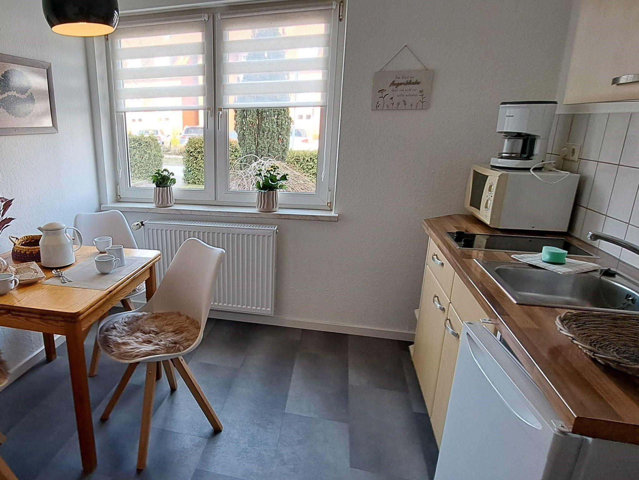Die Ferienwohnung im Erdgeschoss bietet Ihnen ein Tageslicht-Badezimmer mit Dusche und WC und eine kleine separate Küche mit 2 Ceranfelder, einer Mikrowelle, Wasserkocher, Toaster, Kapselmaschine, Kaffeemaschine und Kühlschrank mit Tiefkühlfach. Ein kleiner Esstisch für 3 Personen lädt zum Frühstücken ein. Das Wohnzimmer beinhaltet eine Couchlandschaft, TV und einen Esstisch. Hier gelangen Sie auch auf die wohnungseigene Terrasse mit Grillmöglichkeit und Sichtschutz. Das Schlafzimmer ist mit einem Doppelbett ausgestattet und Kleiderschrank. Hier kann auf Wunsch ein Reisebett inkl. Ausstattung bis 3 Jahre oder ein Gästeklappbett bis 14 Jahre gestellt werden. Bettwäsche und Handtücher als Erstausstattung können im Buchungsvorgang kostenpflichtig dazu gebucht werden.