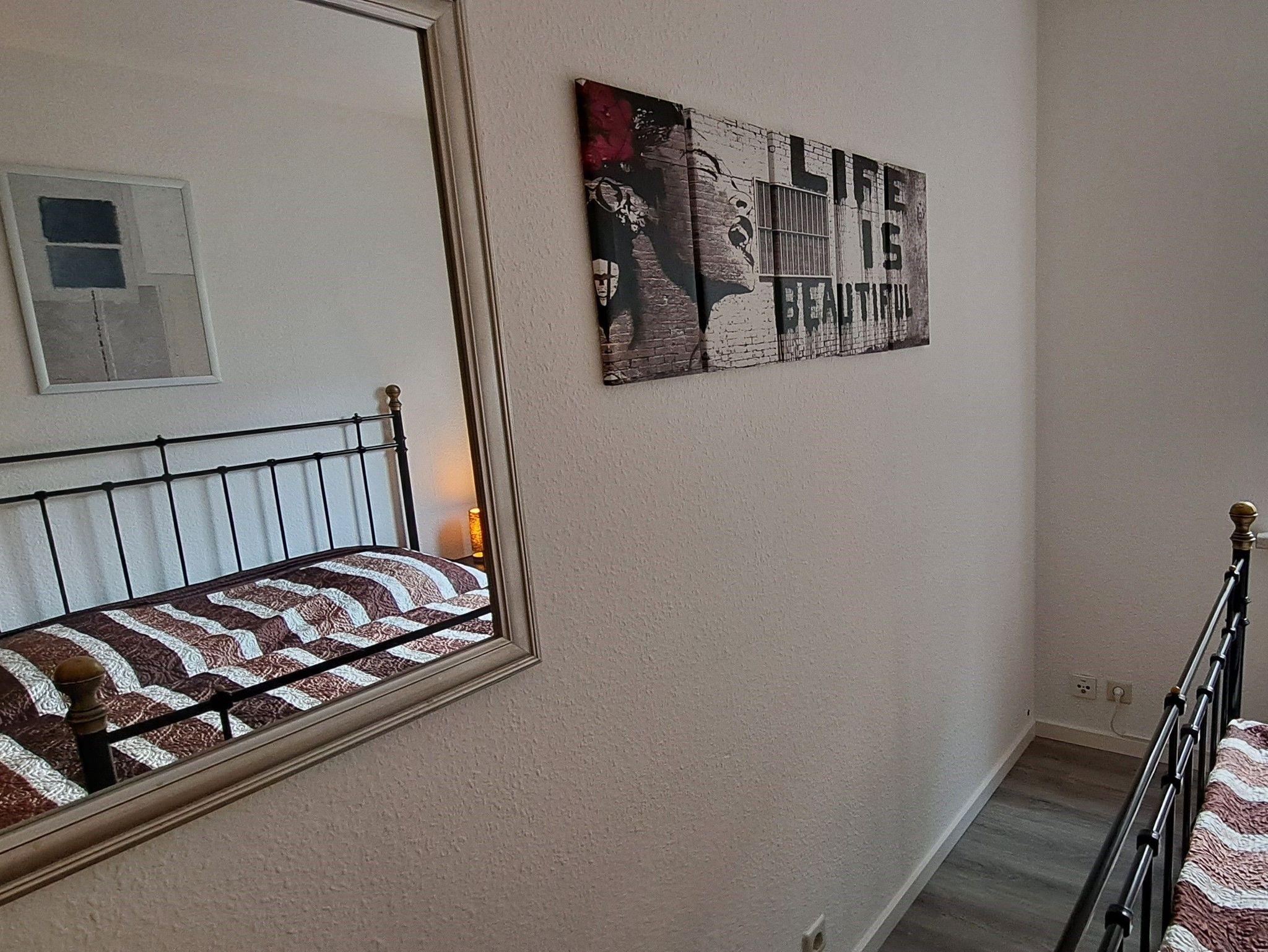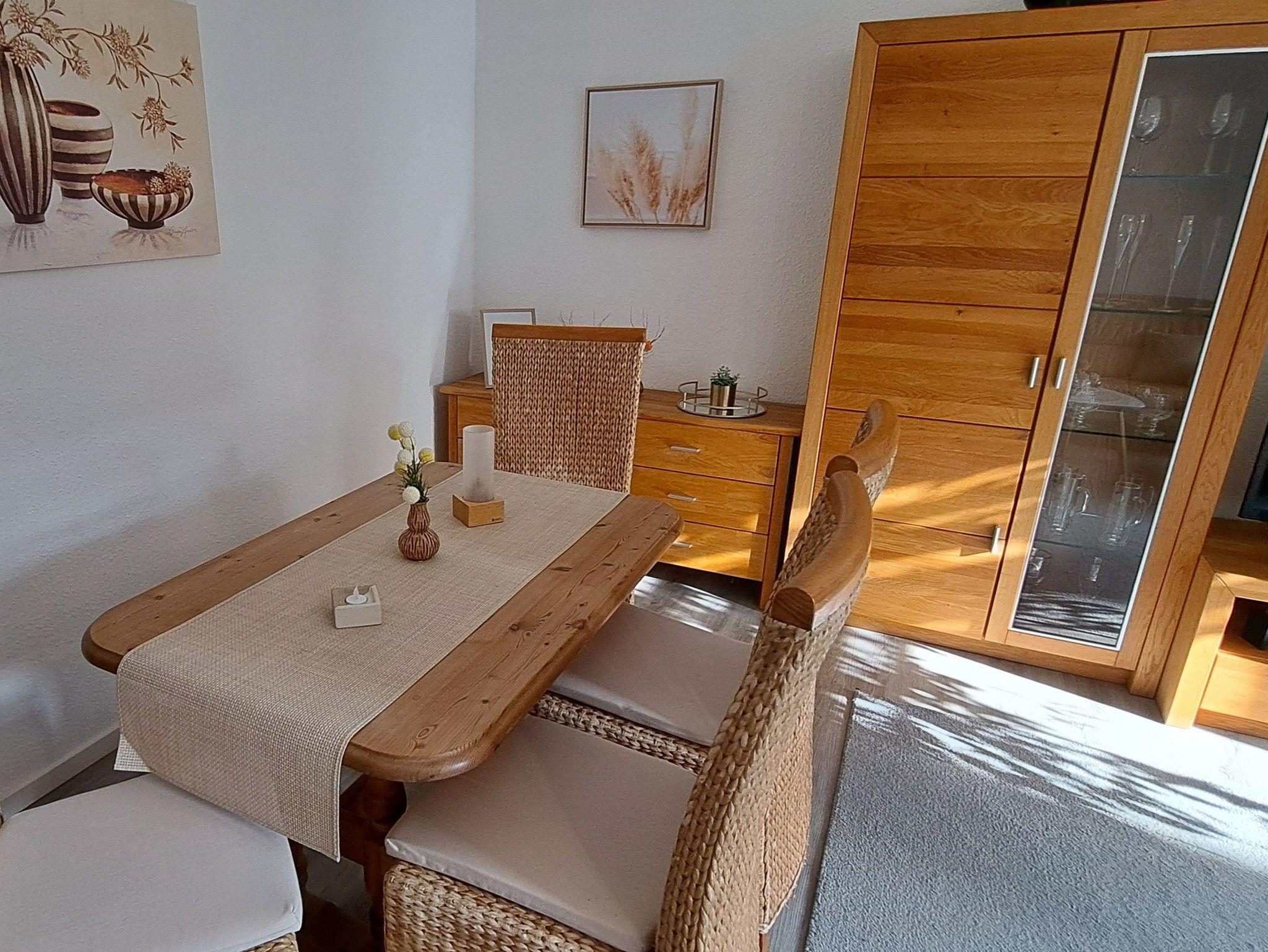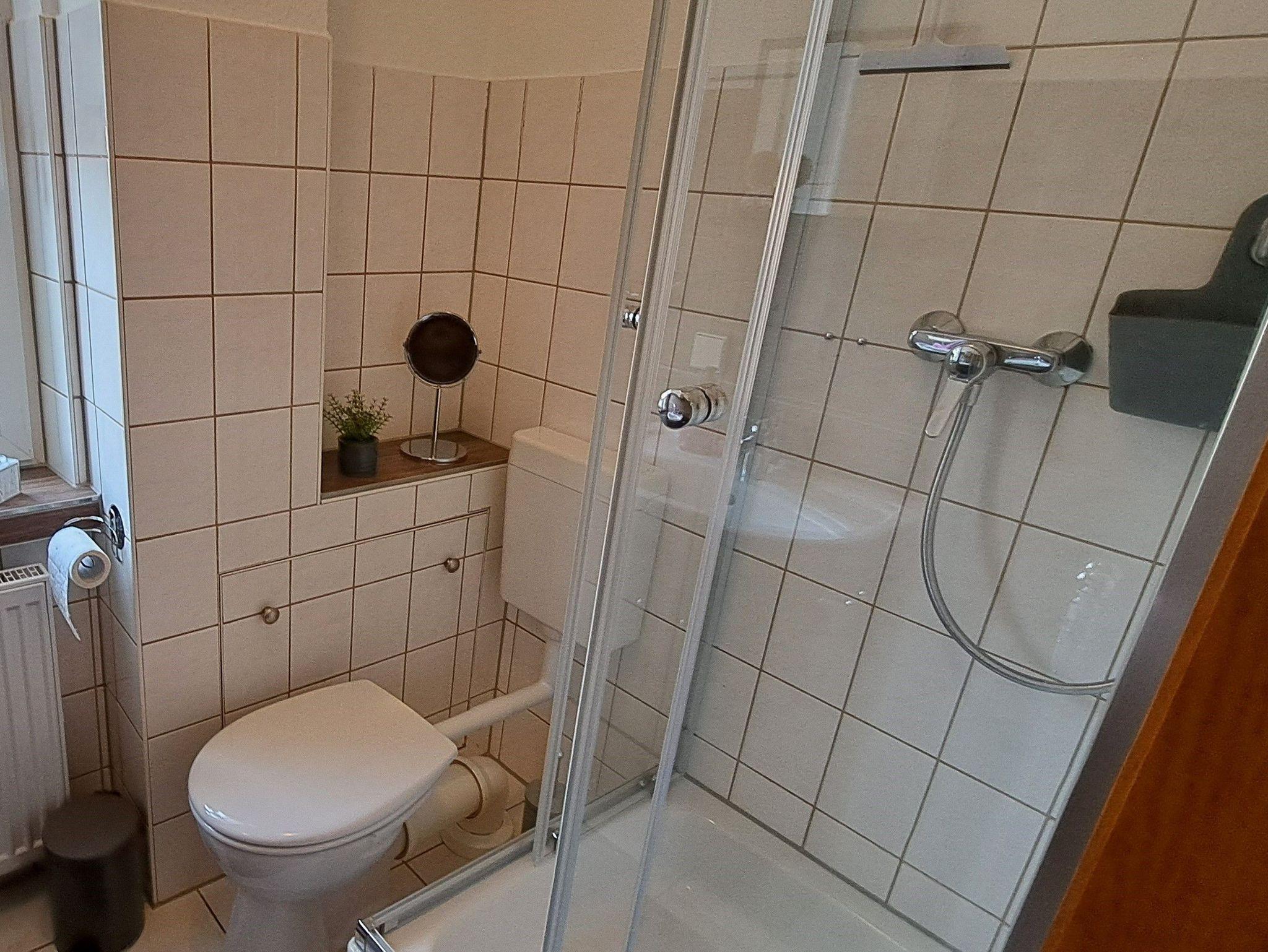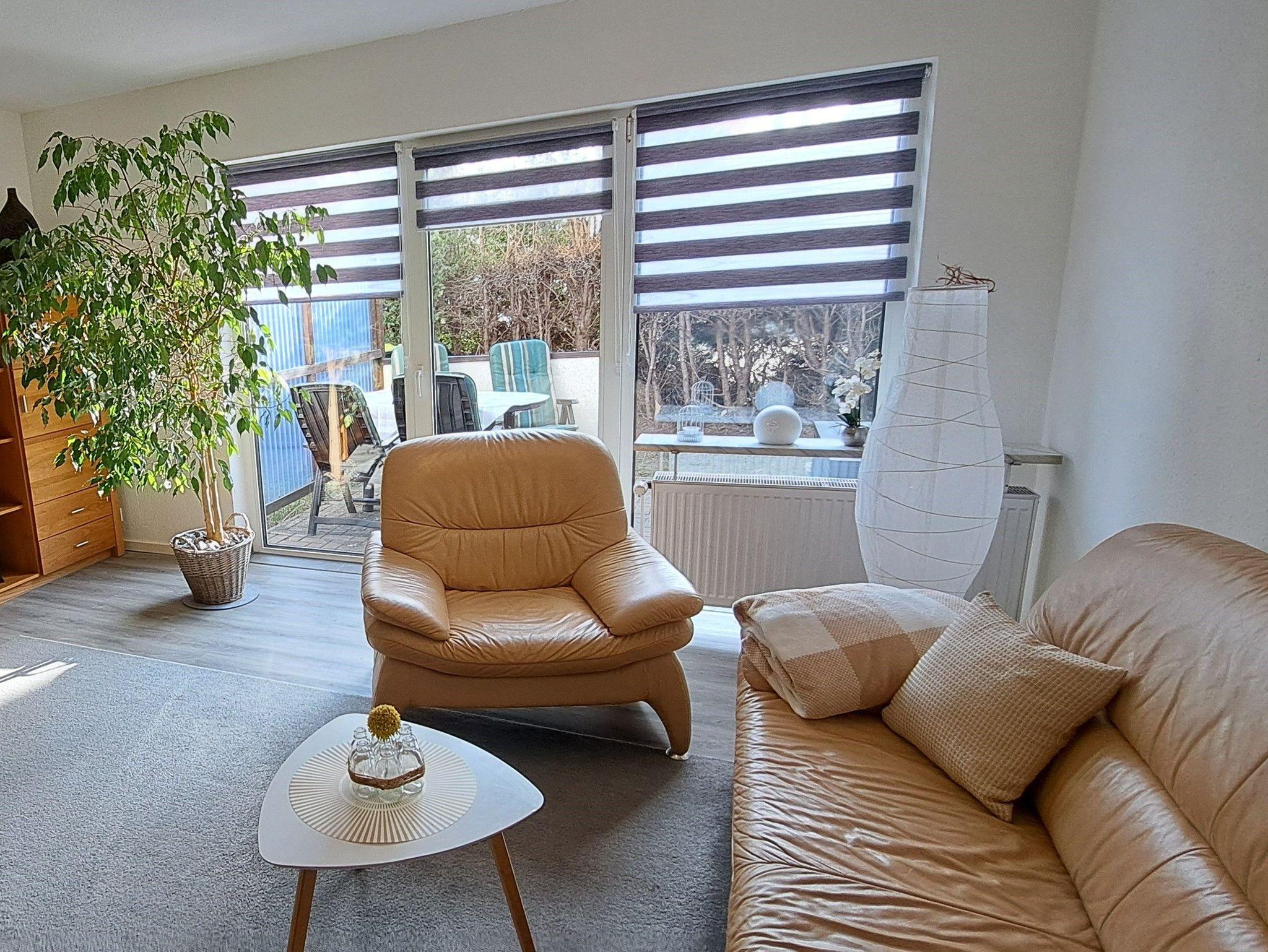 Die Ferienwohnung im Erdgeschoss bietet Ihnen ein Tageslicht-Badezimmer mit Dusche und WC und eine kleine separate Küche mit 2 Ceranfelder, einer Mikrowelle, Wasserkocher, Toaster, Kapselmaschine, Kaffeemaschine und Kühlschrank mit Tiefkühlfach. Ein kleiner Esstisch für 3 Personen lädt zum Frühstücken ein. Das Wohnzimmer beinhaltet eine Couchlandschaft, TV und einen Esstisch. Hier gelangen Sie auch auf die wohnungseigene Terrasse mit Grillmöglichkeit und Sichtschutz. Das Schlafzimmer ist mit einem Doppelbett ausgestattet und Kleiderschrank. Hier kann auf Wunsch ein Reisebett inkl. Ausstattung bis 3 Jahre oder ein Gästeklappbett bis 14 Jahre gestellt werden. Bettwäsche und Handtücher als Erstausstattung können im Buchungsvorgang kostenpflichtig dazu gebucht werden.