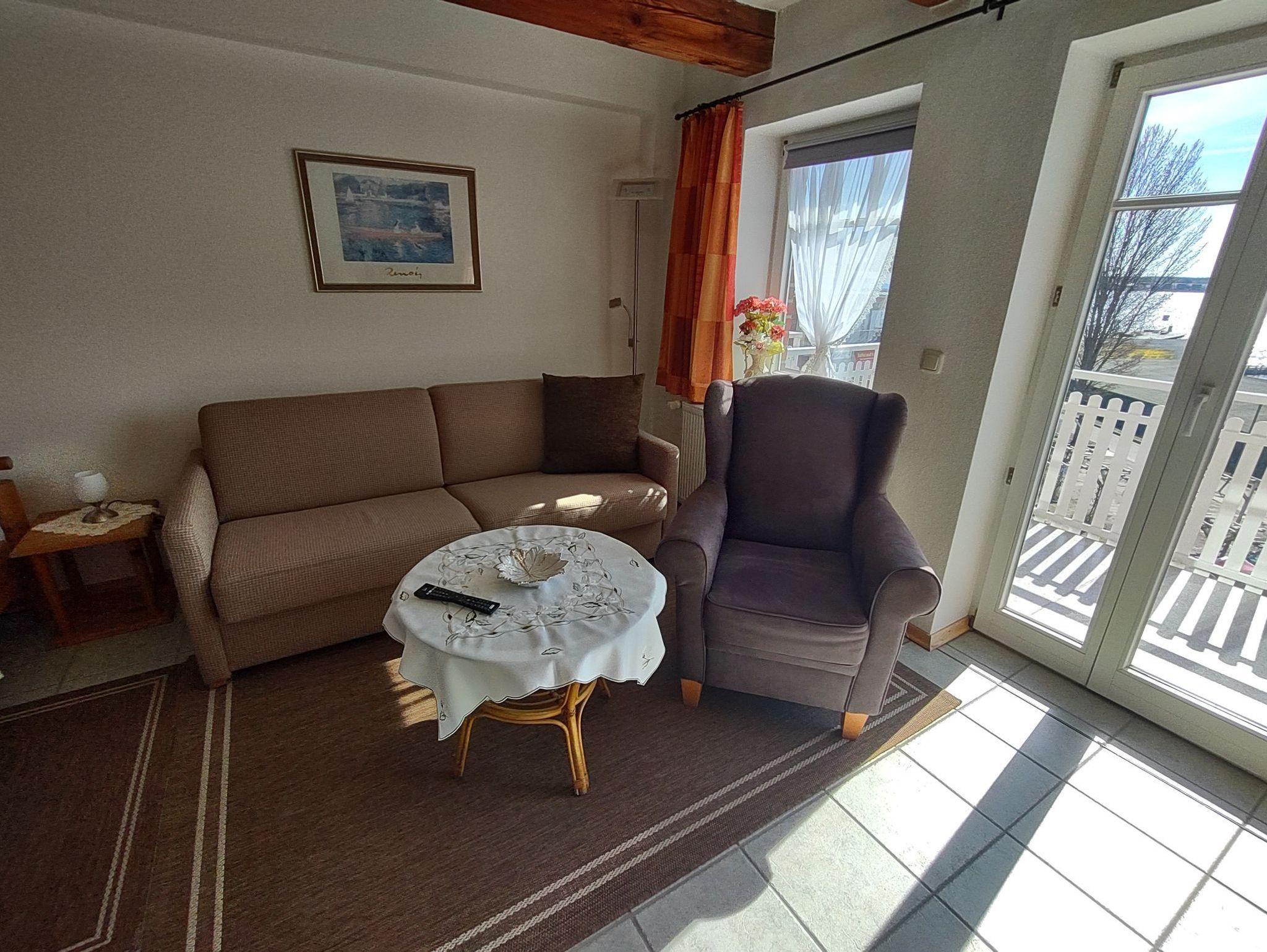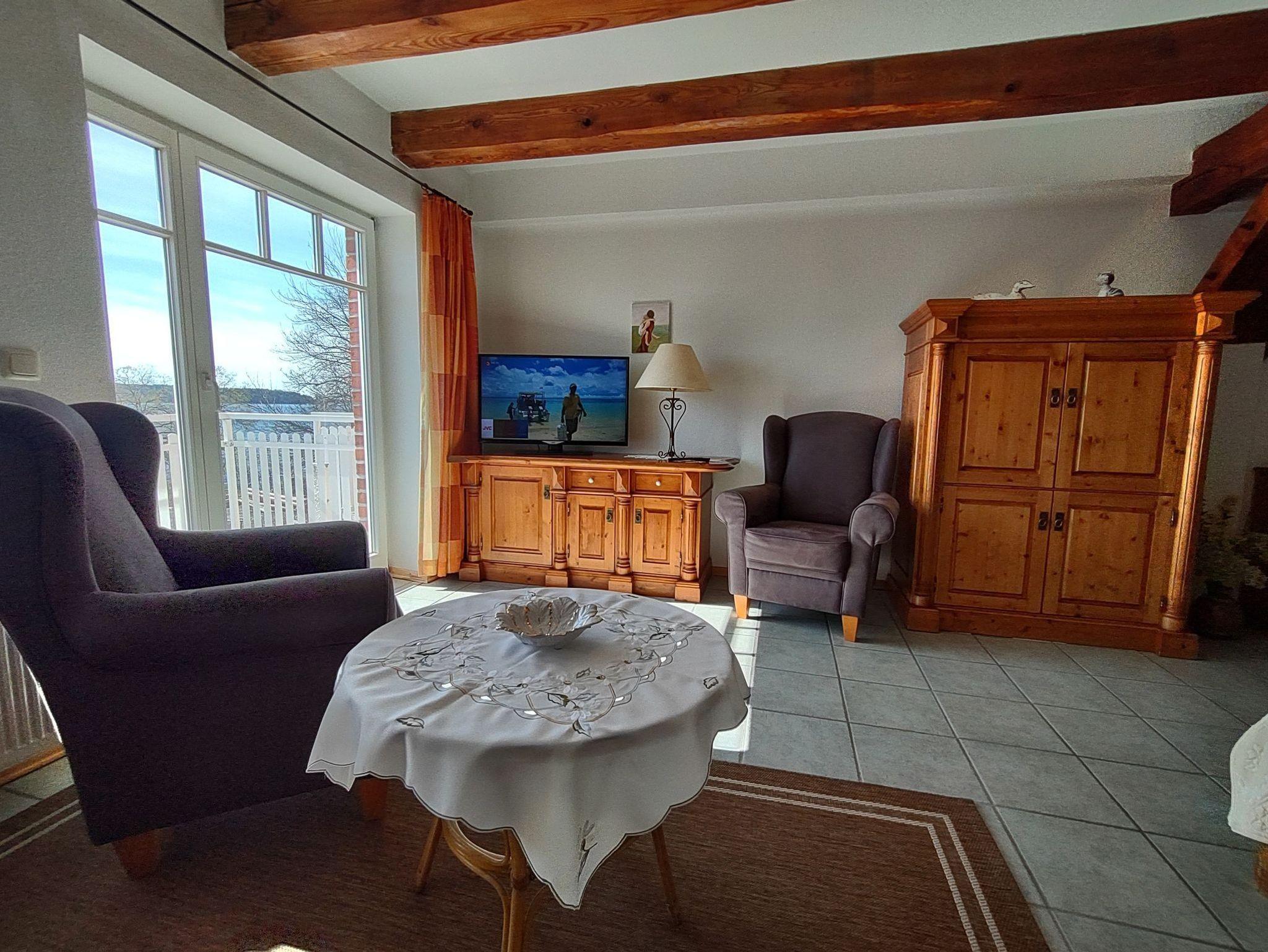 Von dem möblierten Balkon haben Sie einen wunderschönen Blick auf die Müritz. Die Ferienwohnung befindet sich in einer der besten Lagen von Waren. Die Holzmöbel harmonieren mit den schönen, alten Deckenbalken. Sie verfügt über ein Vollbad mit Dusche sowie einen großzügigen Wohnbereich mit Doppelbett, Sofa, Sessel, Kabel -TV, Radio, Esstisch und komplett ausgestatteter Küchenzeile.