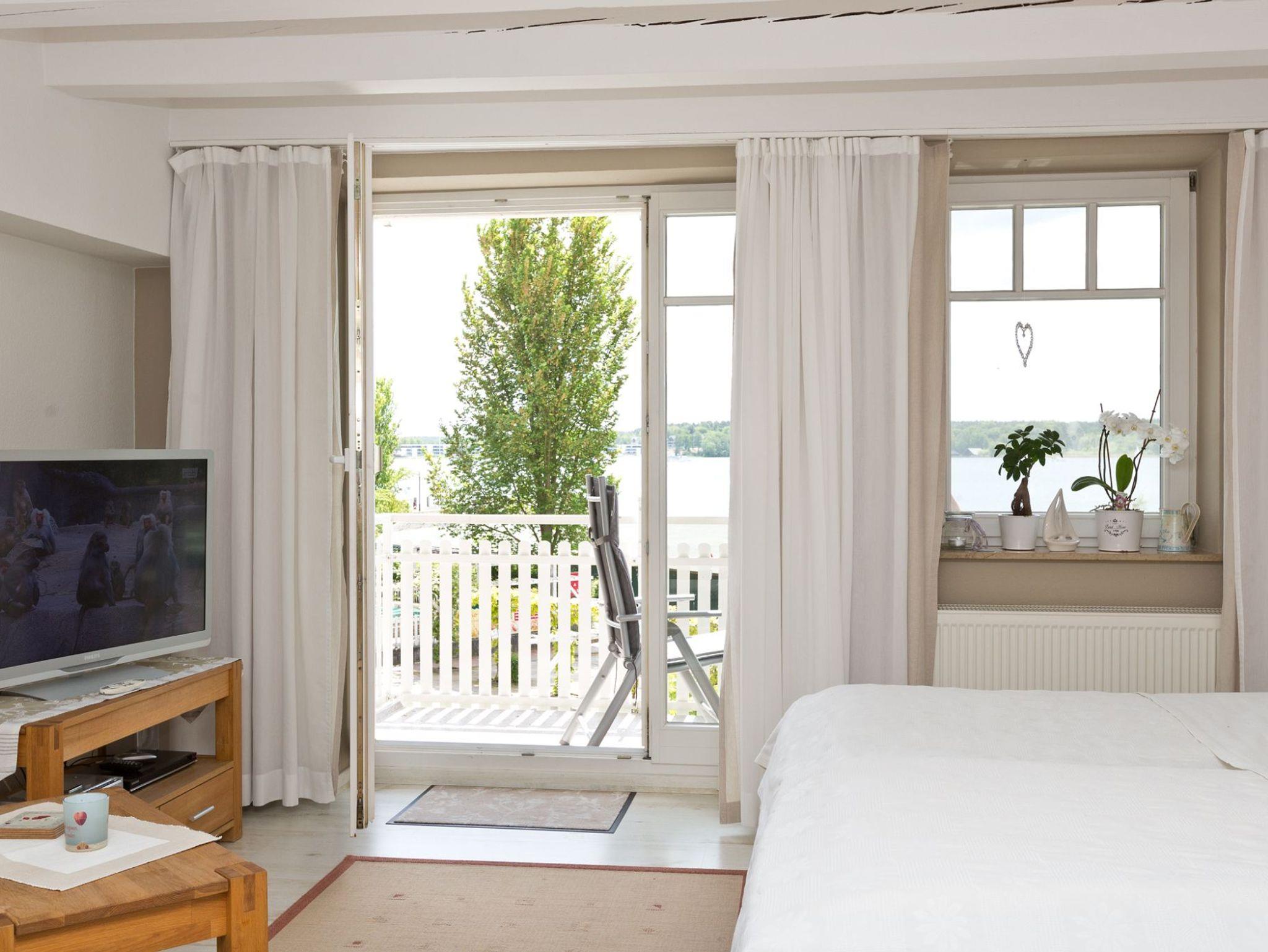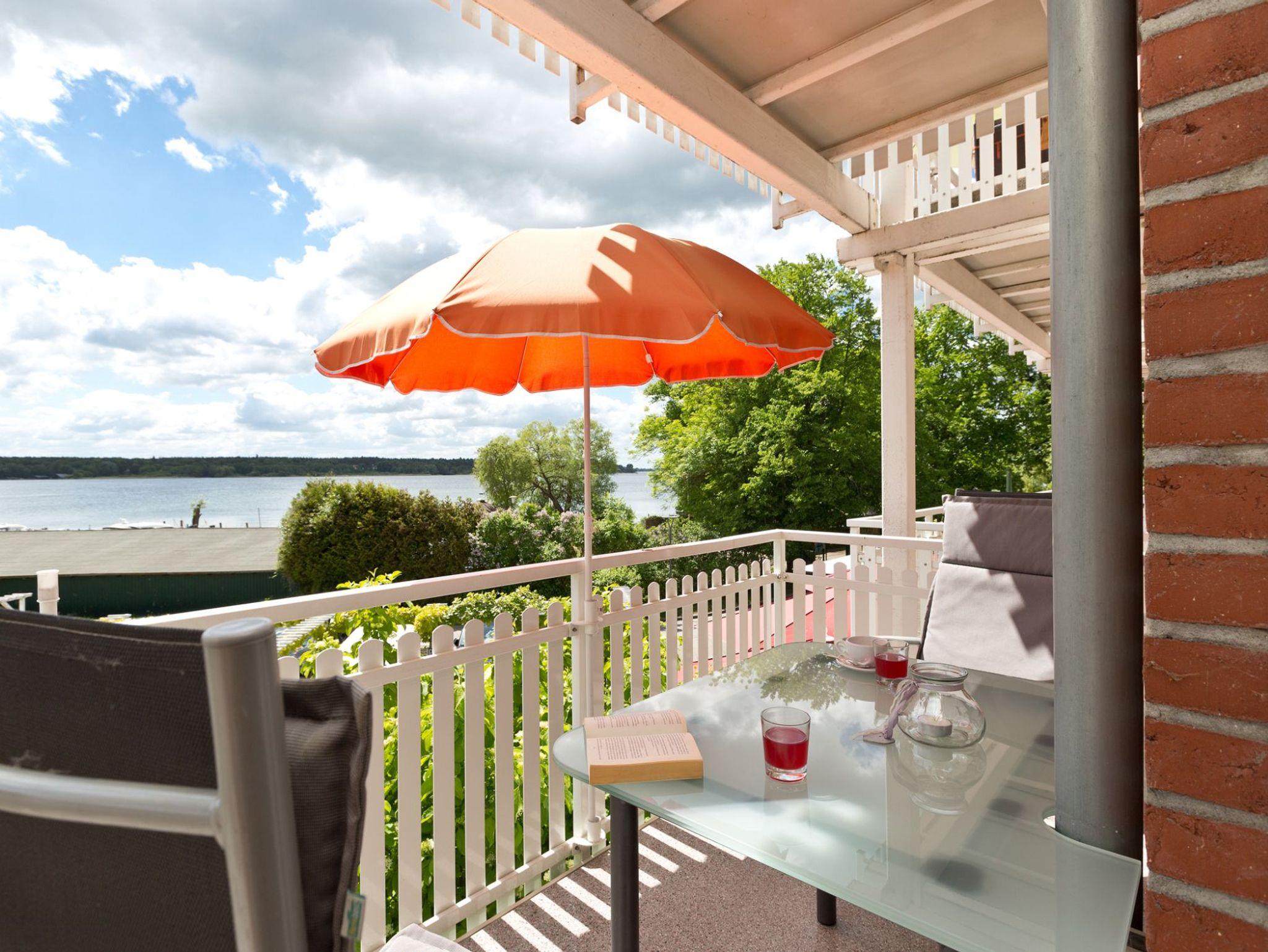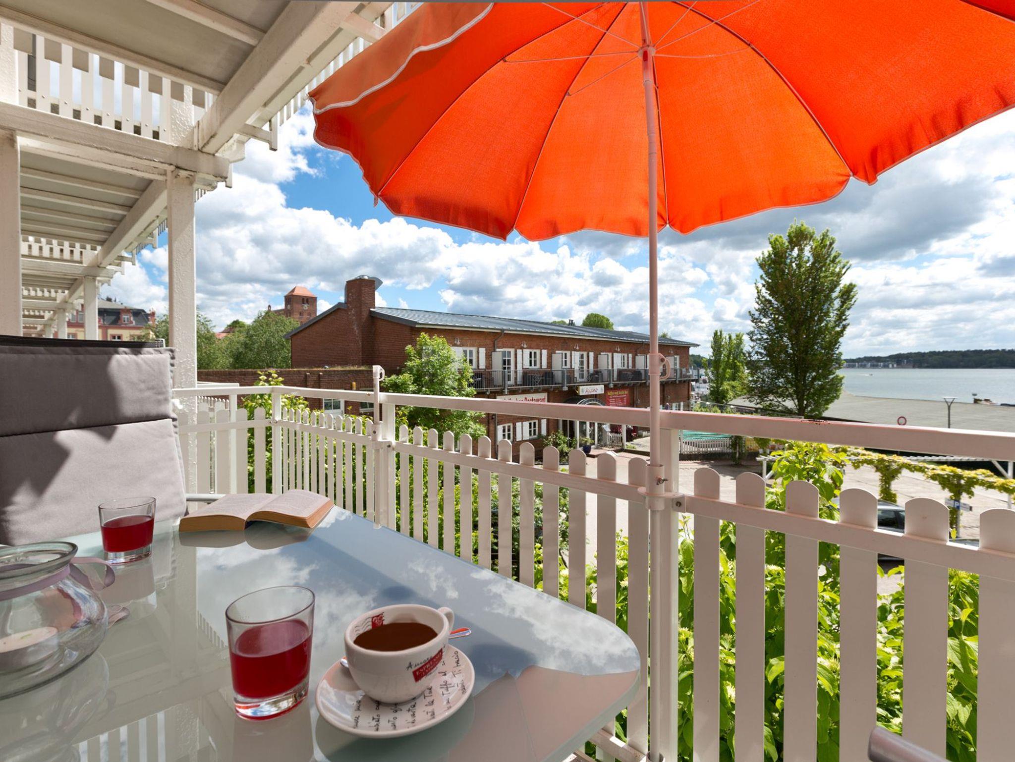 Die schöne Balkon bietet einen schönen Blick auf die Müritz und ist mit einem Sonnenschirm und Balkonmöbeln ausgestattet.