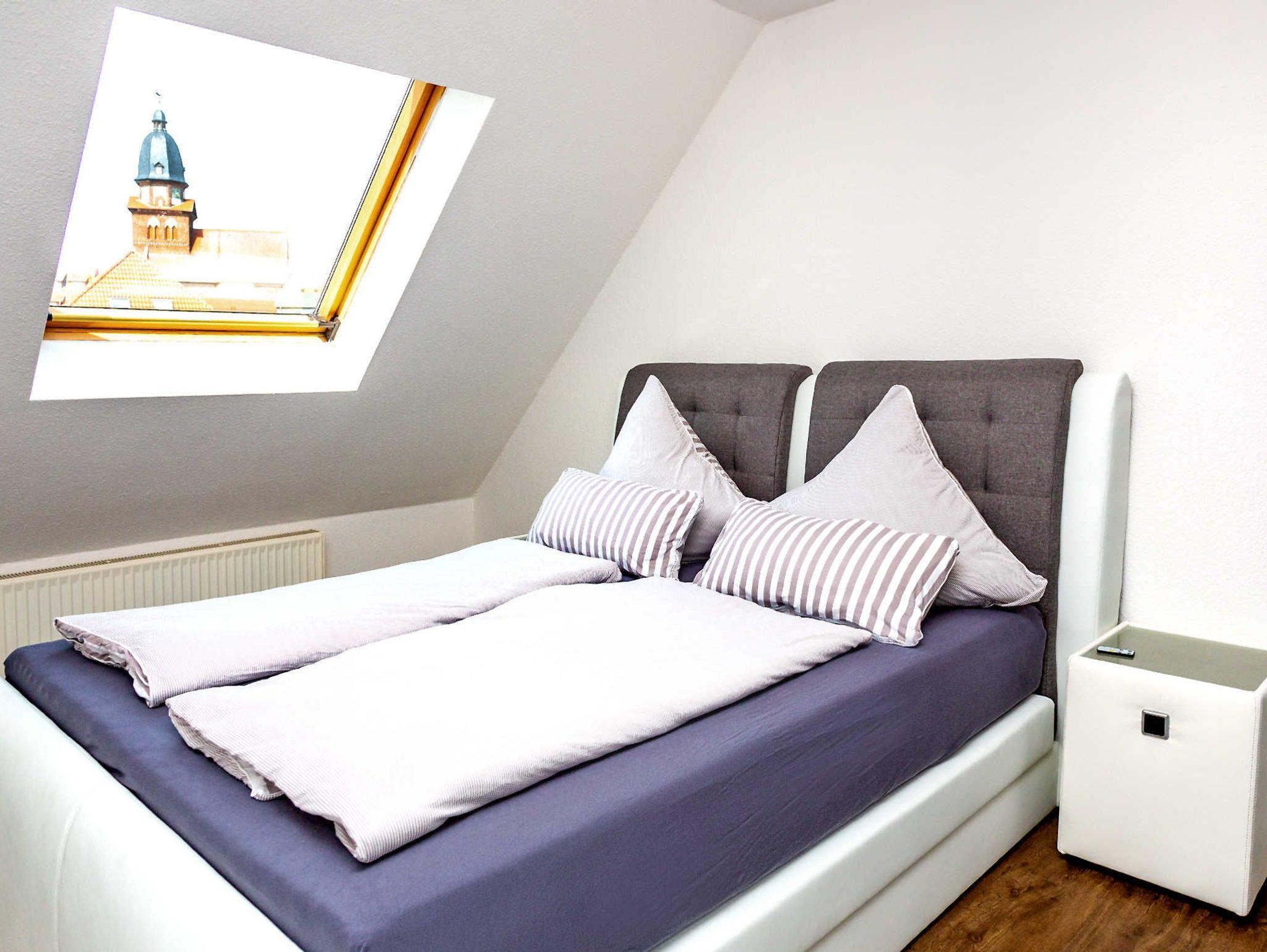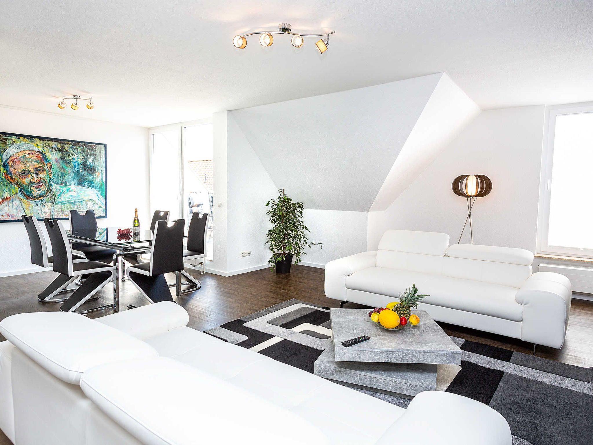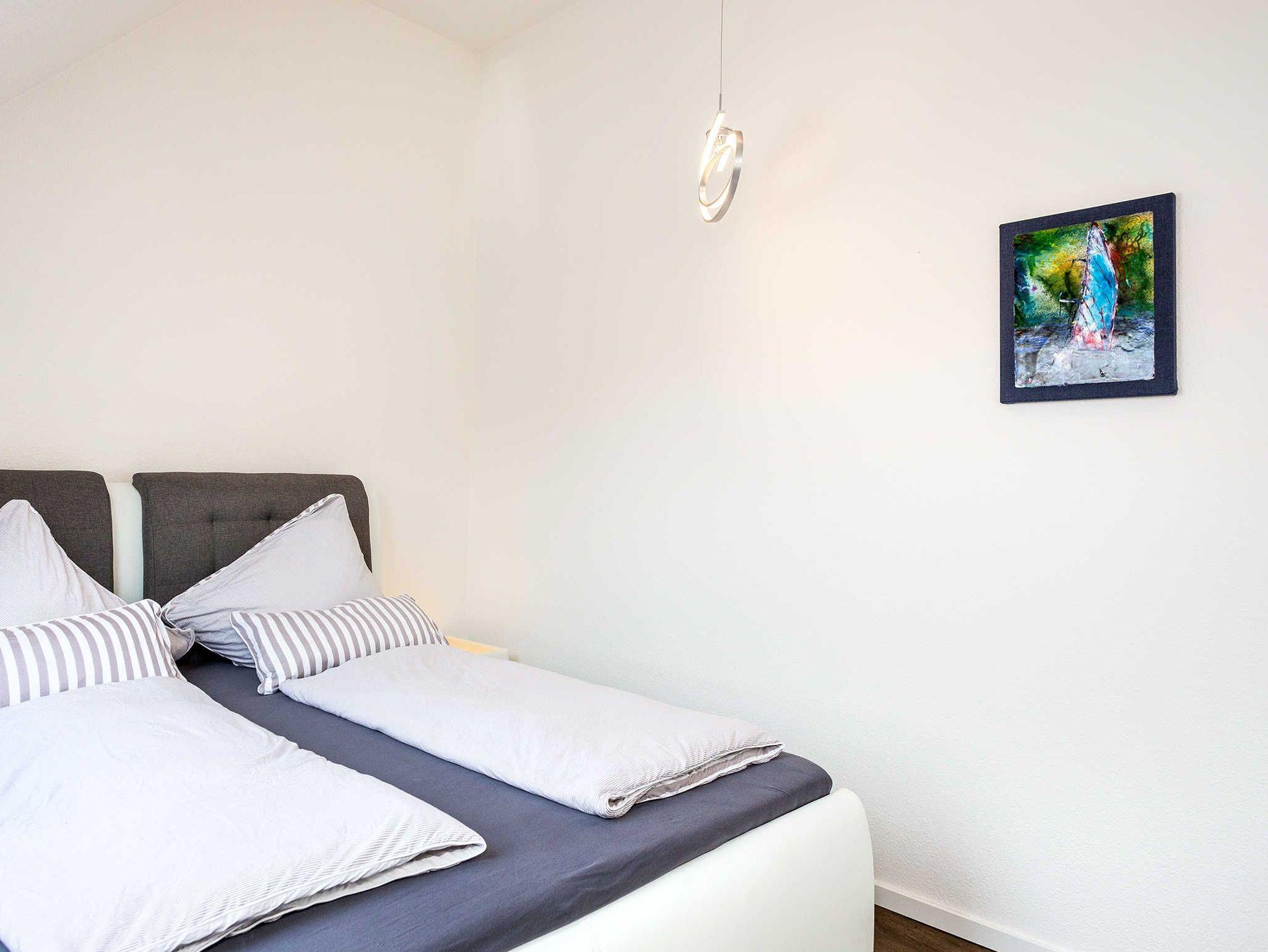 Die im Flur befindliche Treppe lässt viel Licht in den Raum und bietet den Zugang zur oberen Etage. Auf dieser Ebene findet man das zweite Schlafzimmer und ein Wannenbad mit Blick in den Himmel. In beiden Schlafzimmern ist das 5* Boxspringbett Standard. Aber auch die Aufbettungsmöglichkeit im Studio sowie in dem Wohnzimmer sind qualitativ sehr hochwertig. Rundum eine Wohnung, in der man gerne selbst wohnt.