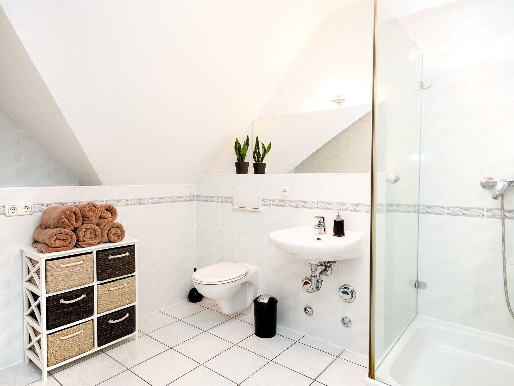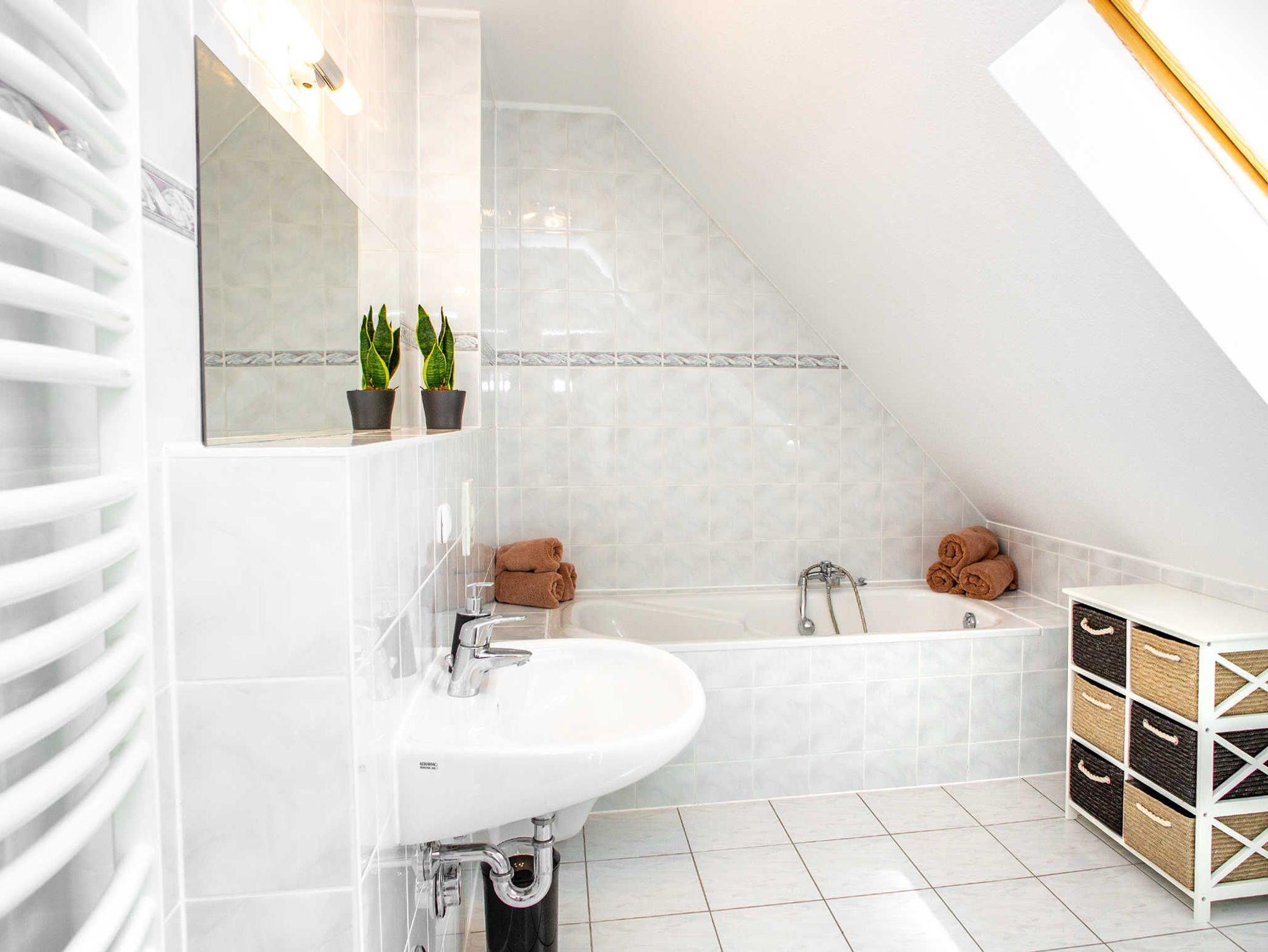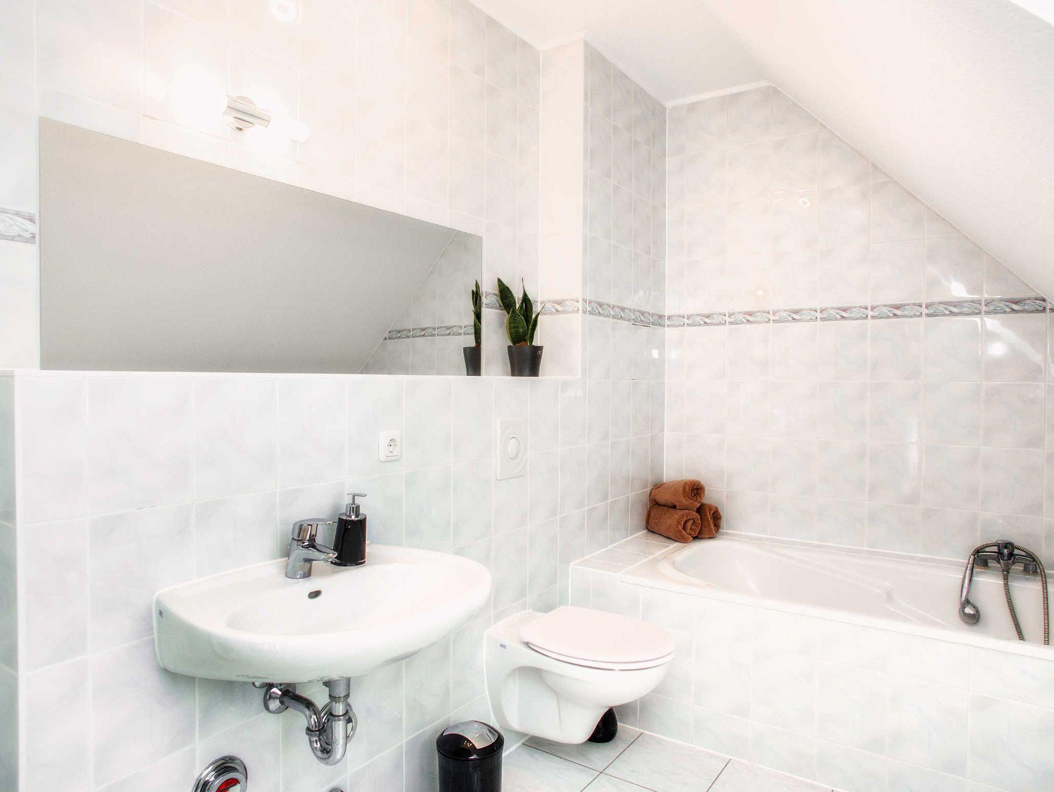 Die im Flur befindliche Treppe lässt viel Licht in den Raum und bietet den Zugang zur oberen Etage. Auf dieser Ebene findet man das zweite Schlafzimmer und ein Wannenbad mit Blick in den Himmel. In beiden Schlafzimmern ist das 5* Boxspringbett Standard. Aber auch die Aufbettungsmöglichkeit im Studio sowie in dem Wohnzimmer sind qualitativ sehr hochwertig. Rundum eine Wohnung, in der man gerne selbst wohnt.