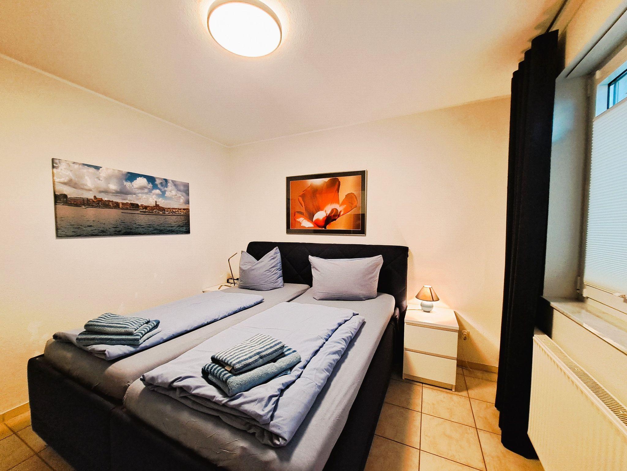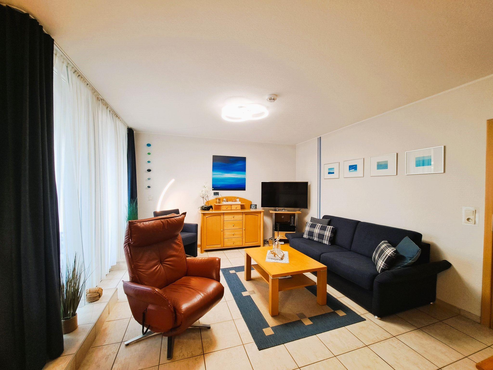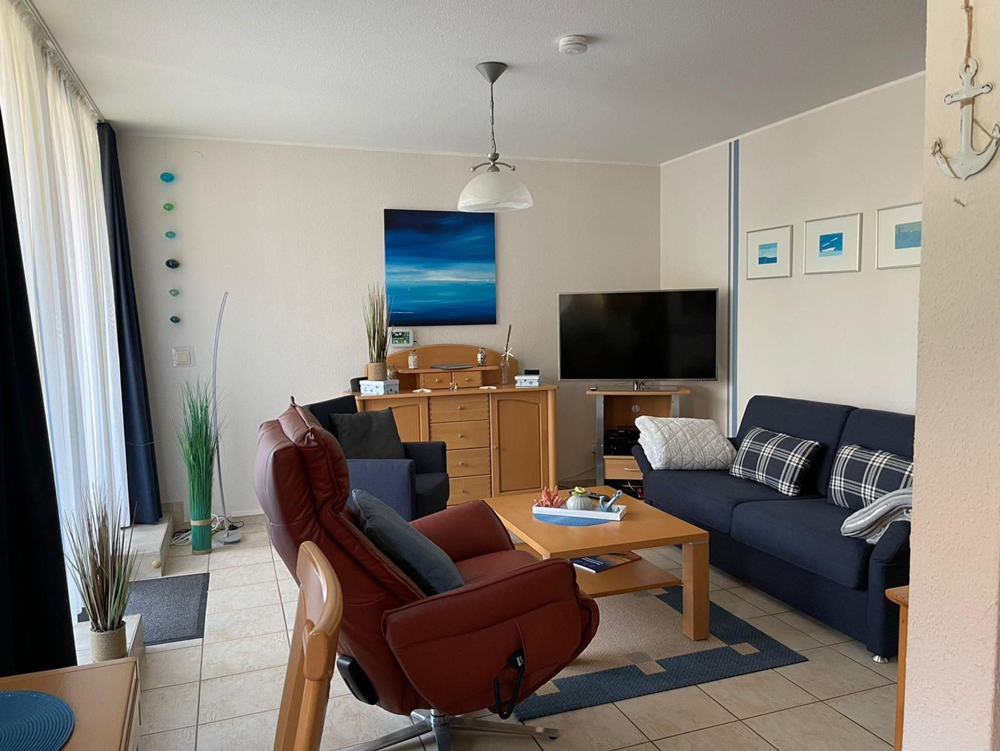 Die Ferienwohnung Zum Hafen befindet sich im Erdgeschoss des Appartementhauses Am Seeufer. Zur Wohnung gehört eine kleine Terrasse, umrahmt mit einer grünen Hecke und ausgestattet mit Sitzmöbeln. Die Wohnung ist rollstuhlgeeignet, da barrierefrei über die Terrasse erreichbar - also auch absolut behindertenfreundlich. Für einen PKW steht ein wohnungseigener Parkplatz zur Verfügung direkt auf dem Grundstück. Mitgebrachte Fahrräder können im gemeinschaftlichen Fahrradraum untergestellt werden. Zwei Fahrräder stehen Ihnen aber auch leihweise, also im Mietpreis enthalten(!), zur Verfügung. Zwei Smart-TV (im Wohnzimmer steht ein elektrisch einstellbarer Lederfernsehsessel dazu bereit) und auch im Schlafzimmer (hier von zwei elektrisch einstellbaren Betten aus nutzbar) sind vorhanden - schauen Sie auch vorhandene oder mitgebrachte Bluerays oder DVDs! Ein Receiver mit Bose-Lautsprechern und ebenfalls Fernbedienung rundet die Technik ab. In der Küche Kitchen-Aid Geräte, Geschirrspüler usw. stehen zur Verfügung. Selbst eine eigene Waschmaschine kann genutzt werden. Schließlich verhindern elektrisch bedienbare Sonnenjalousien an der großen Fensterfront thermische Aufheizungen in der Wohnung. Sie werden zudem weiteren Komfort in der Wohnung entdecken!
