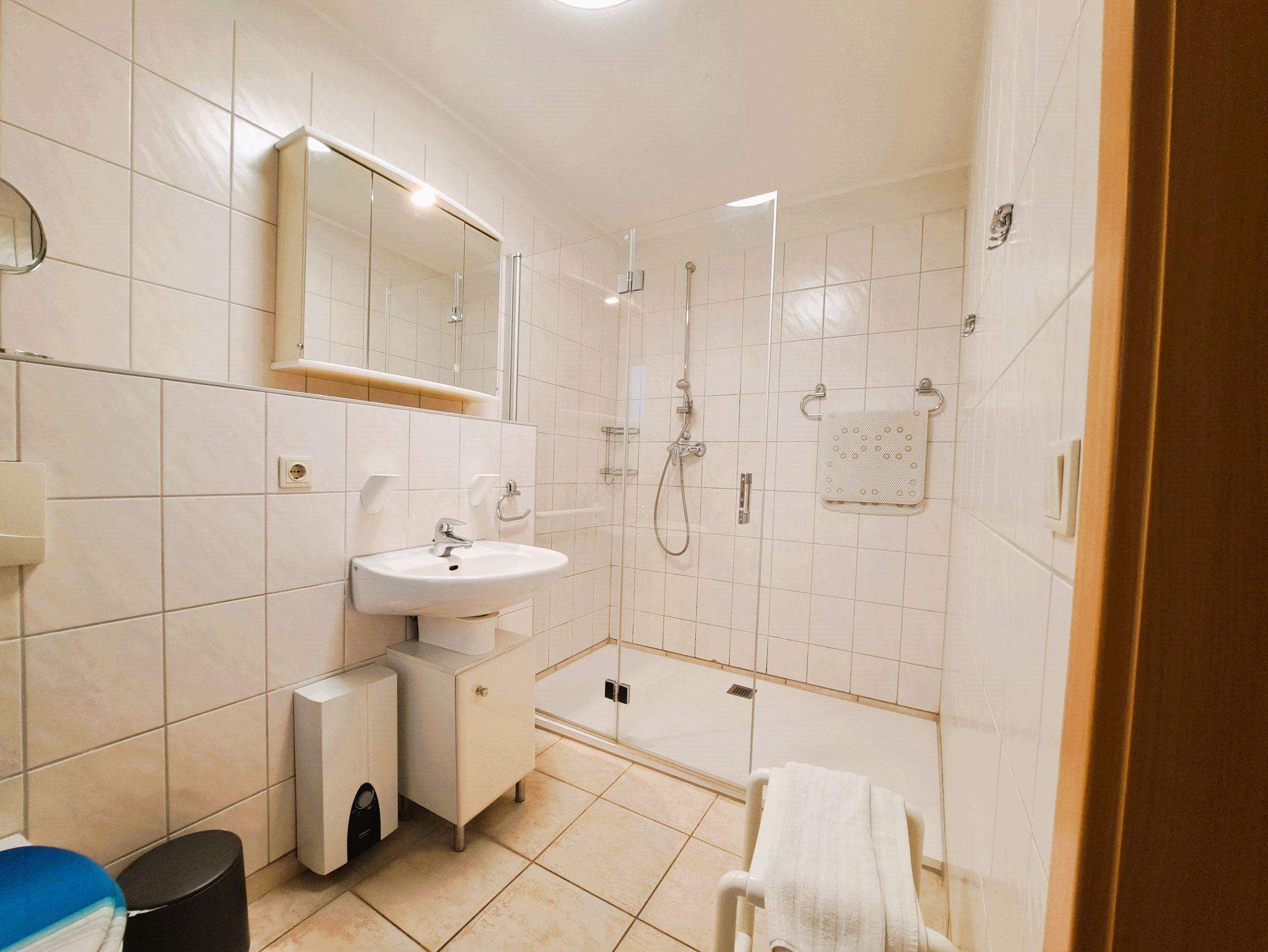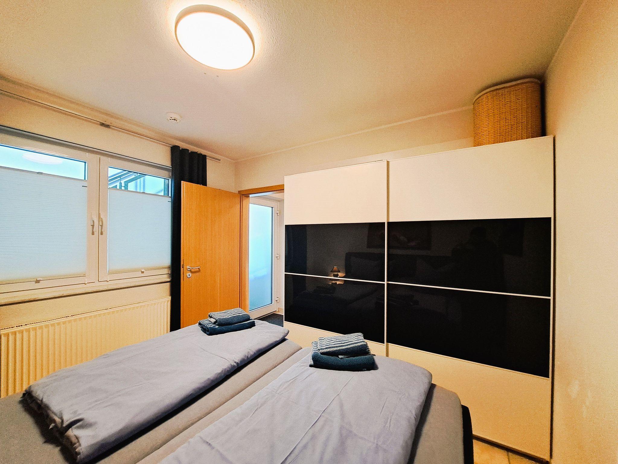Die Ferienwohnung bietet Ihnen ein Wohnzimmer mit Couchlandschaft, FlachTV und integrierter Einbauküche mit Esstisch und Zugang zur Terrasse. Das Schlafzimmer mit Doppelbett, Nachttischen und Leselampe verfügt über einen zweiten FlachTV. Das Tageslicht-Badezimmer mit befahrbarer Dusche, Waschtisch und WC hat eine Halterung an der rechten Toilettenseite. Die Wohnung ist rollstuhlfreundlich, da barrierefrei. WLAN steht Ihnen kostenfrei zur Verfügung.