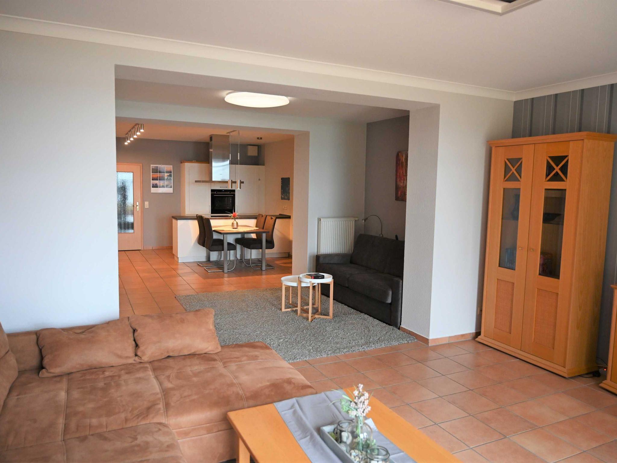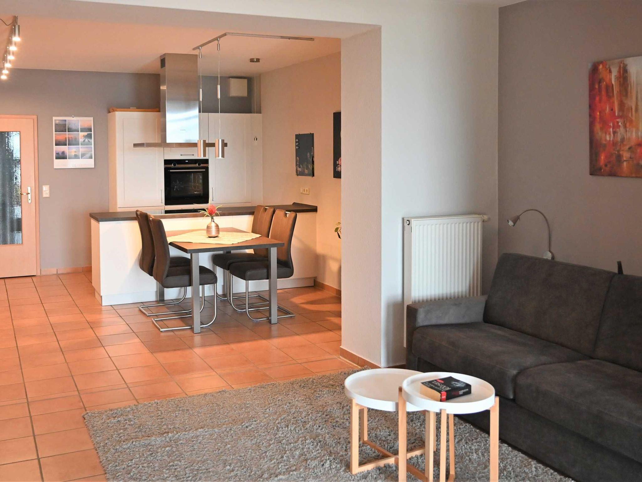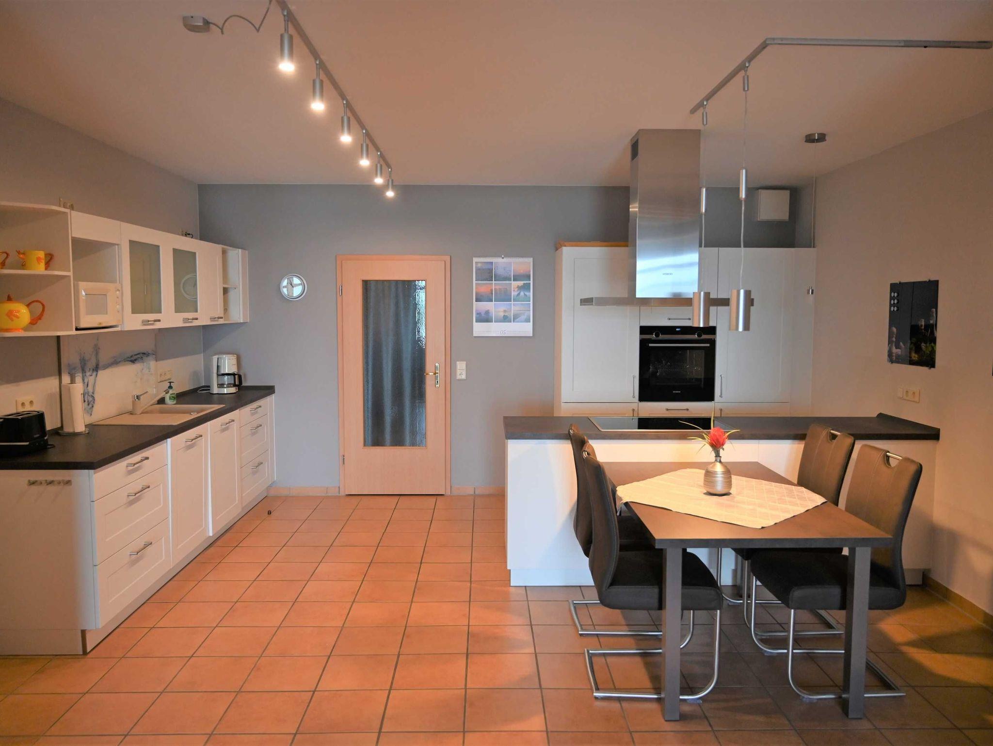 Die große Ledercouch und die Möbel in heller Buche sowie ansprechende Dekorationen geben der Ferienwohnung ein Ambiente, in dem Sie sich wohlfühlen werden. Die Küche ist neu und komplett mit Geschirrspüler, Induktionskochfeld und Backofen ausgestattet.