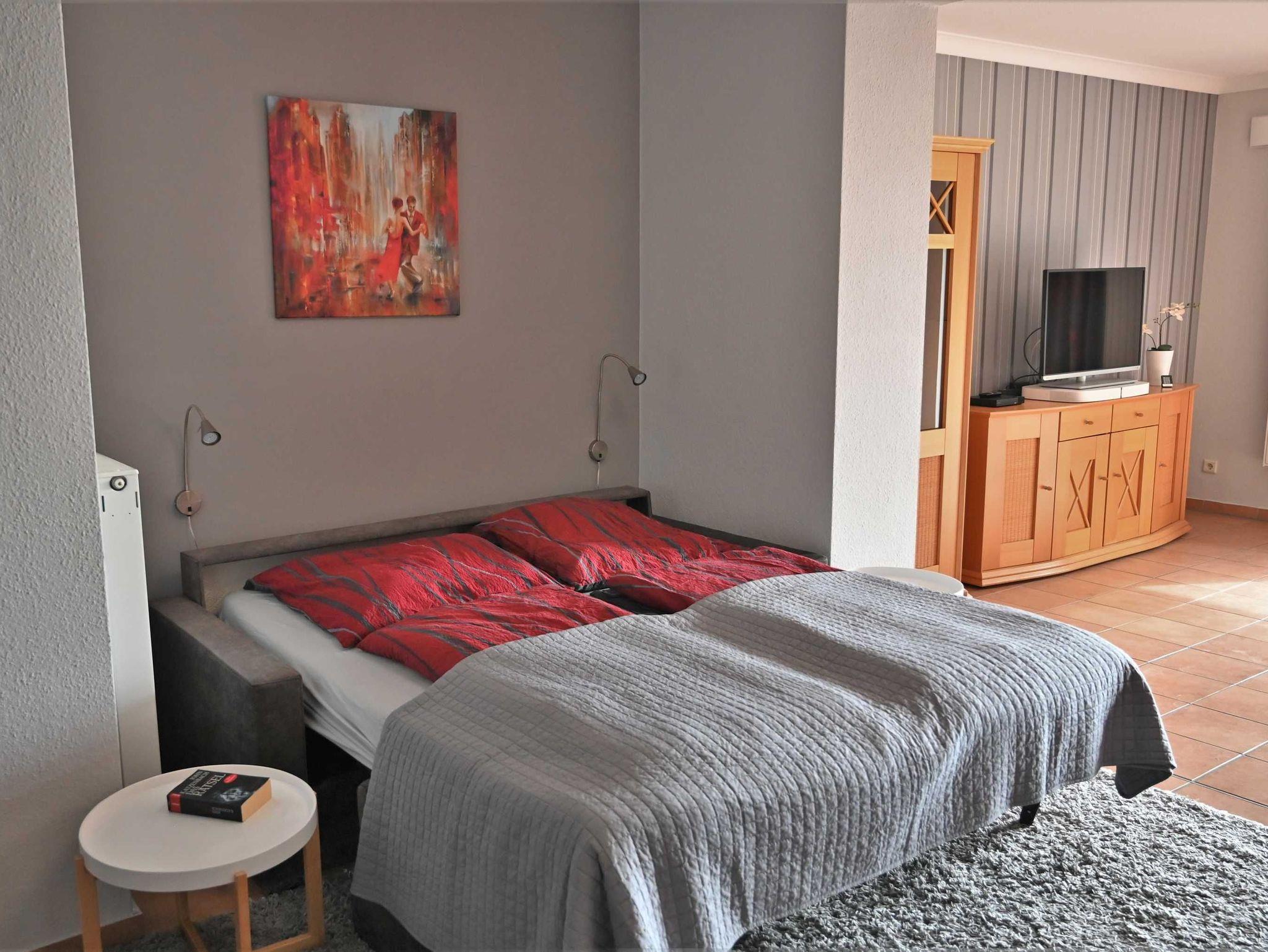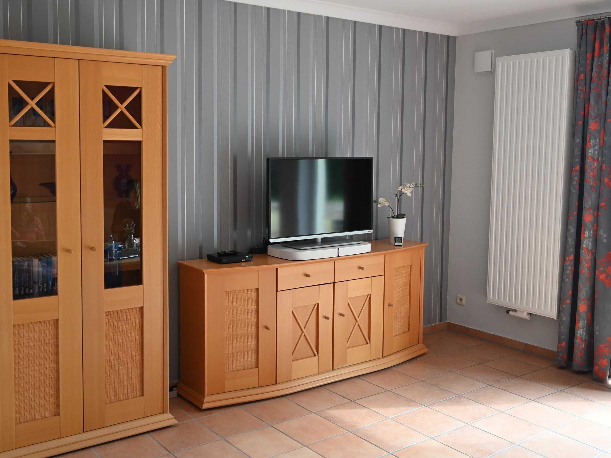 Im Wohnbereich gibt es einen Flachbildfernseher und einen Blu-Ray Player. Die Couch im Mittelteil zwischen Küche und Wohnzimmer kann zu einem vollwertigen Bett (170cm breit) ausgeklappt werden. Mit einer Gardine kann dieser Bereich auch von der Küche abgetrennt werden.