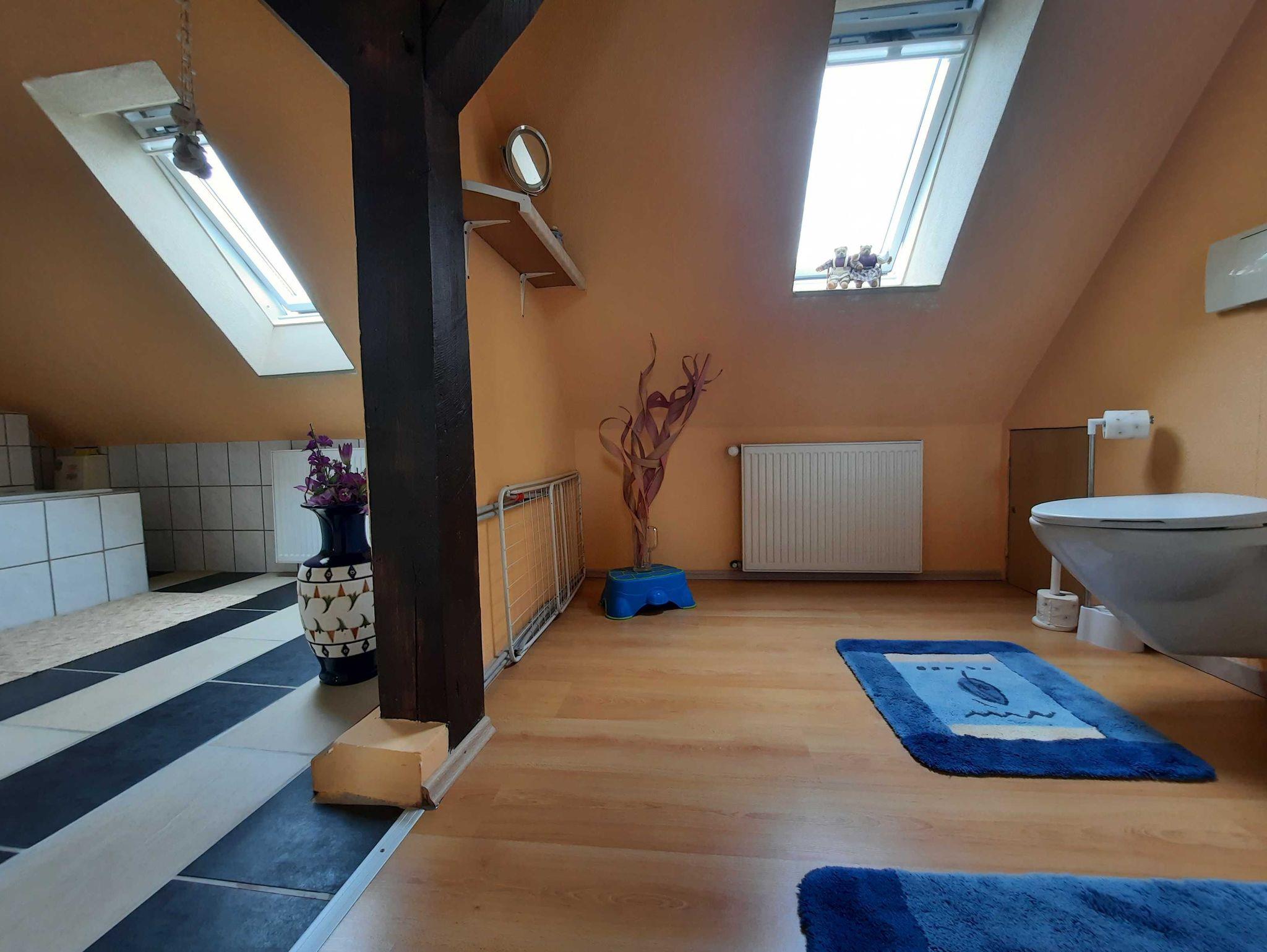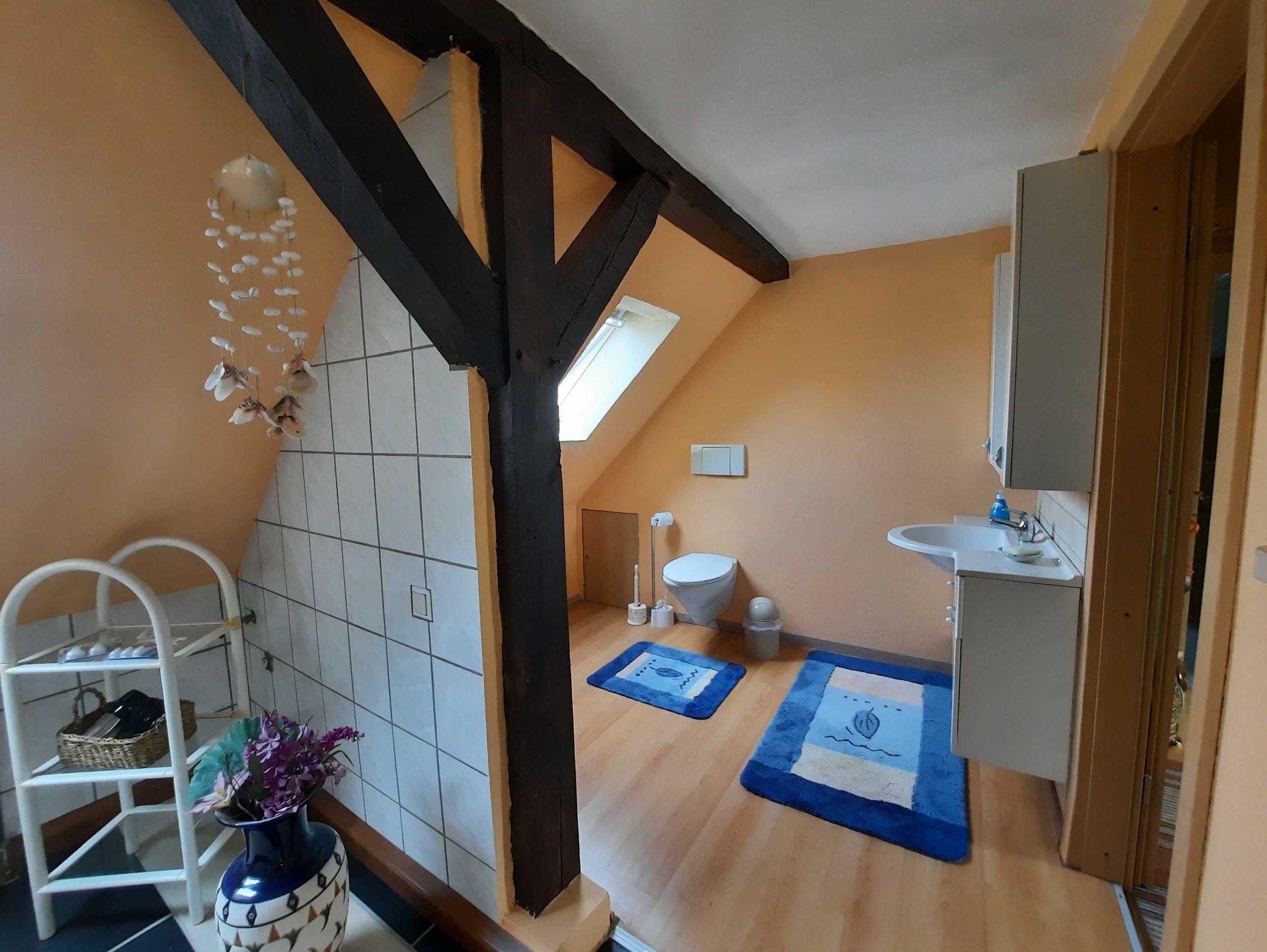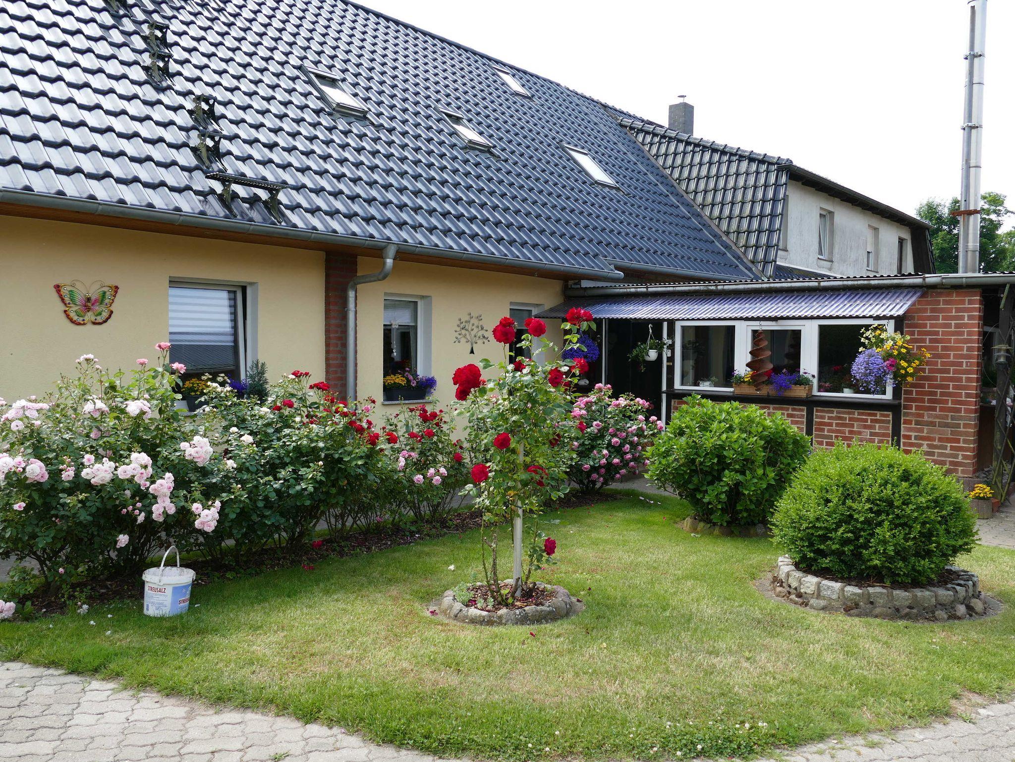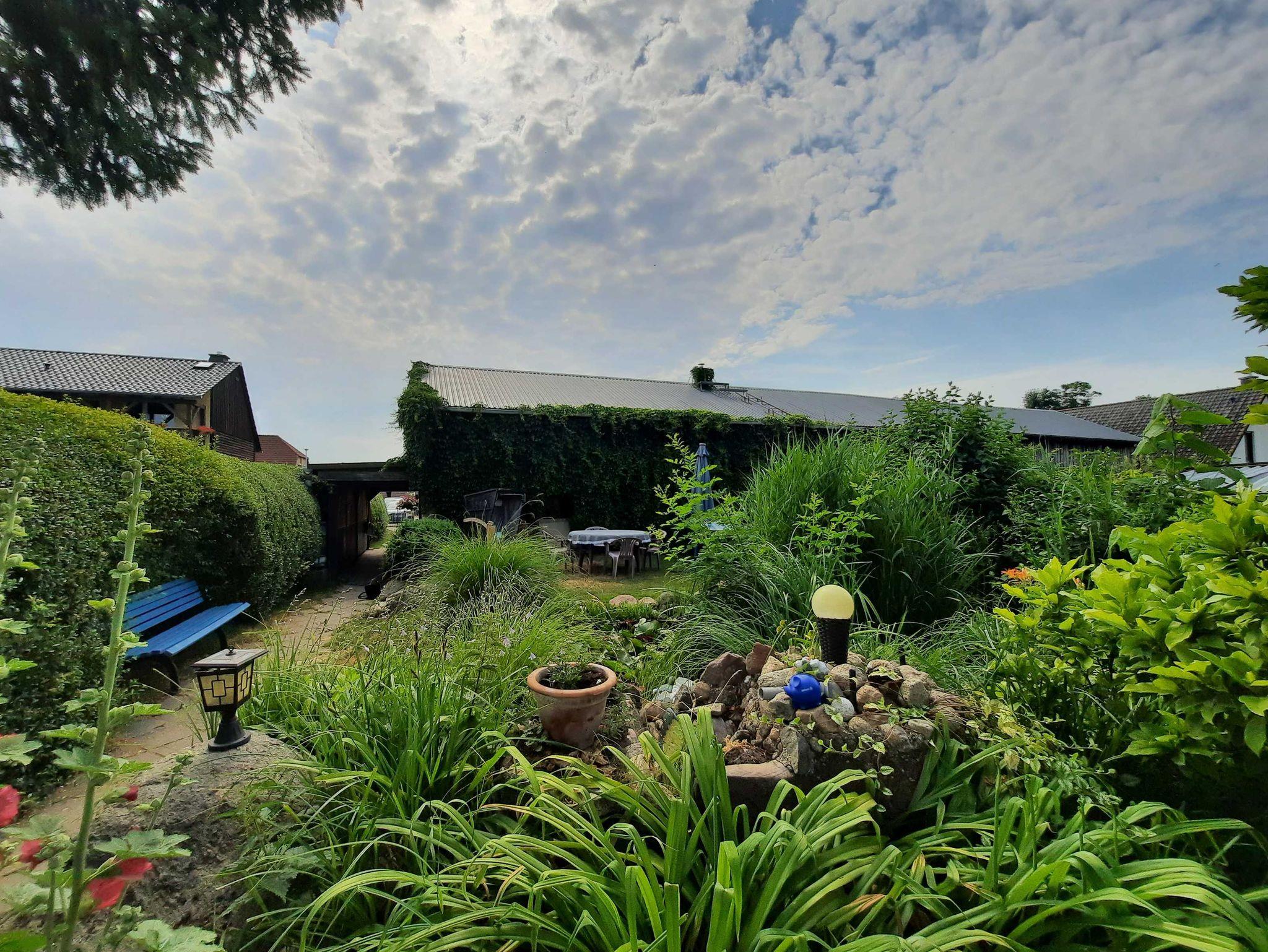 Die Ferienwohnung befindet sich im 1. Obergeschoss (=Dachgeschoss) im Haus der Vermieter. Auf dem Grundstück können PKW und mitgebrachte Räder ab- und untergestellt werden. Das weitläufige Grundstück bietet ausser Ruhe und Natur auch einen blumigen Garten mit Teich und einer Sitzecke mit Strandkorb und Grill, der für die Gäste alleine zur Verfügung steht. Der Teich ist nicht umzäunt. Zur Familie gehört eine 11jährige liebevolle Hündin.