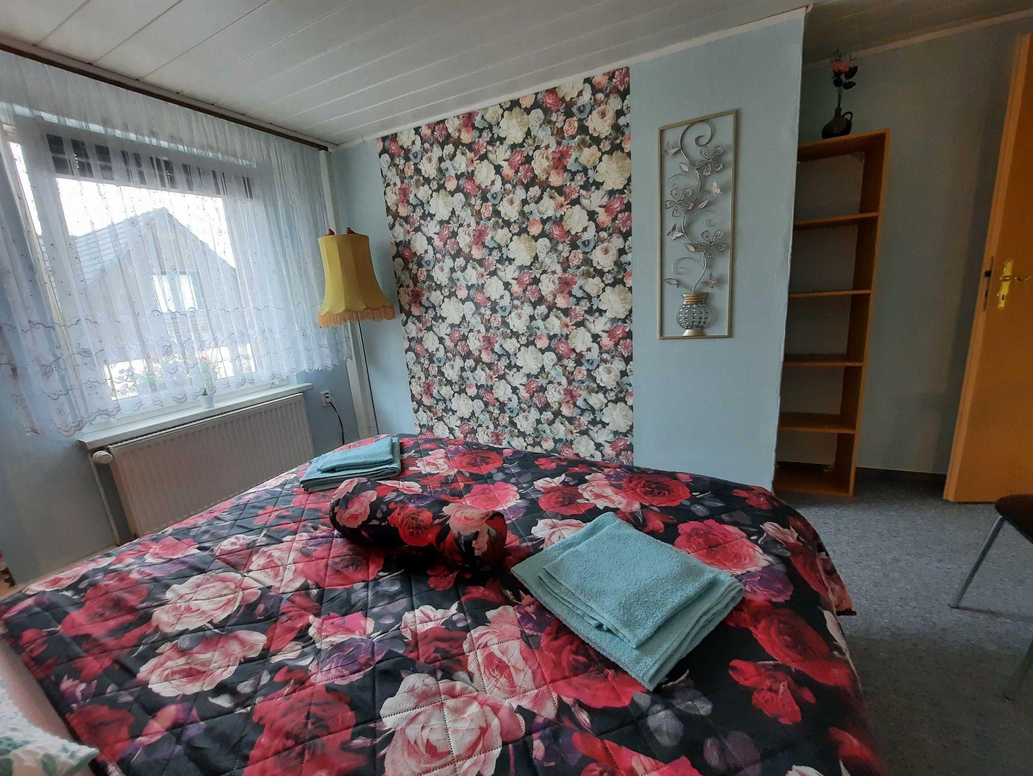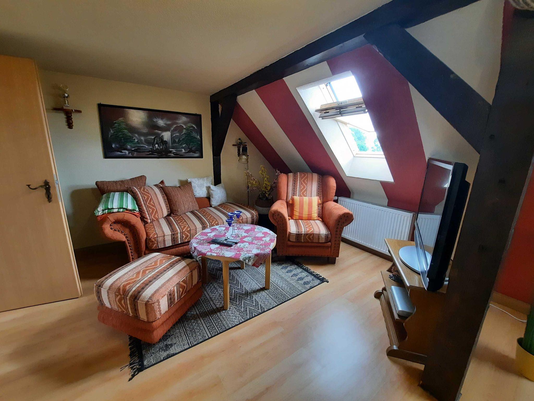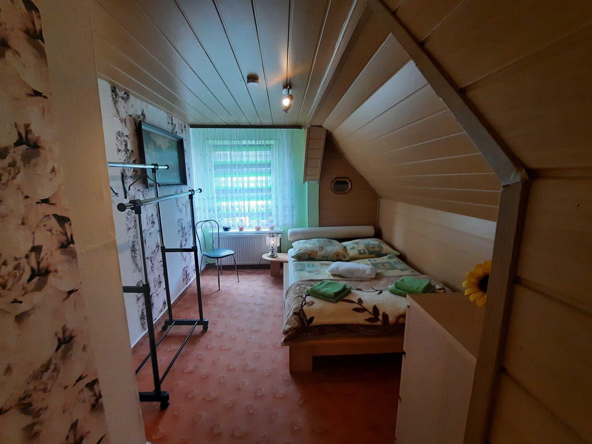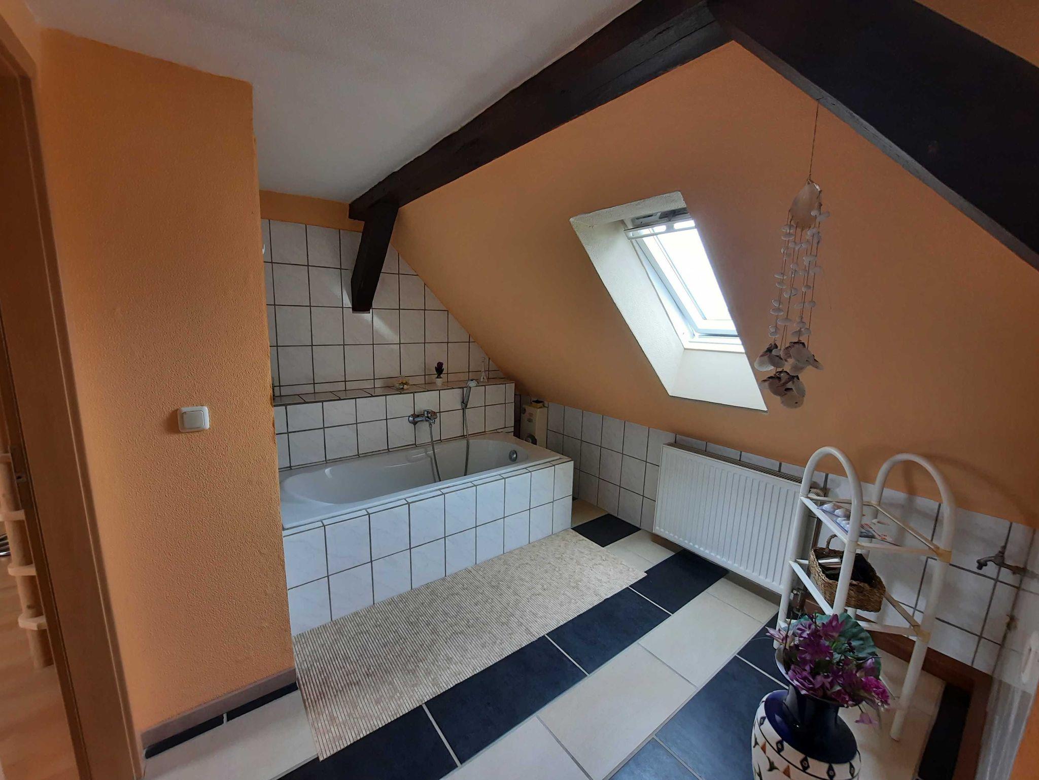 Die Ferienwohnung befindet sich im 1. Obergeschoss (=Dachgeschoss) im Haus der Vermieter. Auf dem Grundstück können PKW und mitgebrachte Räder ab- und untergestellt werden. Das weitläufige Grundstück bietet ausser Ruhe und Natur auch einen blumigen Garten mit Teich und einer Sitzecke mit Strandkorb und Grill, der für die Gäste alleine zur Verfügung steht. Der Teich ist nicht umzäunt. Zur Familie gehört eine 11jährige liebevolle Hündin.