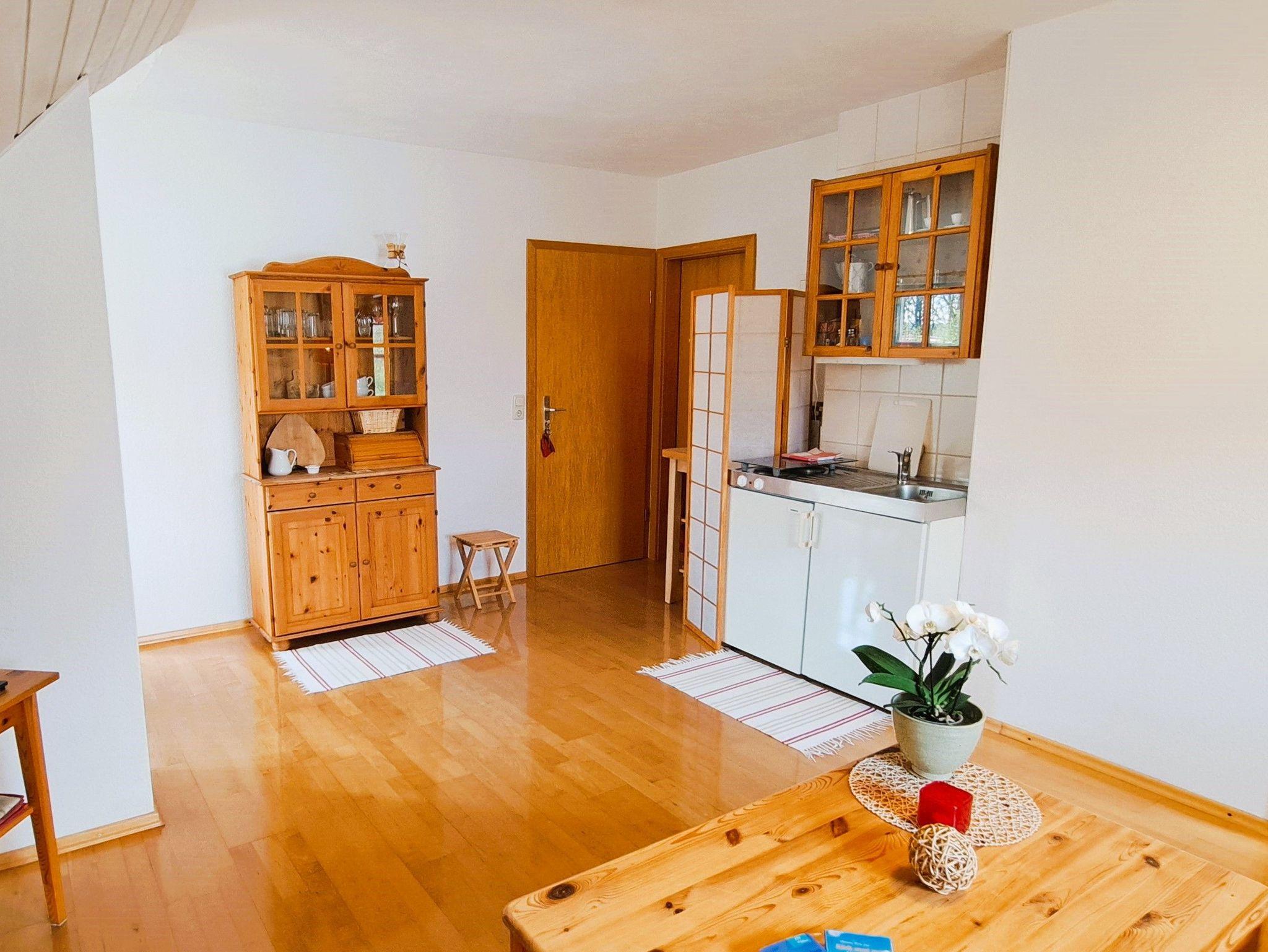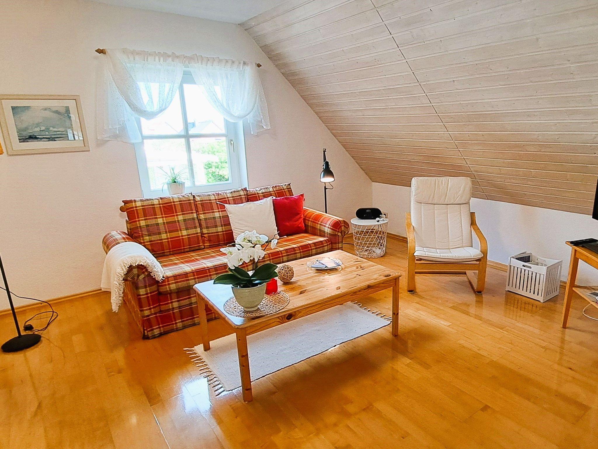 Die Ferienwohnung im 1. Obergeschoss bietet Ihnen ein großzügiges Wohnzimmer mit Couch und FlachTV, kleiner Pantrykochmöglichkeit, Essecke und Zugang zum Balkon. Das gemütliche Schlafzimmer mit Dachschrägen ist mit einem Doppelbett, Nachttisch, Leselampe und Kleiderschrank ausgestattet. Das Tageslicht-Badezimmer verfügt über eine Dusche und ein WC. Die Ausstattung ist gemütlich, hell und freundlich.