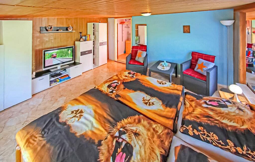 Det ene af to særskilt beliggende feriehuse i udhus på ejerens 1200 kvadratmeter store boligejendom med rolig beliggenhed i bydelen Eldenholz. Det er omkring 2 km til centrum af Waren. 1-værelses ferielejligheden er udstyret med kombineret stue/soveværelse (polstrede møbler, fladskærms-tv, radio/cd, dobbeltseng, nogle med gæsteseng), køkken (el-komfur, køleskab med fryser, mikroovn, div. køkkenmaskiner), bad/WC. Loftshøjden i stue/soveværelse falder fra ca 2,00 m til ca 1,90 m. Der er møbleret terrasse, grill, cykelkælder og parkeringsplads til rådighed.Den samlede pris inkluderer håndklæder, vand- og energiforbrug samt slutrengøring. Varer er pålagt turistskat. Medbring venligst dit eget sengetøj.