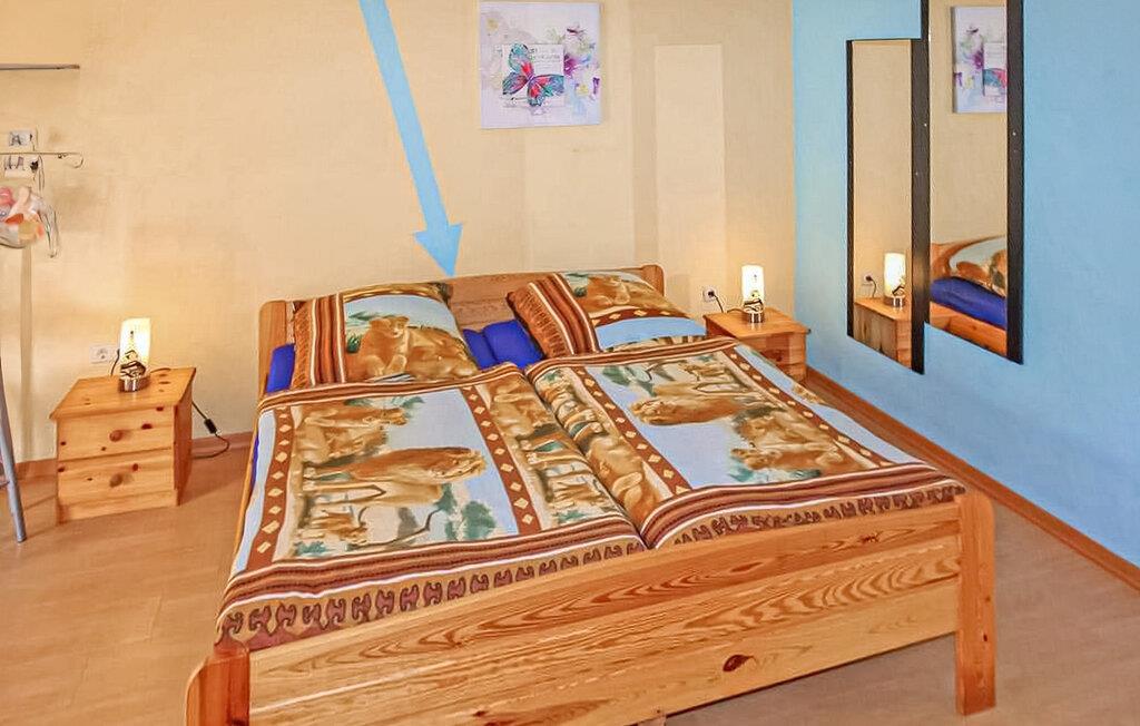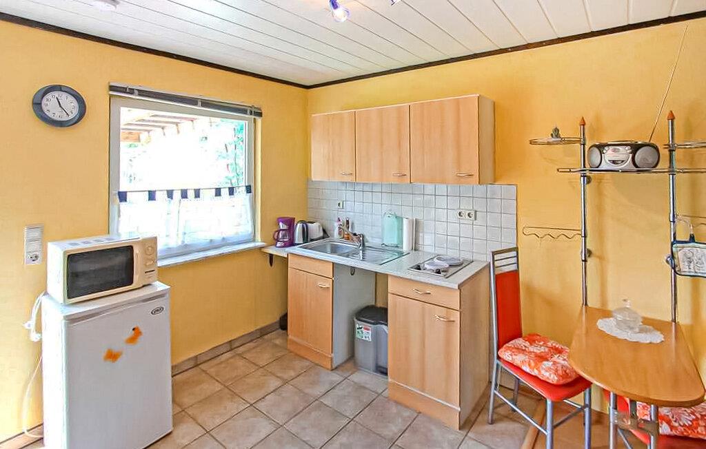 Det ene af to særskilt beliggende feriehuse i udhus på ejerens 1200 kvadratmeter store boligejendom med rolig beliggenhed i bydelen Eldenholz. Det er omkring 2 km til centrum af Waren. 1-værelses ferielejligheden er udstyret med kombineret stue/soveværelse (polstrede møbler, fladskærms-tv, radio/cd, dobbeltseng, nogle med gæsteseng), køkken (el-komfur, køleskab med fryser, mikroovn, div. køkkenmaskiner), bad/toilet. Der er en møbleret terrasse, grill, cykelkælder og parkeringsplads til rådighed. Den samlede pris inkluderer håndklæder, vand- og energiforbrug samt slutrengøring. Varer er pålagt turistskat. Medbring venligst dit eget sengetøj.