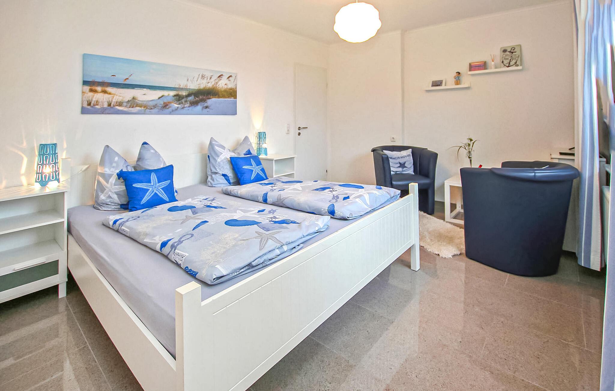 Med egen strand, beliggende direkte ved Müritz og i et roligt boligområde, ligger ejerens separate ferielejlighed til to personer på den cirka 1.500 kvadratmeter store indhegnede vandgrund i hans hus. Den gamle bydel i Waren (Müritz) med butikker, restauranter og caféer, forskellige seværdigheder samt udflugter og bådture ligger omkring 15 minutters gang væk. Den cirka 37 kvm, smagfuldt indrettede ikke-ryger lejlighed (rygning tilladt udendørs) med udsigt over søen ligger i stueetagen og har et kombineret opholds- og soveområde (dobbeltseng, opholdsområde med lænestole, fladskærms-tv), et åbent køkken (El-komfur med ovn, køleskab, mikroovn, spiseplads, diverse små køkkenmaskiner), et badeværelse (bruser, toilet, hårtørrer) og en gang med et stort klædeskab. Lejligheden er centralvarme (køkken og badeværelse gulvvarme) og er udstyret med insektbeskyttelse på vinduerne. Derudover har gæsterne adgang til parkeringsplads, cykelkælder, WiFi og forskellige sidde- og solbademuligheder, grillplads og privat strand på den rummelige, velholdte ejendom. Den samlede pris inkluderer slutrengøring, energi- og vandomkostninger samt sengelinned og håndklæder. Betales på stedet: spaskat. Kæledyr er ikke tilladt i denne ejendom. Det statsanerkendte kurbad Waren (Müritz) ligger i charmerende omgivelser direkte ved søen af samme navn, den største indsø i Tyskland. Det er også turistcentret i Mecklenburg Lake District.Attraktioner omfatter den historiske gamle bydel, havnen med passagerskibe, den tilstødende promenade og talrige spisemuligheder samt Müritzeum, et naturoplevelsescenter med et kæmpe ferskvandsakvarium og udstillinger om bl.a. flora og fauna i sødistriktet.I landsbyen er der også udendørs swimmingpools, båd- og cykeludlejning, surf- og sejlerskoler og mange indkøbsmuligheder. Waren er indgangsporten til Müritz Nationalpark, som nemt kan udforskes via det veludviklede cykelstinetværk (også i kombination med passagerbåden). Motorvejsforbindelse ca 25 km.