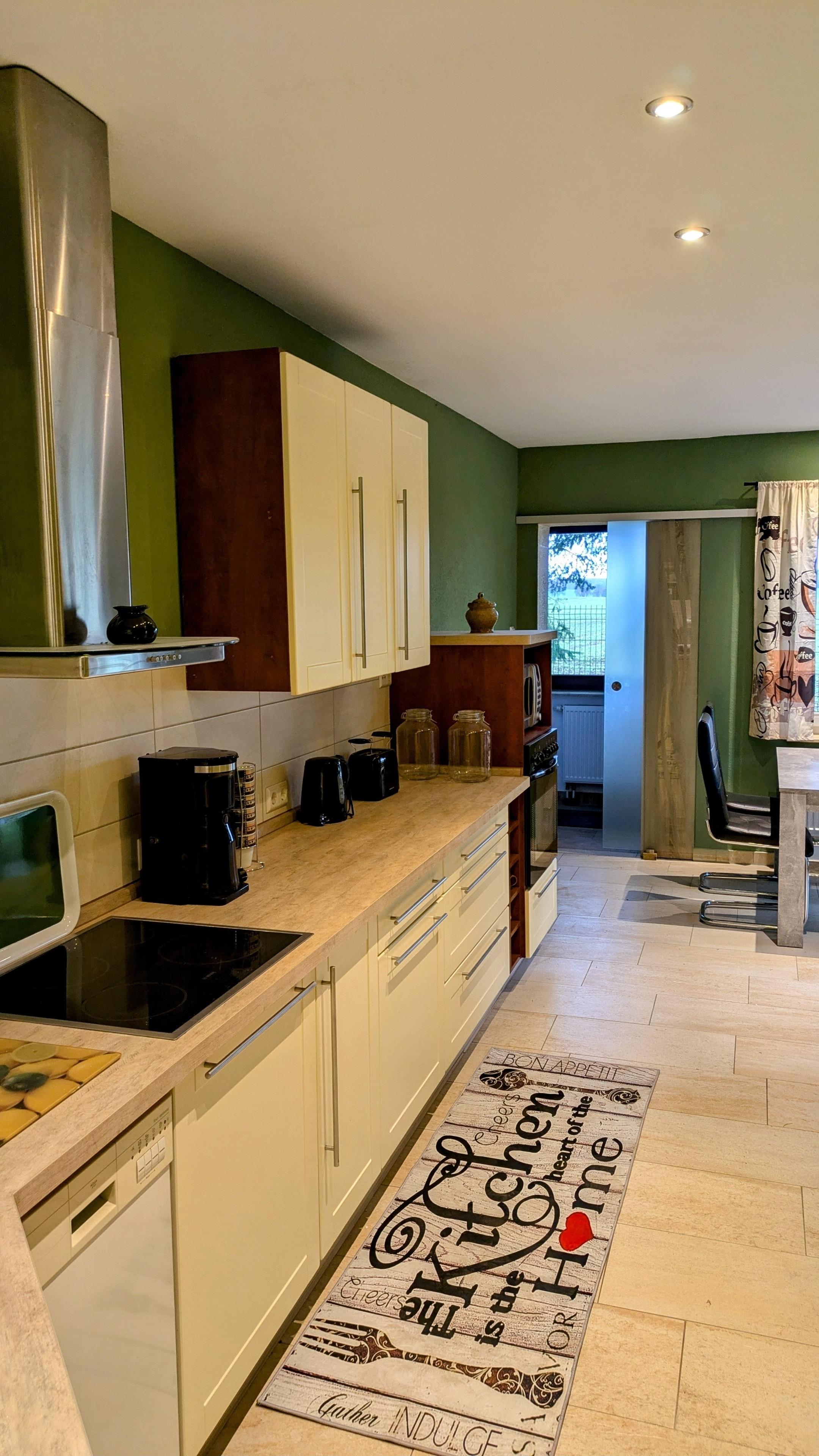 Die Küche ist sehr geräumig mit freiem Blick in die Natur und Zugang zur Terasse .