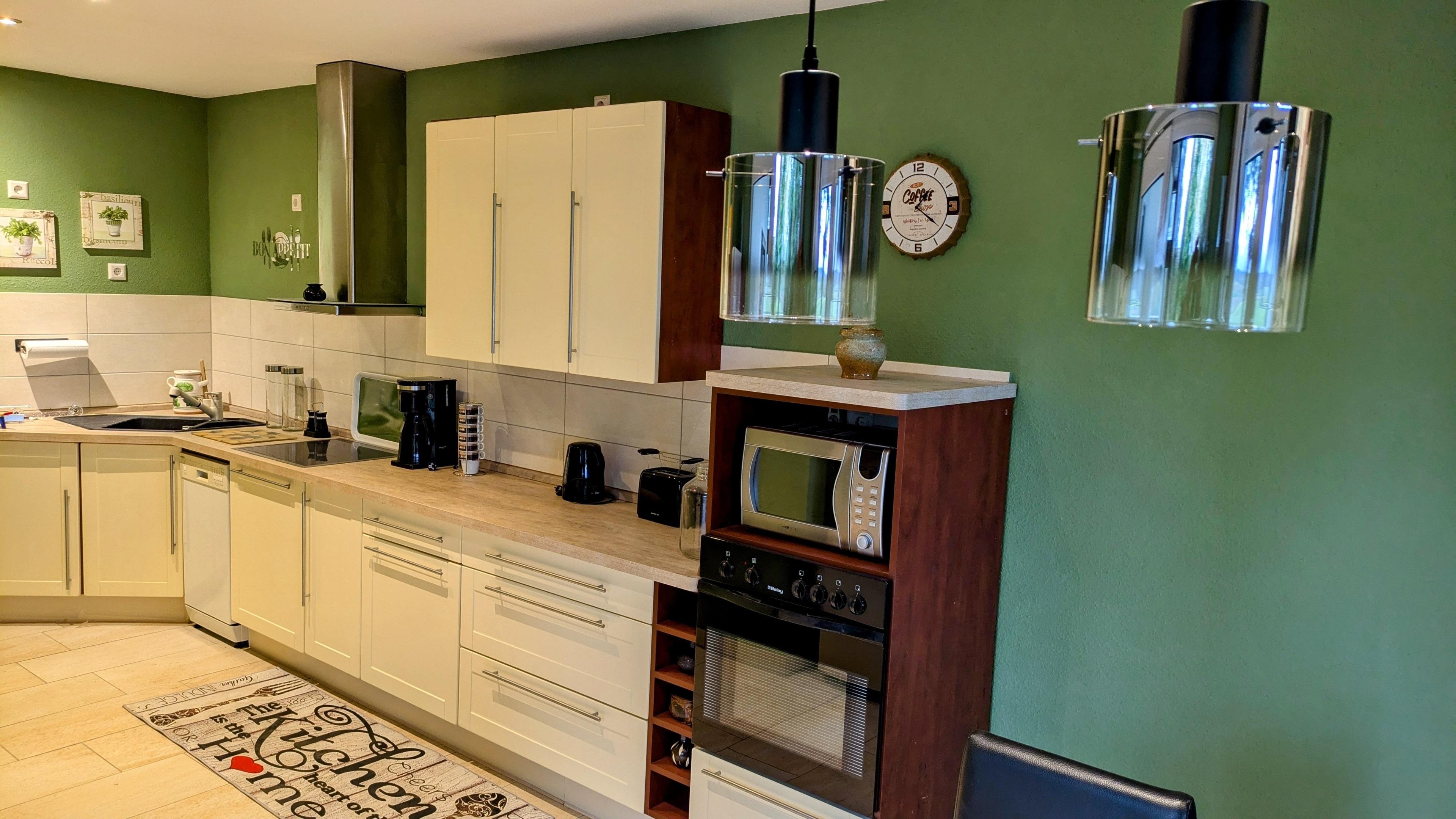 Die Küchen - Austattung ist mit modernen Küchengeräten und mit sehr reichlich Geschirr / Besteck versehen .