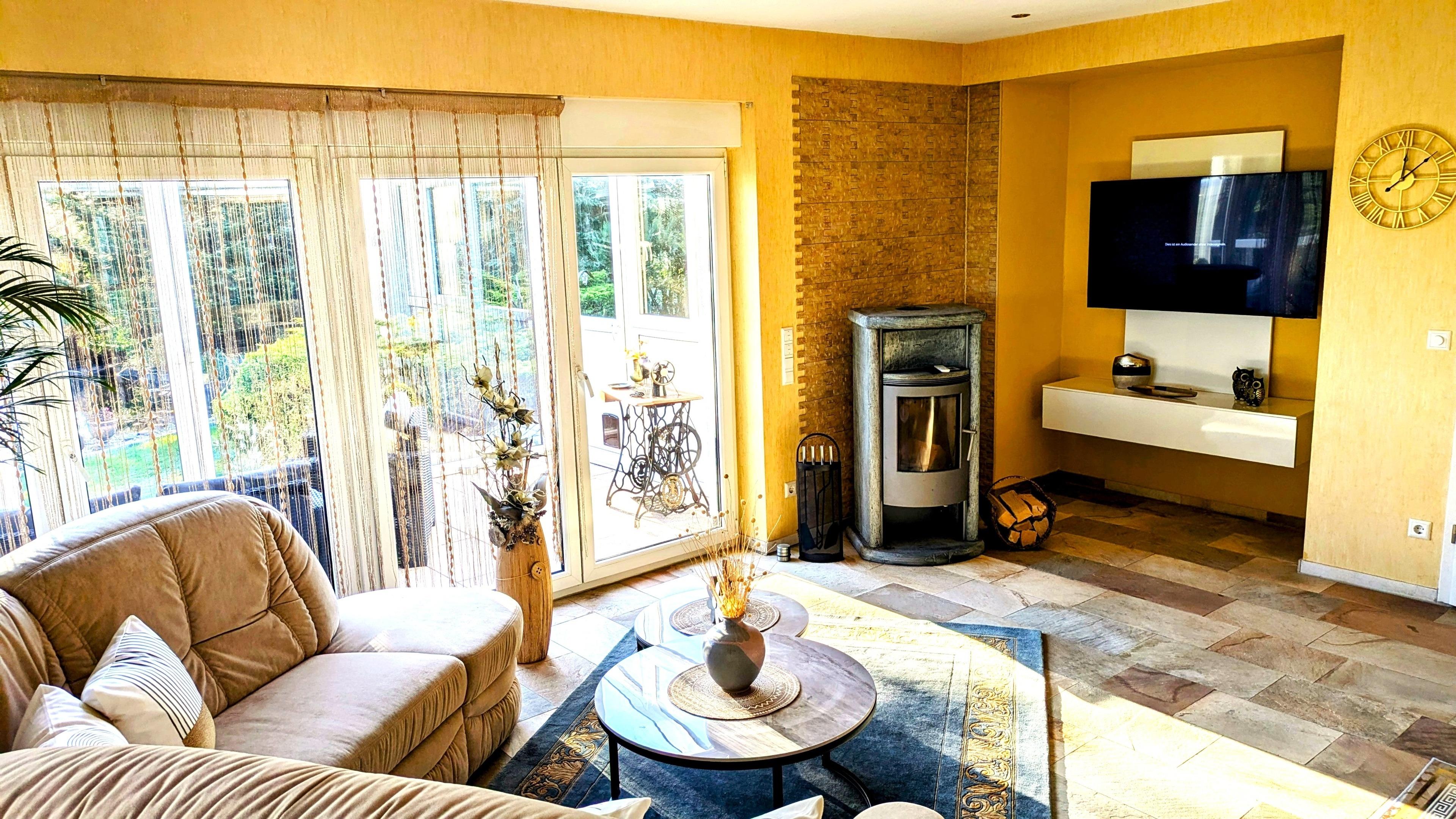 Das Wohnzimmer hat freie Sicht auf die umgebende Landschaft , ist ausgestattet mit großer Sitzecke , 55 Zoll LED - Fernseher und Kamin.
