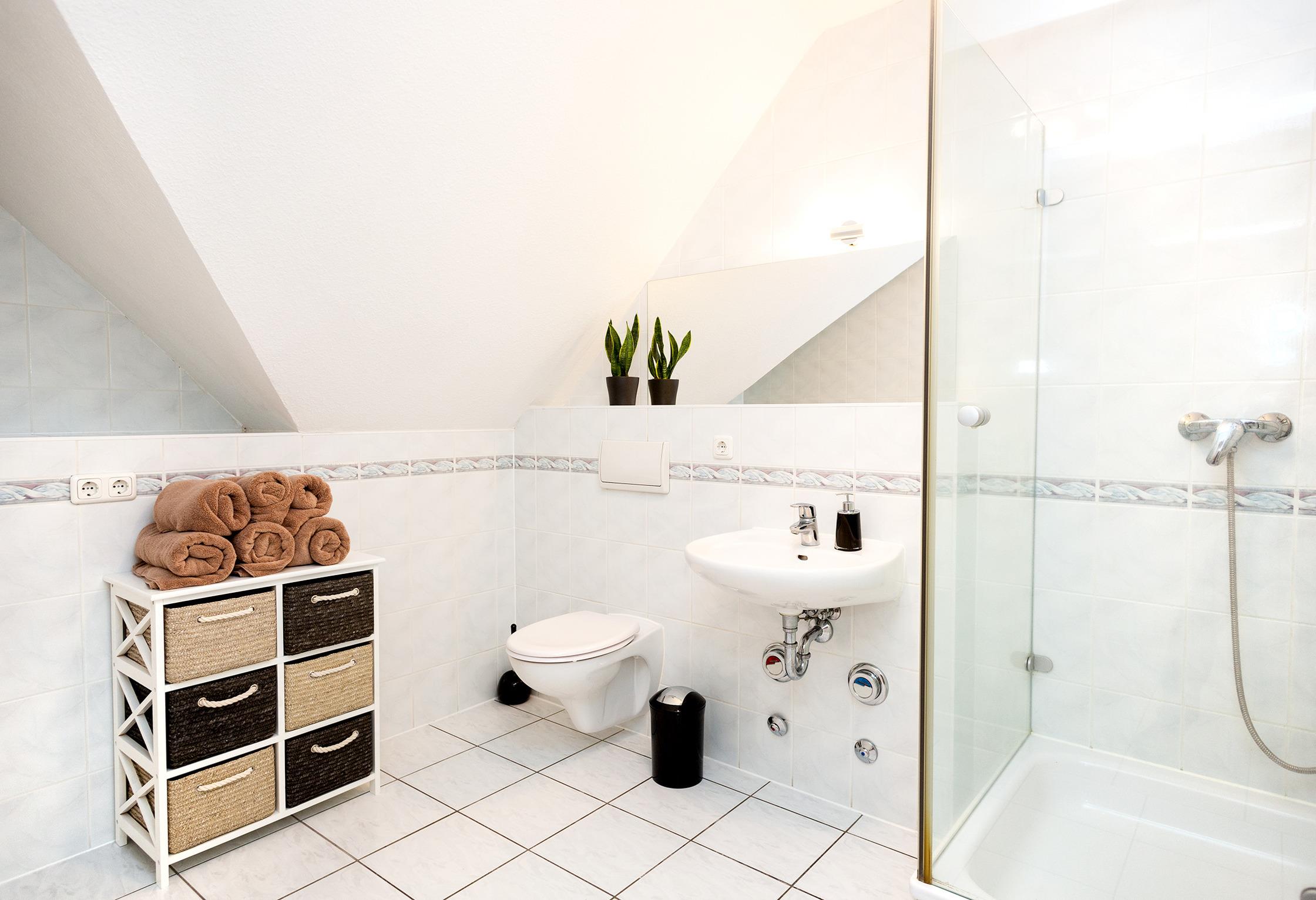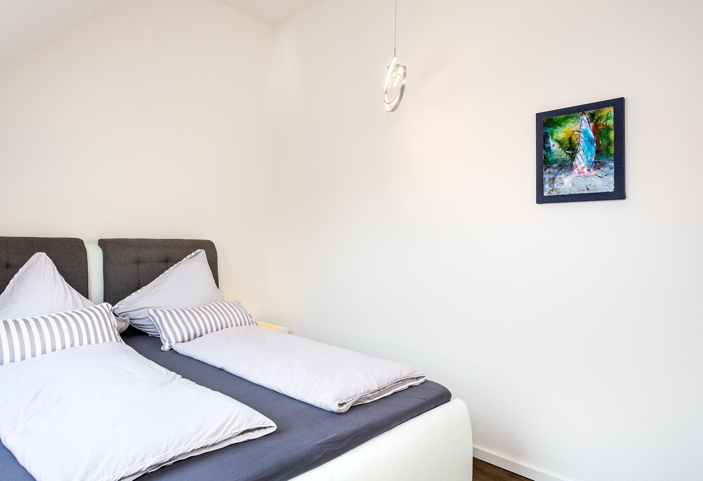 Die im Flur befindliche Treppe lässt viel Licht in den Raum und bietet den Zugang zur oberen Etage. Auf dieser Ebene findet man das zweite Schlafzimmer und ein Wannenbad mit Blick in den Himmel. In beiden Schlafzimmern ist das 5* Boxspringbett Standart. Aber auch die Aufbettungsmöglichkeit im Studio sind qualitativ sehr hochwertig. Rundum eine Wohnung, in der man gerne selbst wohnt.