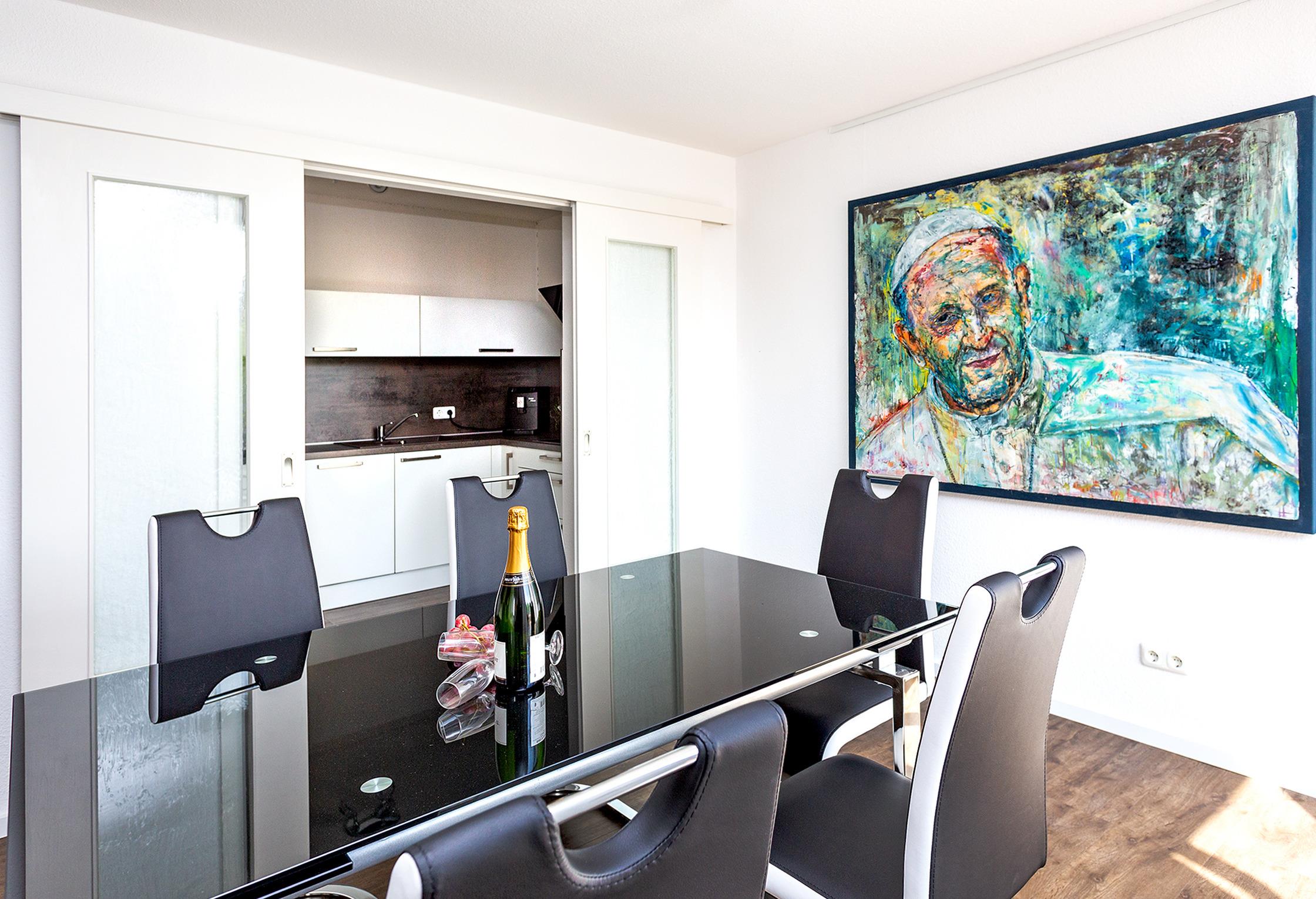 Direkt am Yachthafen von Waren, finden Sie eine einzigartige Ferienwohnung. Auf zwei Etagen verteilt ist diese Wohnung perfekt für bis zu 6 Personen geeignet. In der unteren Etage befindet sich das Duschbad sowie eines der zwei Schlafzimmer. besonders jedoch ist das Wohnzimmer mit Esstisch und hervorragender Küche, bei deren Einricht an alles gedacht wurde. Nicht nur modern, sondern durchdacht ist das Gesamtkonzept der Einrichtung. Ganz besonders sind die zwei Bilder, die von einem Künstler der Region geschaffen wurden.