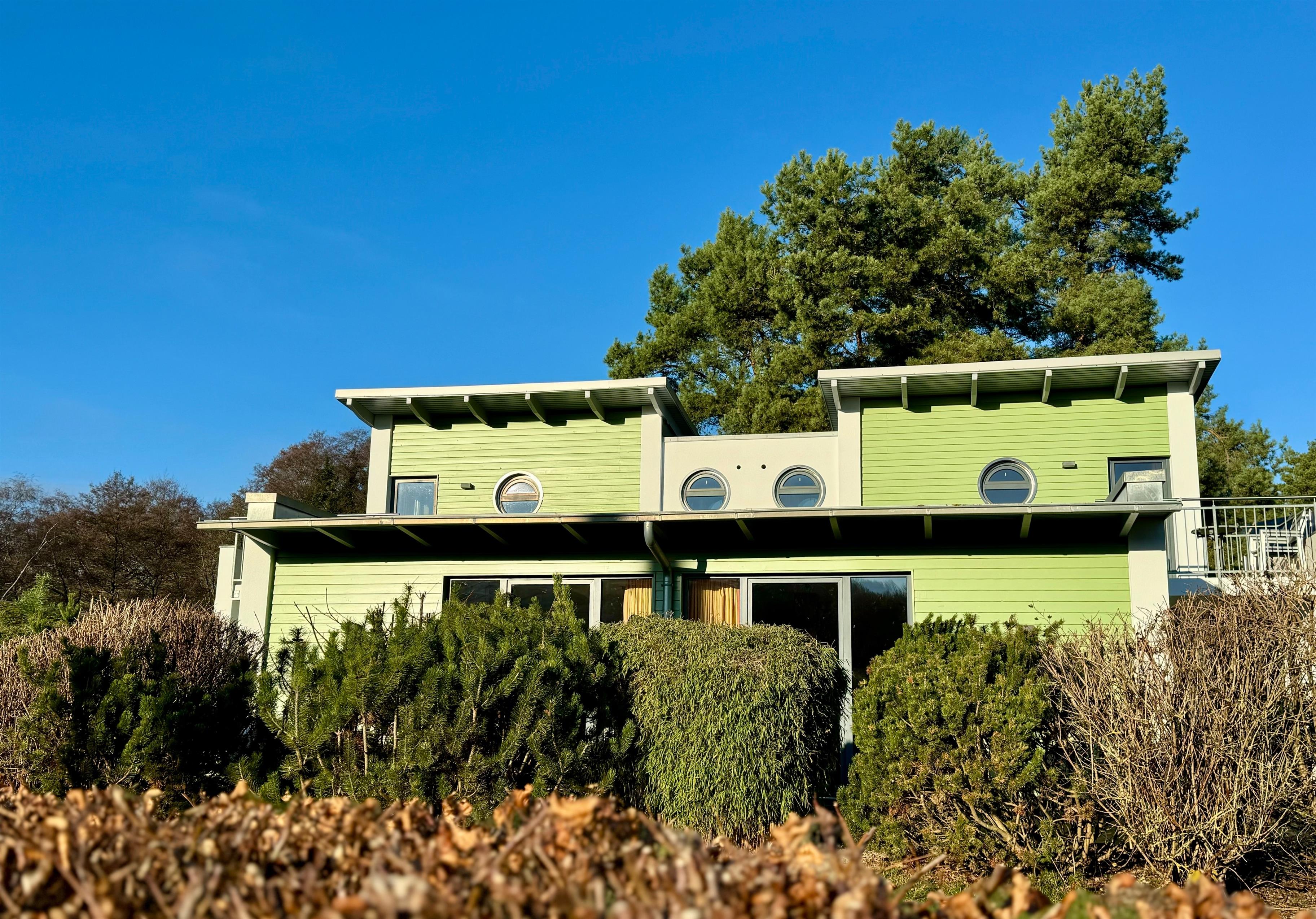 Vor dem Wohnzimmer befindet sich die möblierte Terrasse mit Esstisch, Stühlen, einer Sonnenliege und einem Sonnenschirm.