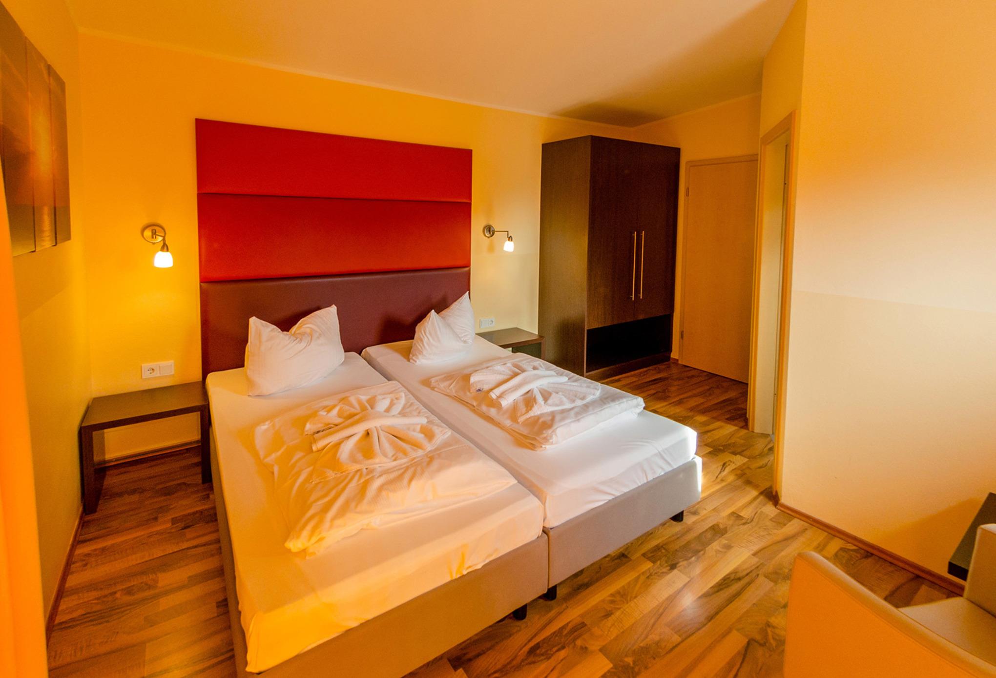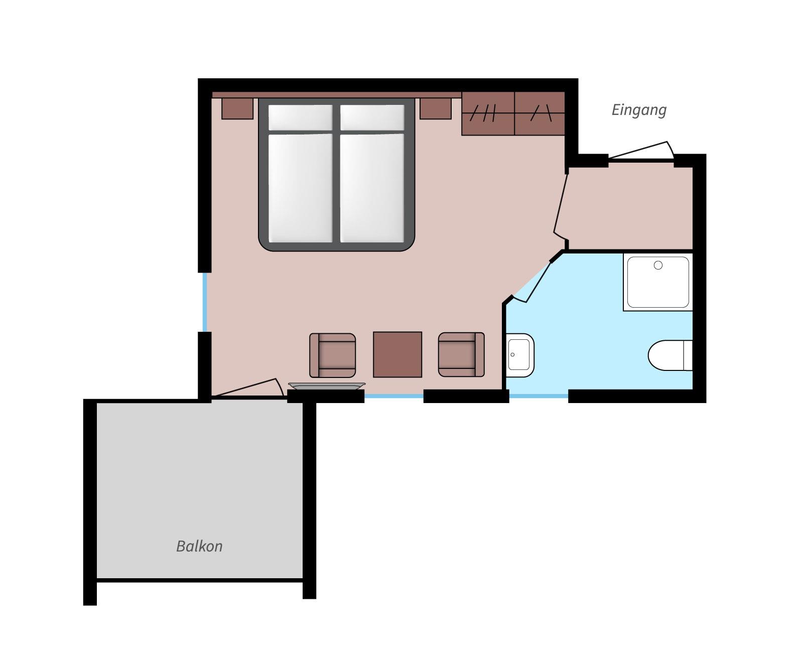 Unser Zimmer am See ist mit einem Doppelbett (trennbar), einem Kleiderschrank, zwei Sessel, einem Tisch und einem TV-Gerät eingerichtet. Das Bad hat ein WC und Dusche.