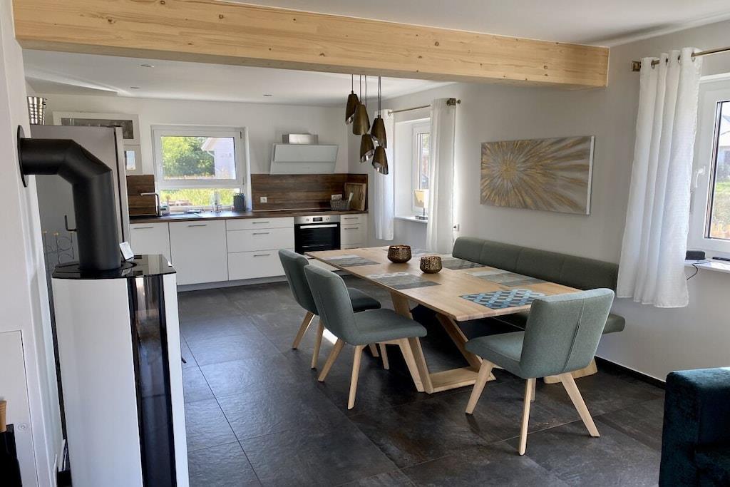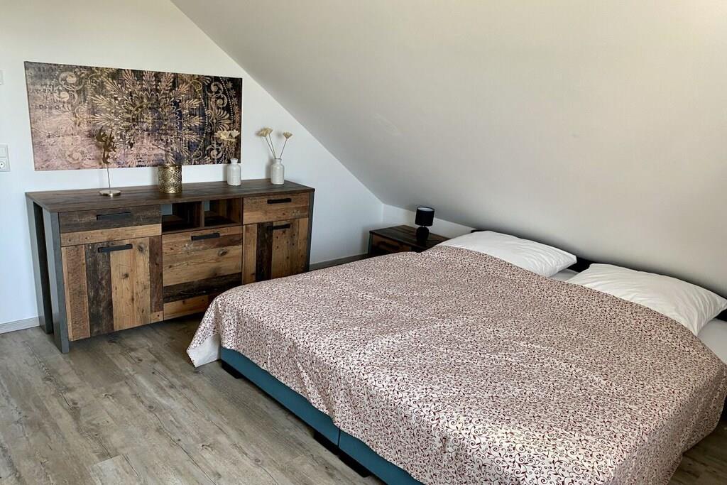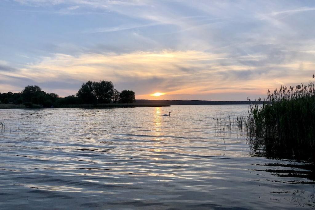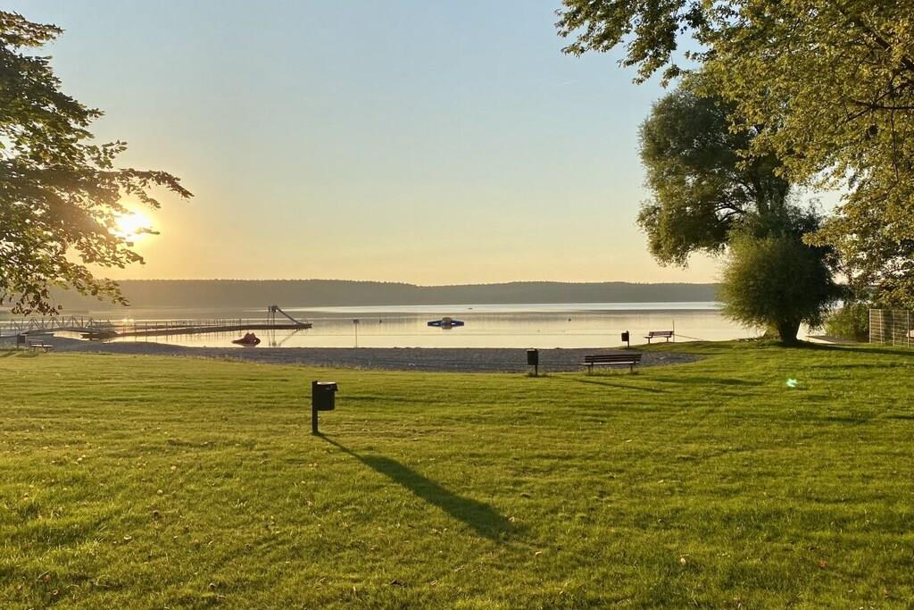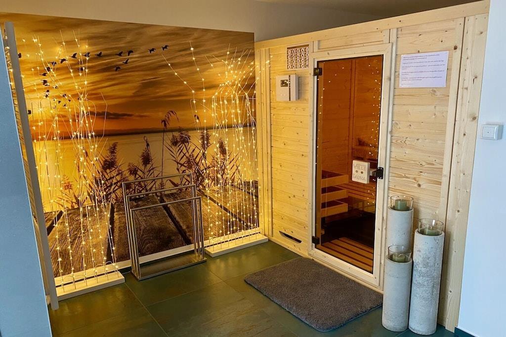 Dette træhus til 6 personer, bygget i 2021, er meget moderne og komfortabelt møbleret. Det ligger i et roligt område med udsigt til Great Wariner Lake. Det ikke-ryger hus har flise- og vinylgulv, gulvvarme og pejs. Den rummelige åbne stue-spisestue, der ikke lader noget tilbage at ønske, er forbundet med den imponerende entré. Det moderne køkken er fuldt udstyret. Du kan holde fantastiske spilleaftener ved det store spisebord. Den komfortable sofa og det store satellit-tv inviterer dig til at slappe af. Stueetagen har også et rummeligt badeværelse med bruseniche og sauna. Efter din saunatur kan du gå direkte ud på den overdækkede terrasse. Ovenpå er der tre meget smagfuldt møblerede soveværelser, hver med en dobbeltseng, samt et udsøgt badeværelse med dobbelt håndvask, bruseniche og badekar. Boxmadrasserne er 1,80 x 2,00 meter og udstyret med madrasser af høj kvalitet. To af soveværelserne har fladskærms-tv. Der er også vaskemaskine, tøjstativ, strygejern og strygebræt. Der er også brætspil og litteratur. Der er gratis Wi-Fi i feriehuset. Værterne garanterer ikke ubegrænset tilgængelighed eller tilstrækkelig hastighed. En højstol og en rejseseng er også gratis tilgængelige. Udenfor kan du nyde morgen- eller aftensolen på to terrasser – med disse ideelle faciliteter (havemøbler, grill) vil du hurtigt føle dig hjemme og falde i en ubekymret feriestemning. Privat parkering og en vægboks er placeret på ejendommen. Det tilstødende aflåselige haveskur tilbyder plads nok til opbevaring af nødvendigt udstyr, såsom cykler. En 4-personers canadisk kano med redningsveste i forskellige størrelser er gratis til rådighed. Brug sker dog på eget ansvar og uden ansvar eller garanti!