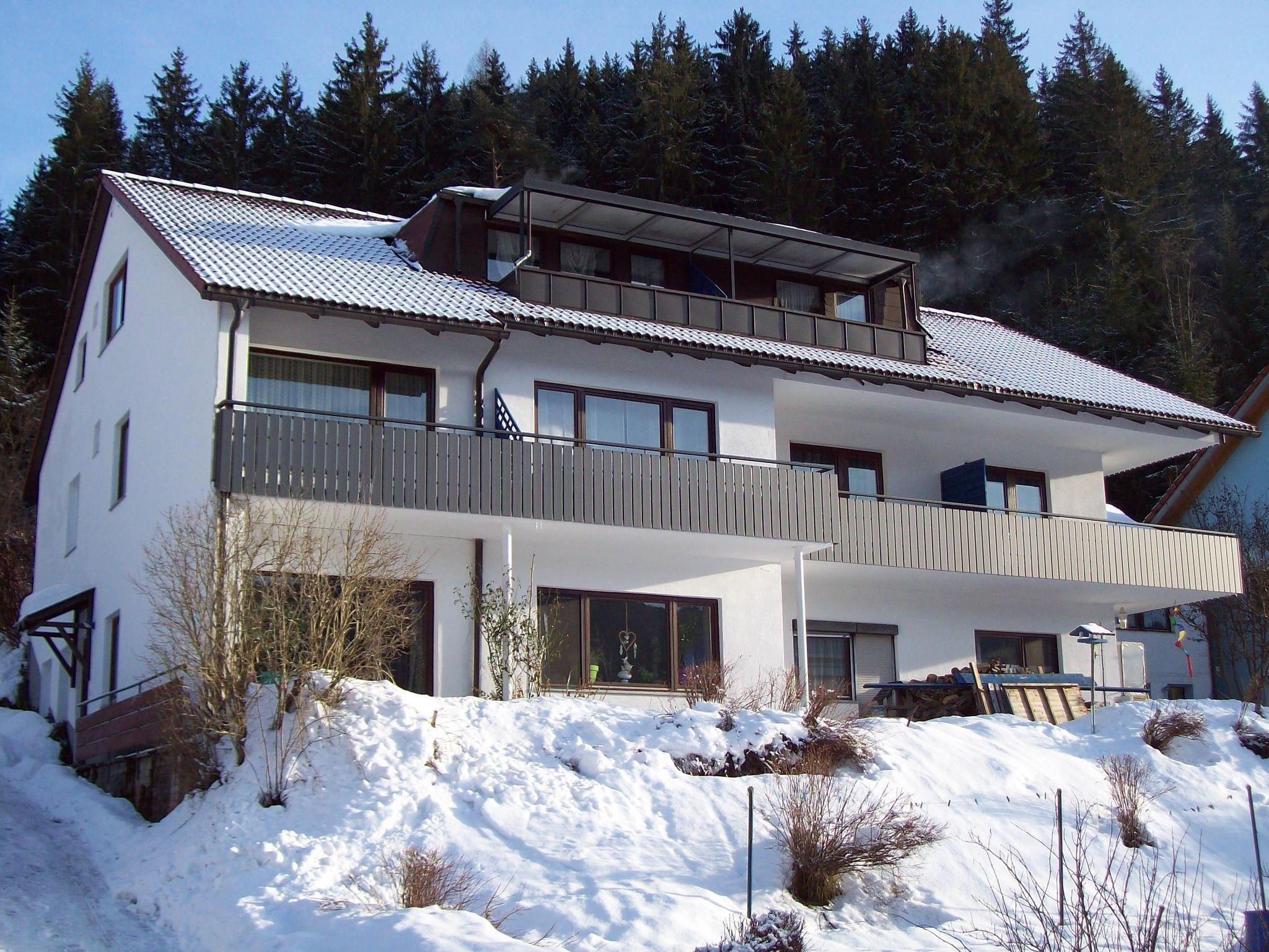 Gemütliche DG-Ferienwohnung (55 m²) mit Wohnküche, zwei getrennte Schlafzimmer, 1 Bad mit Badewanne/Dusche/WC und 1 Bad mit Dusche/WC sowie Balkon in sonniger, ruhiger Waldrandlage mit herrlichem Panorameblick, nähe Waldschwimmbad und Rundwanderwege. Kinderermäßigung auf Anfrage. Haustiere auf Anfrage: 5,00 € pro Tag.