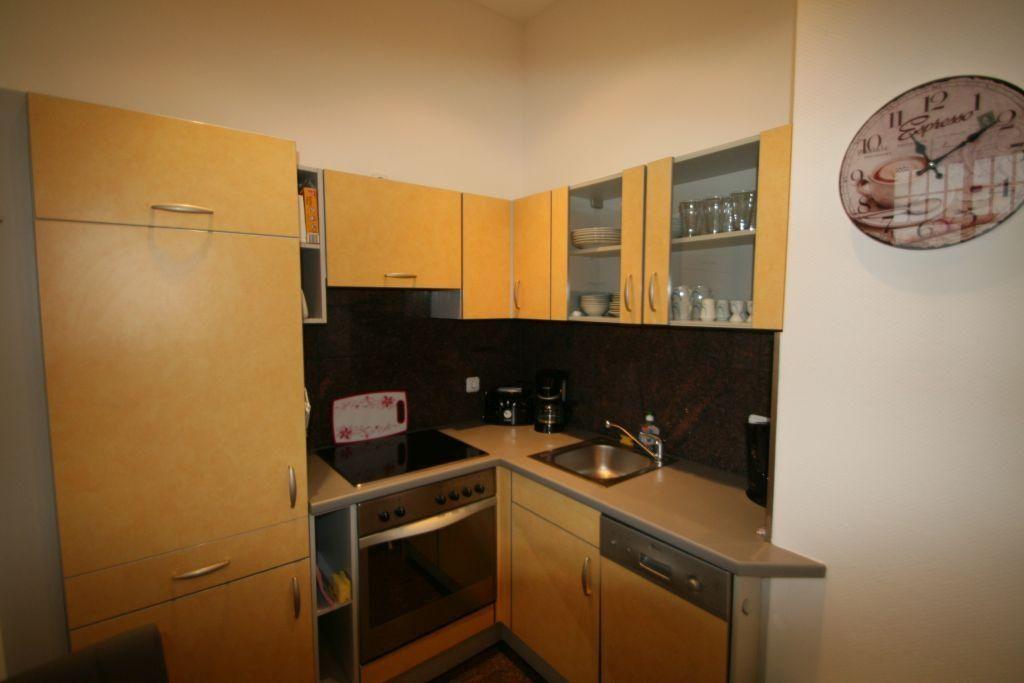 Die offene Küche verfügt über Backofen, Cerankochfeld, Kühlschrank mit Gefrierfach, Geschirrspüler, Kaffeemaschine, Wasserkocher, Toaster etc. und ist komplett eingerichtet.